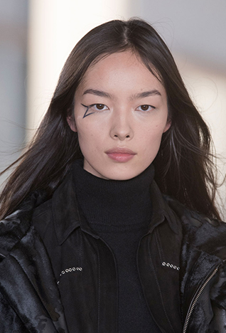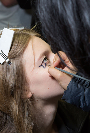 استعان خبير المكياج الشّهير توم بيشو بمجموعة فاكاريلّو لخريف 2015 كمصدر وحي لإبداع المكياج الذي تمّ استخدامه في عرض الأزياء. فقد رسم بيشو نصف نجمة هندسيّة تحتٍ عينٍ واحدة من عينيْ كلّ عارضة أزياء وخطّ أسود سميك لتحديد العيون على الجفون العليا. ولم يشمل مكياج العيون هذا أي ماسكارا أو ظلال عيون، ما سمح للمظهر بأن يتمتّع بحدّة الرّوك المميّزة. واستخدم مصفّف الشّعر أنطوني تورنر مستحضر L’Oreal Professional PLI على الشّعر بأكمله للحصول على تسريحة تتمتّع بطابع الرّوك أند رول الطّبيعي.