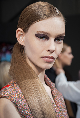أبدع المدير الإبداعي لقسم المكياج في علامة ديور بيتر فيليبس مكياج قويّ وهندسيّ الطّابع مستخدمًا ألوان خريفيّة داكنة لعرض أزياء خريف 2015.