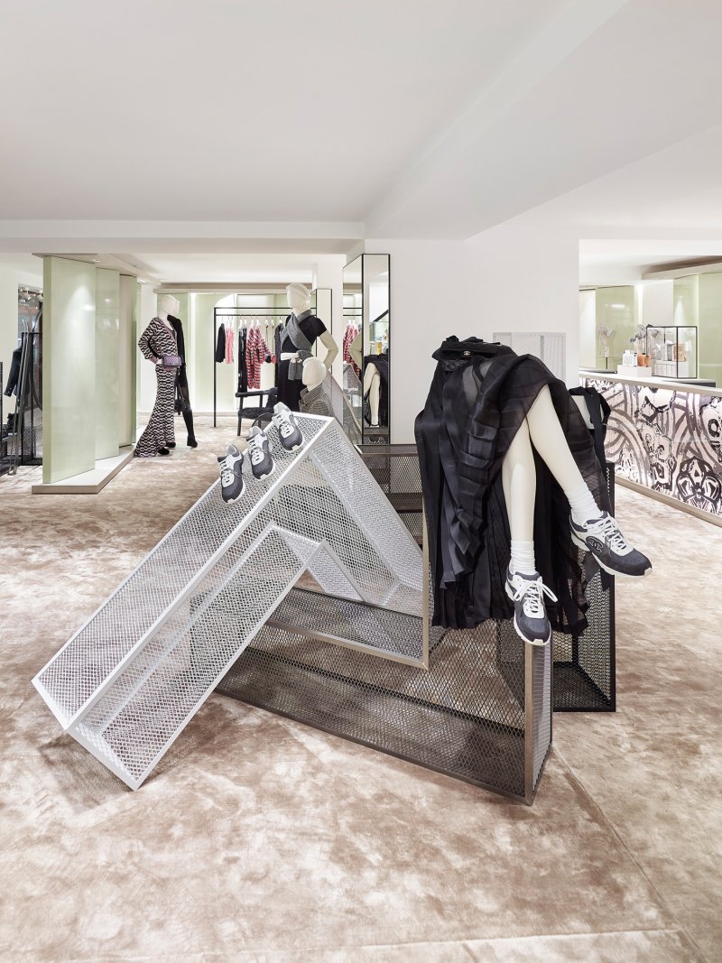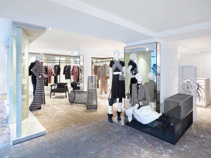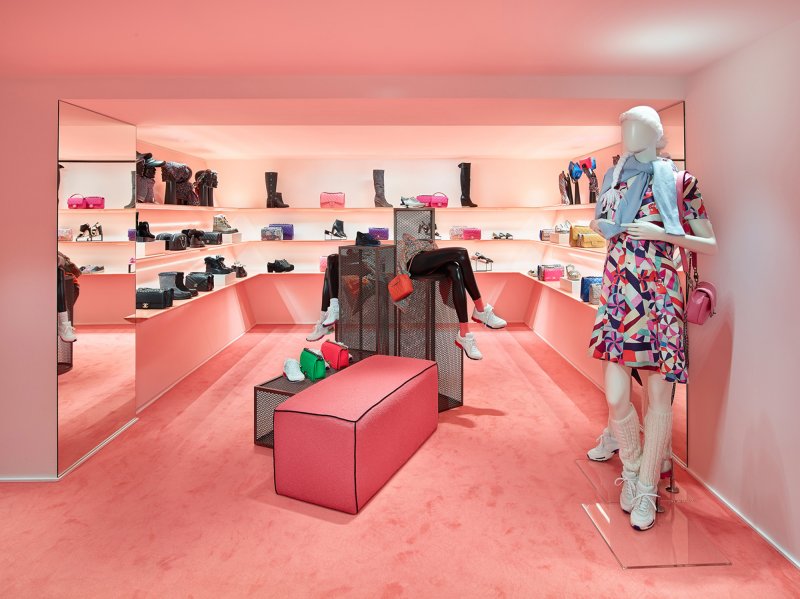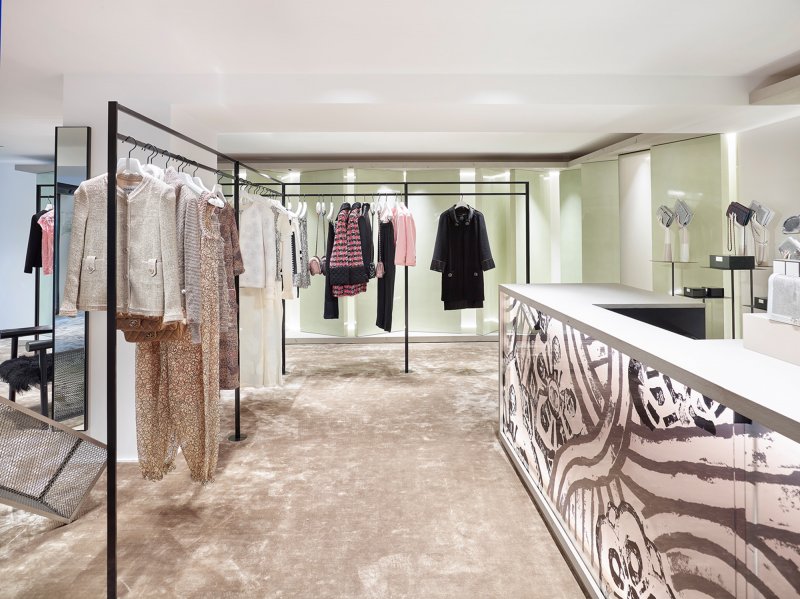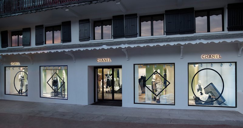 وتتضمّن بوتيك شانيل الواقعة في Courchevel مزيجًا من مواد خامّة وملمّعة؛ إنّها مكانٌ تلتقي فيه التّصاميم الماديّة بالمعادن وقماش التّول بالخشب المطليّ. ويضفي كلٌّ من اللّون الزّهريّ ولون السيلادون الأخضر لمسة من السّحر على البوتيك، ليرحّبان بالزّبائن في عالم شانيل المذهل. وما إن تطأ قدماك البوتيك حتّى يغمرك الذّهول أمام الشّاشات الخضراء الشّفّافة الموضوعة على الجدران والأطر المعدنيّة المزيّنة بالتّول كاشفة عن عمق أبعاد المكان. وبالإضافة إلى الأبعاد، يكشف الجانب الهندسيّ عن نفسه مراراً وتكراراً من خلال الأثاثات المتنوّعة، مثل الوحدات المطليّة باللّون الأسود أو الكريميّ التي تعرض المنتجات الجلديّة الصّغيرة والحليّ من مجموعة كروز 2015/2016.