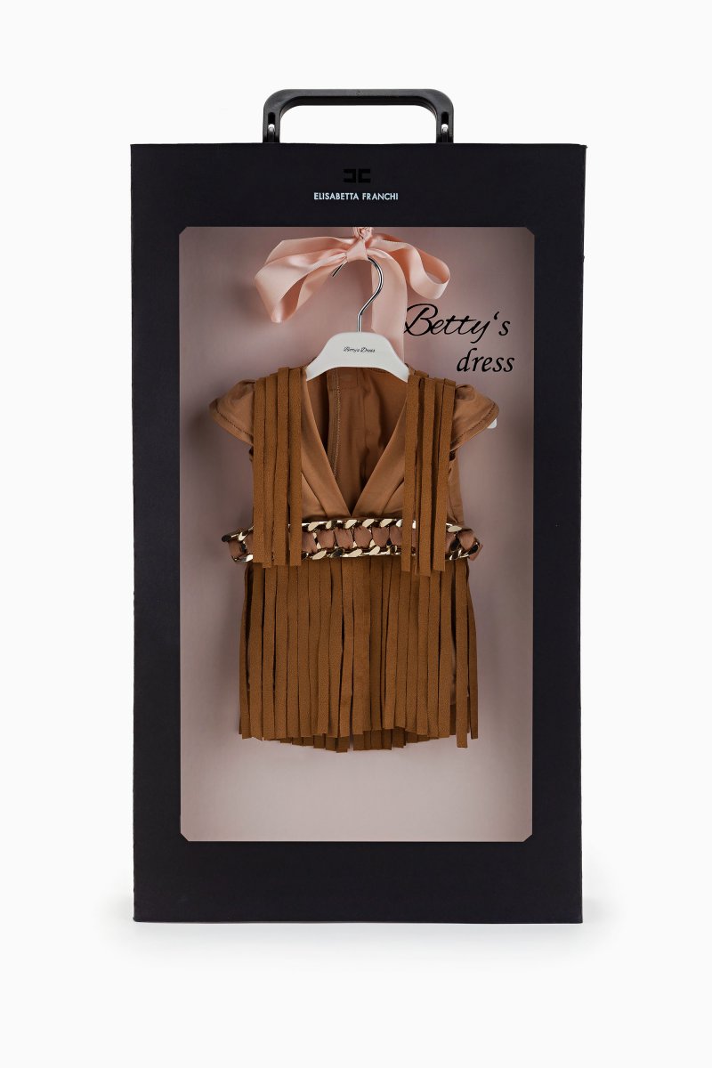 وسيكون كلّ من فستان طبعة الصّقر الثّلاثيّة الأبعاد المزيّن بتطريزات الأورغانزا وحبّات الكريستال والفستان الذي يأتي بلون التّبغ والمزوّد بكشاكش موضوعين في علبٍ خاصّة ومعروضين للبيع.