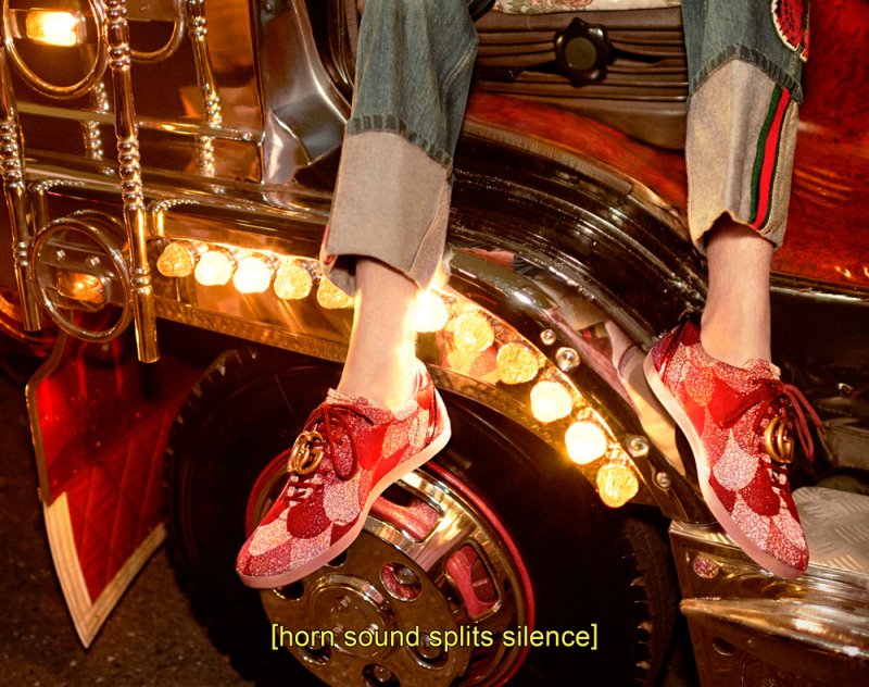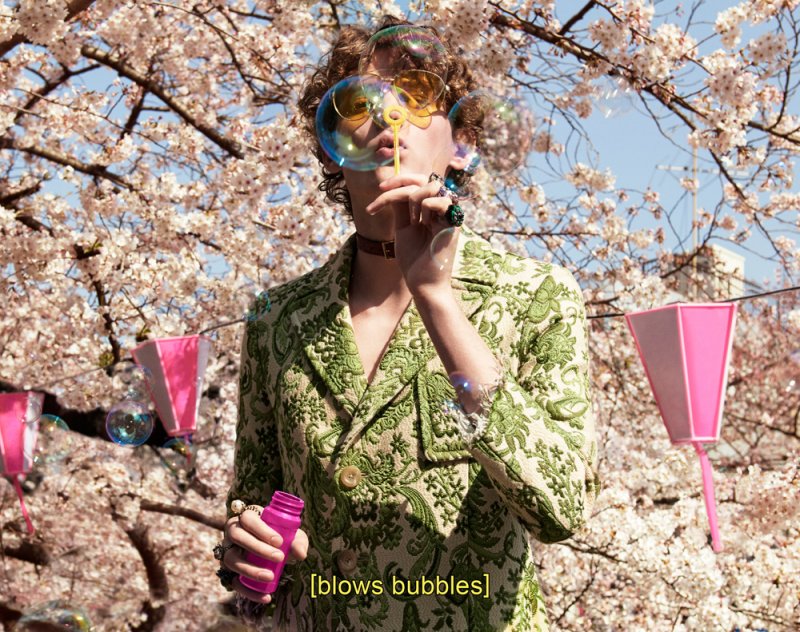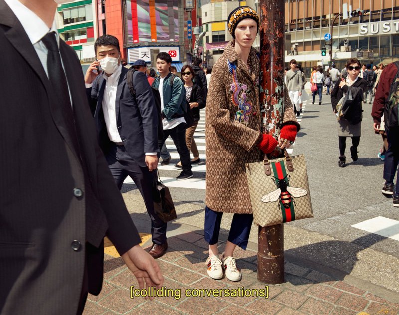 ومع غوتشي، النّتيجة واحدة وهي إشتباك متكرّر، إذا سمح القول، بين القديم والجديد والتّقليدي والمدني، إنّها أرض عجائب مفعمة بالحياة حيث تبصر أجزاء طوكيو التّقليديّة الهادئة النّور في حياة المدينة الفوضويّة. إنتقائيّة ومفعمة بالحيويّة بشكلٍ مطلق، تصوّر الحملة الإعلانيّة الجديدة نفسها كتحفة فنّيّة تليق بإبداعات المدير الإبداعي أليساندو ميشال الفنّيّة وذوق المدير الفنّي كريستوفر سيموندز الرّفيع.