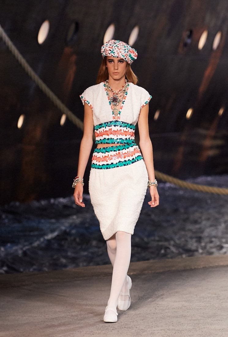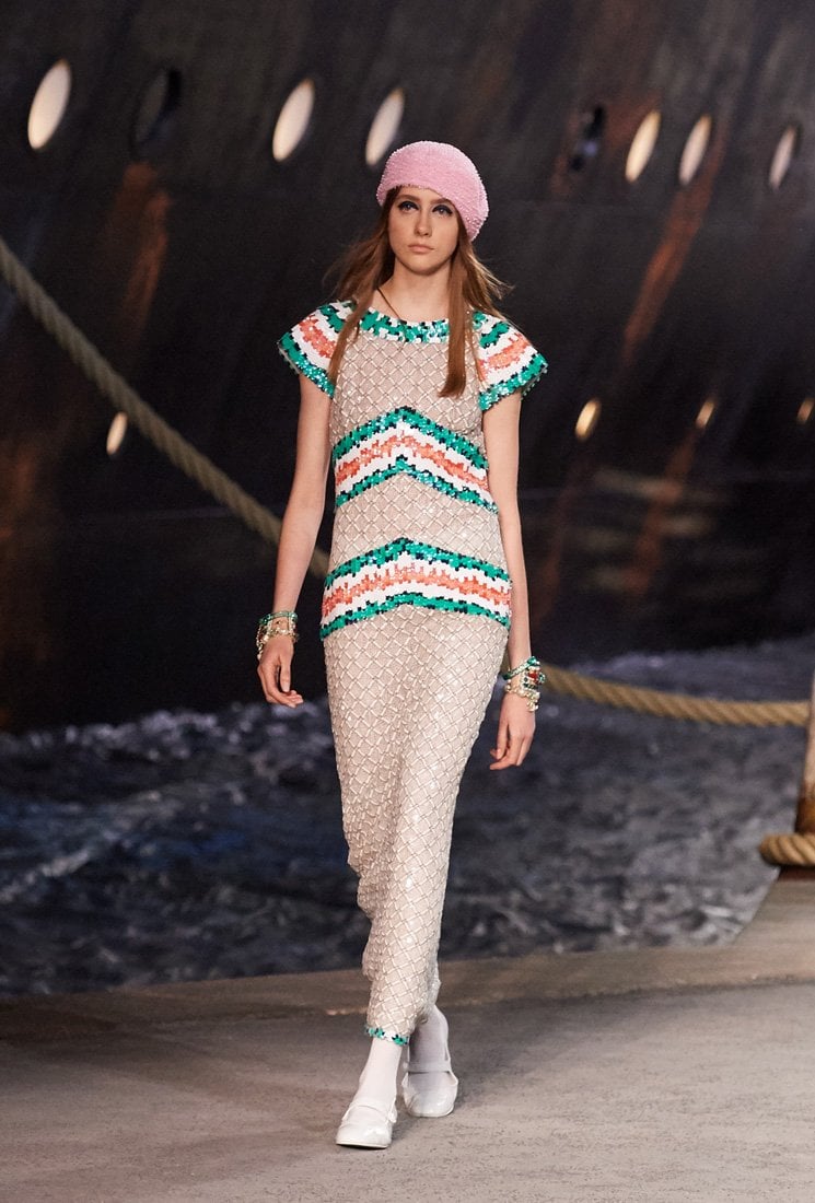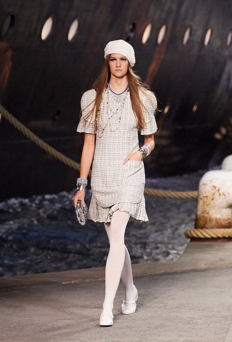 وتجلّى جوهر المجموعة واضحاً أمام أعين الحضور: سافري بأناقة وعلى طريقة شانيل CHANEL. واعتمدتْ العارضات أيضاً نظّارات ذات عدسات دائريّة كبيرة وتراوحتْ ألوان المجموعة بين الباستيل ولوني الزّهريّ والأزرق الصّيفيّين. واستولتْ طبعة الخطوط المتموّجة وتطريزات مزيّنة بتراتر بلون الأكوا المجسّد للبحر وفيزونات ضيّقة مصنوعة من الشّبك والكروشيه على المجموعة. وأيضاً، شهد الحضور على تصاميم مصنوعة من الجينز والبولي فينيل كلورايد والتّويد. والأهمّ من ذلك، إتّسمتْ المجموعة بإشراقة حالمة لا تتّسم بها سوى خبرة شانيل CHANEL.