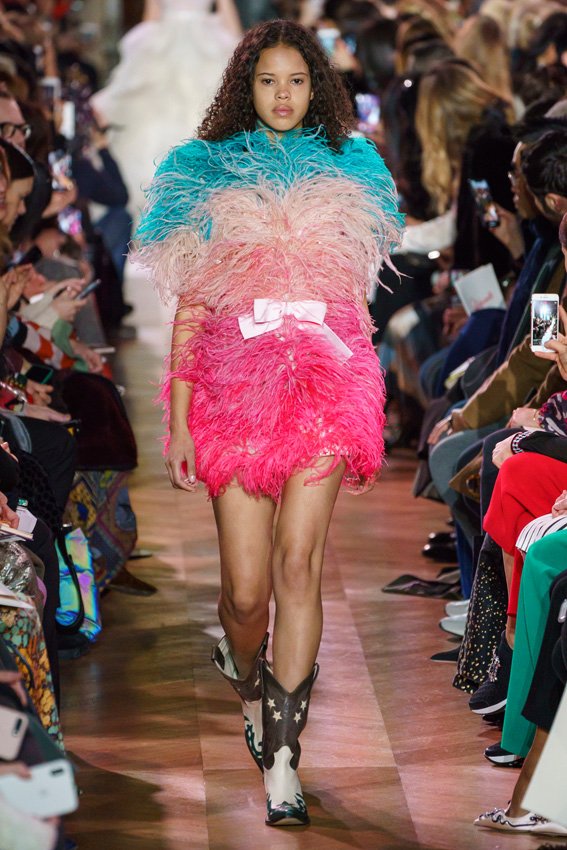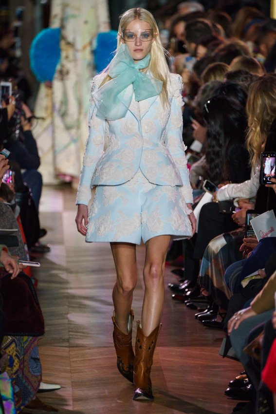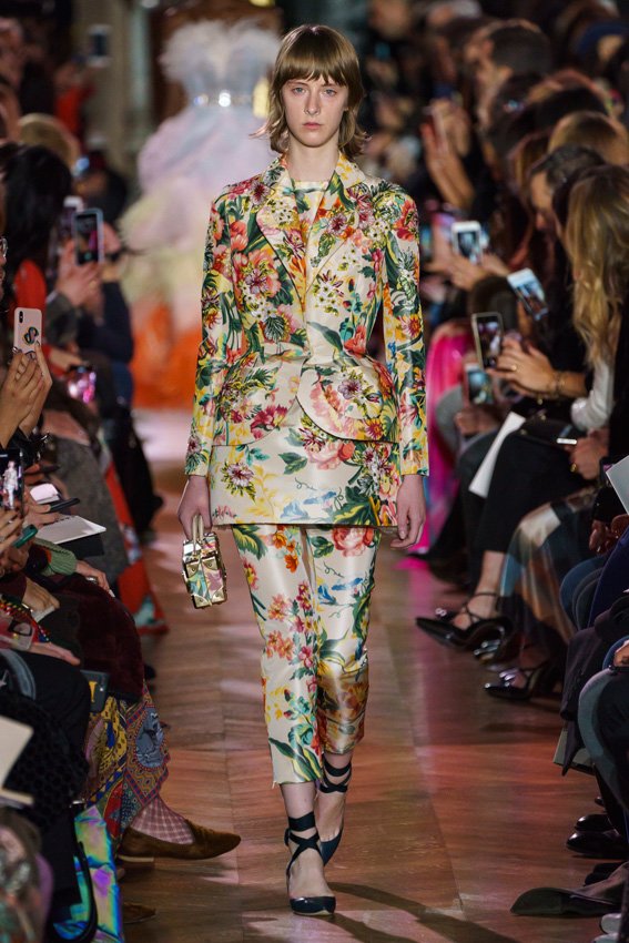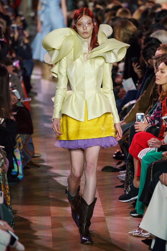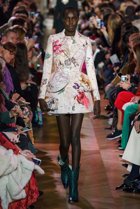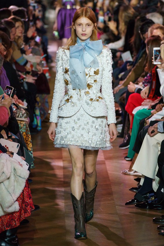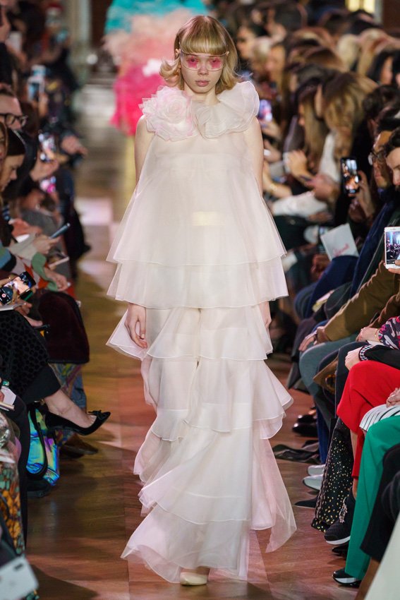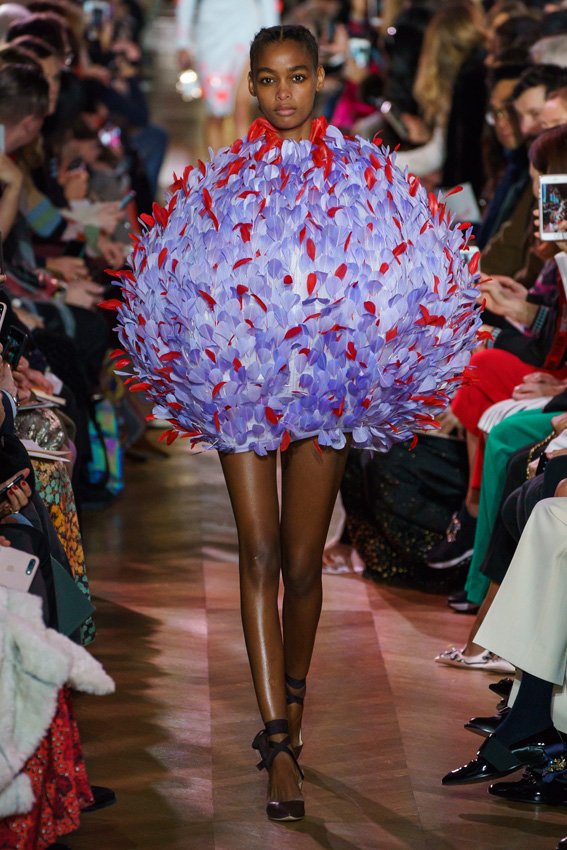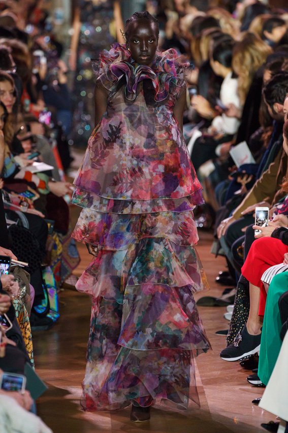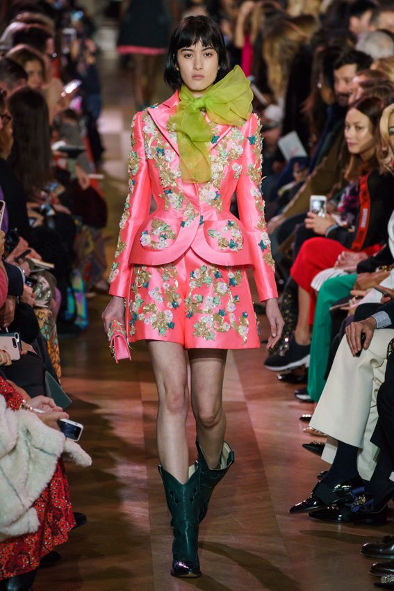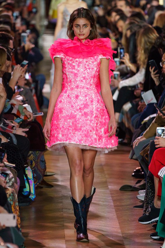 مع مرور العقود، توصّلنا إلى توقّع أمور معيّنة من كلّ علامة من دون استثناء. وبالتّالي، لطالما انتظرنا بفارغ الصّبر وقت يحين اكتشاف تصاميم سكياباريلي المفعمة بالألوان وإطلالاتها المتّسمة بأحجامٍ ضخمة وأقمشتها الفاتنة. وهذا بالتّحديد ما شهدت عليه ساحة الموضة اليوم. فأرسل المدير الإبداعي بيرتران غيون عارضات الأزياء إلى المدرج معتمداتٍ إطلالات تعكس جوهر الدّار إلى أقصى الحدود – من المكياج وتسريحات الشّعر التي تتّسم بالغرابة إلى قطع الملابس السّرياليّة. وكست فساتين الشّيفون المكشكشة عارضات الأزياء بأكثر الطّرق أناقةً، في حين تميّزت الفساتين المفعمة بالألوان والمزيّنة بالرّيش للغاية. وتنمّقت القطع بتفاصيل تجد مصدر وحيها في عالم الورود، وتناثرت صور المشاهير على فساتين السّاتان. وتميّزت جامبسوت منمّقة بالتّراتر من بين كافّة تصاميم المجموعة، باعثةً في هذه الأخيرة روحًا لا مثيل لها من الأسلوب المميّز والثّقة، بينما تألّقت قطع أخرى بعدد الكشاكش المفرط. وأبرزت عارضة الأزياء تايلور هيل مفاتنها بفستان باللّون الزّهري الفاقع تمّ إرفاقه بأحذية رعاة البقر، في حين سارت عارضات أخرى على المدرج ببدلات ساتان مفصّلة تشمل تنانير – تزيّنت جميعها بتفاصيل مستوحاة من الزّهور.