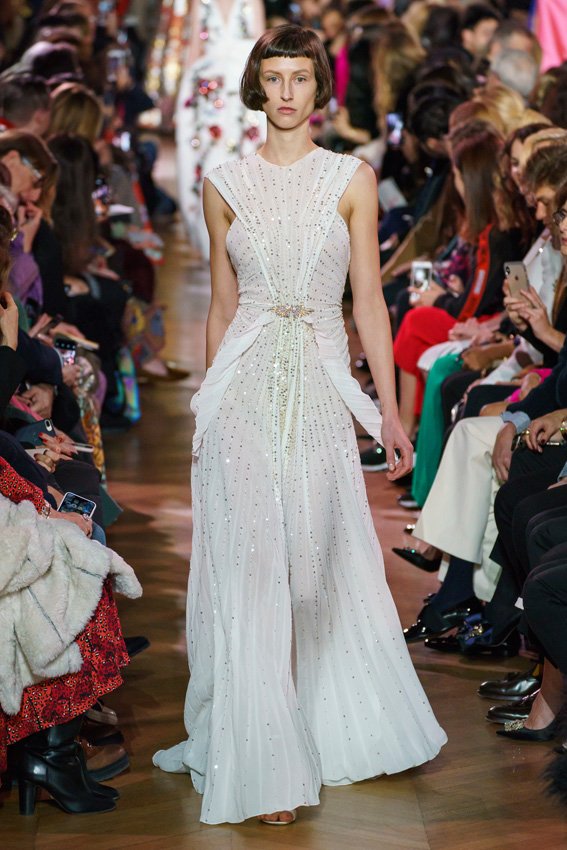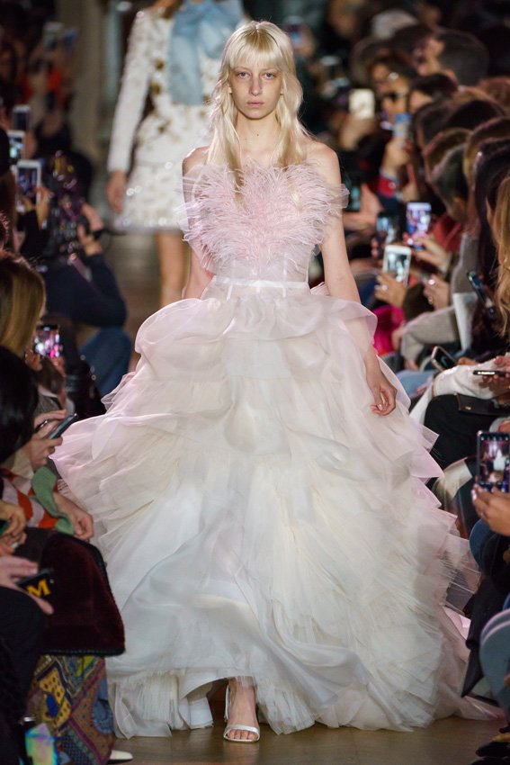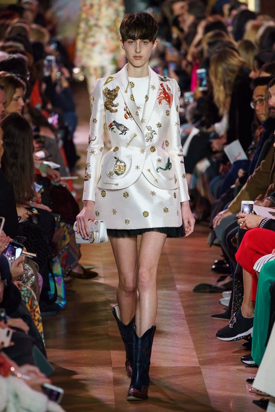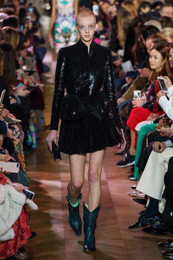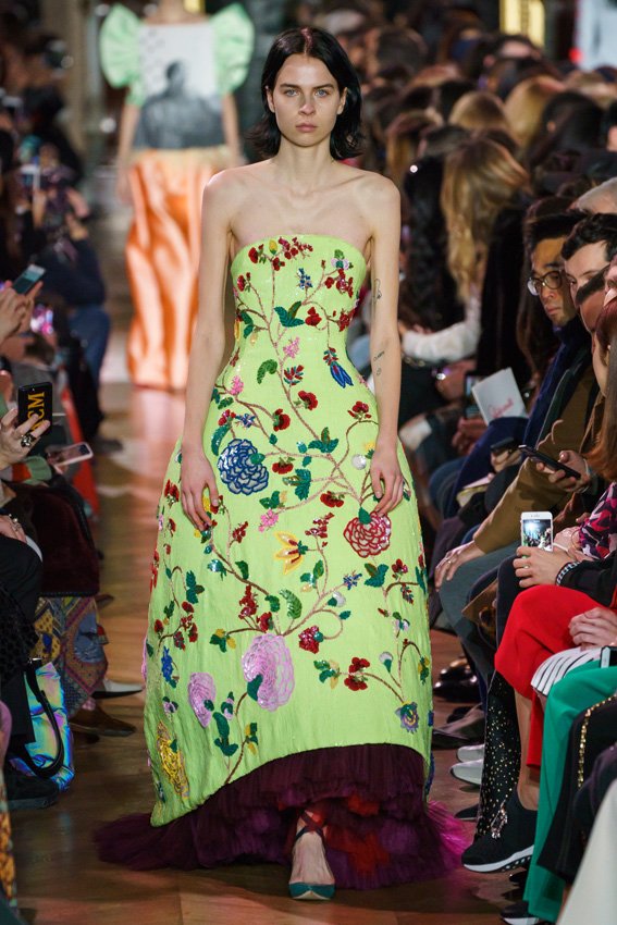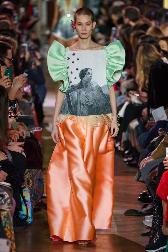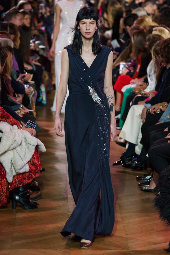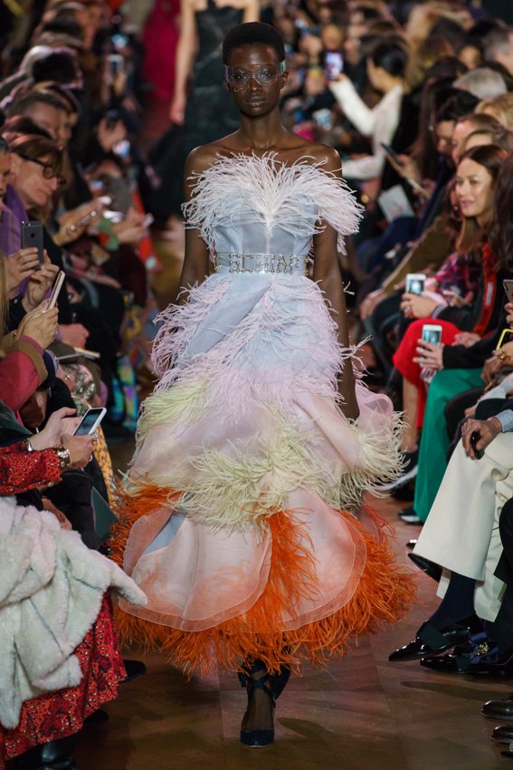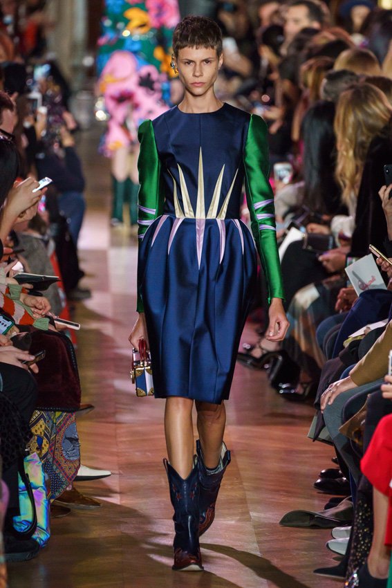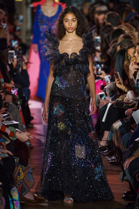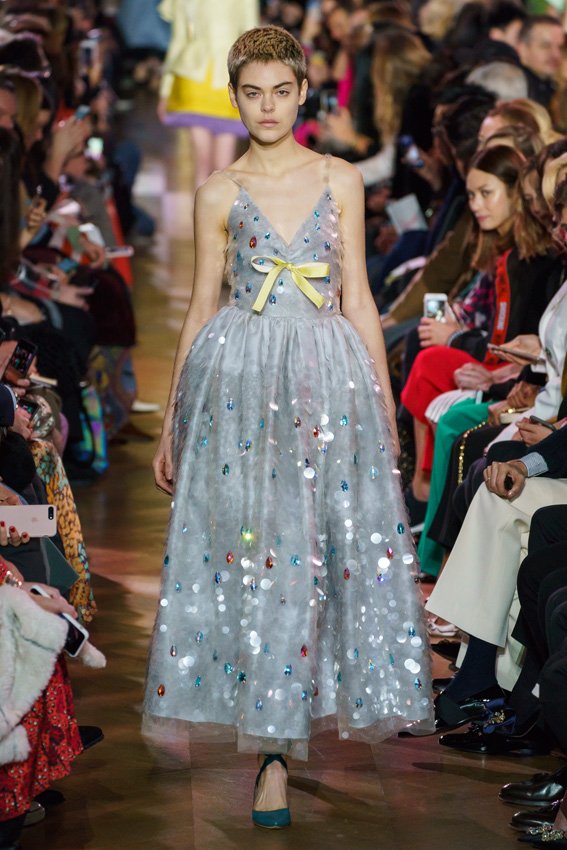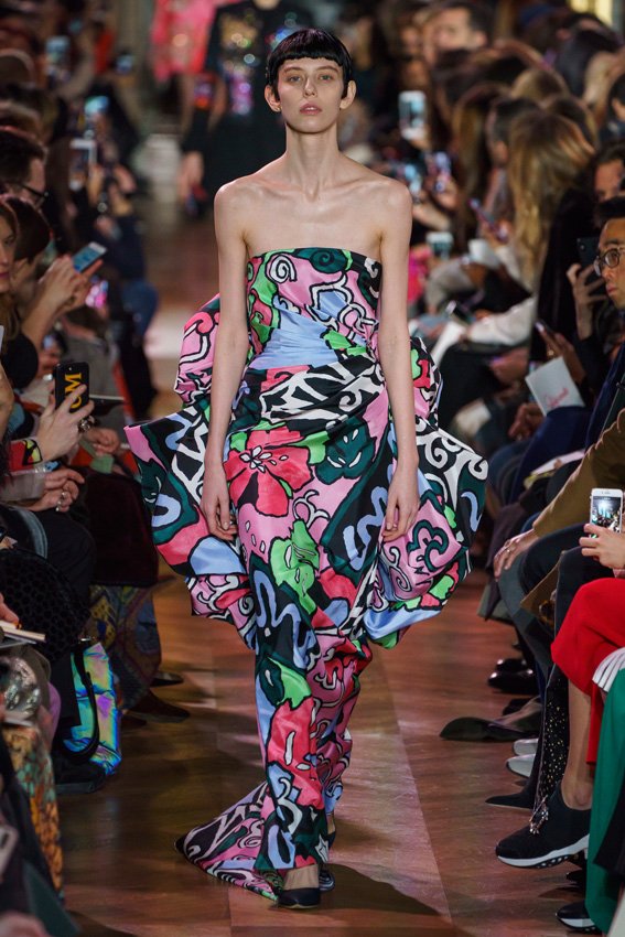 مع مرور العقود، توصّلنا إلى توقّع أمور معيّنة من كلّ علامة من دون استثناء. وبالتّالي، لطالما انتظرنا بفارغ الصّبر وقت يحين اكتشاف تصاميم سكياباريلي المفعمة بالألوان وإطلالاتها المتّسمة بأحجامٍ ضخمة وأقمشتها الفاتنة. وهذا بالتّحديد ما شهدت عليه ساحة الموضة اليوم. فأرسل المدير الإبداعي بيرتران غيون عارضات الأزياء إلى المدرج معتمداتٍ إطلالات تعكس جوهر الدّار إلى أقصى الحدود – من المكياج وتسريحات الشّعر التي تتّسم بالغرابة إلى قطع الملابس السّرياليّة. وكست فساتين الشّيفون المكشكشة عارضات الأزياء بأكثر الطّرق أناقةً، في حين تميّزت الفساتين المفعمة بالألوان والمزيّنة بالرّيش للغاية. وتنمّقت القطع بتفاصيل تجد مصدر وحيها في عالم الورود، وتناثرت صور المشاهير على فساتين السّاتان. وتميّزت جامبسوت منمّقة بالتّراتر من بين كافّة تصاميم المجموعة، باعثةً في هذه الأخيرة روحًا لا مثيل لها من الأسلوب المميّز والثّقة، بينما تألّقت قطع أخرى بعدد الكشاكش المفرط. وأبرزت عارضة الأزياء تايلور هيل مفاتنها بفستان باللّون الزّهري الفاقع تمّ إرفاقه بأحذية رعاة البقر، في حين سارت عارضات أخرى على المدرج ببدلات ساتان مفصّلة تشمل تنانير – تزيّنت جميعها بتفاصيل مستوحاة من الزّهور.