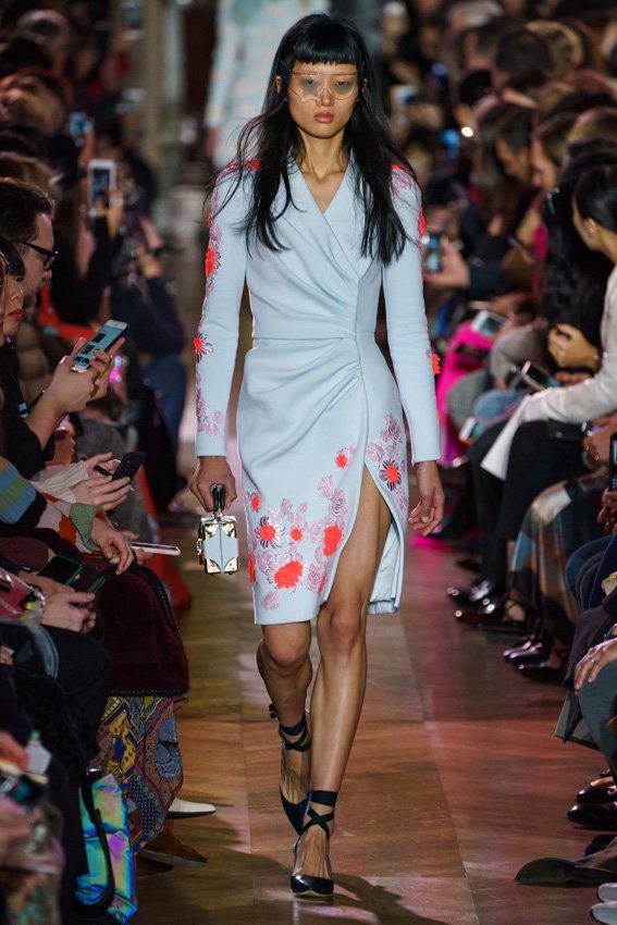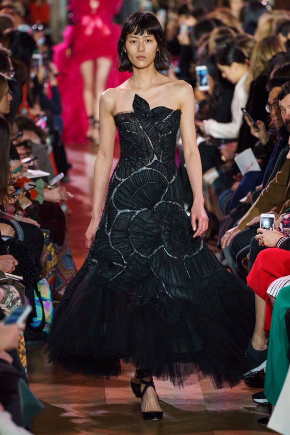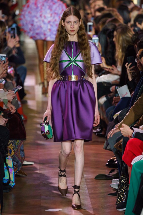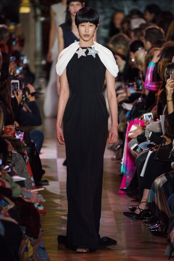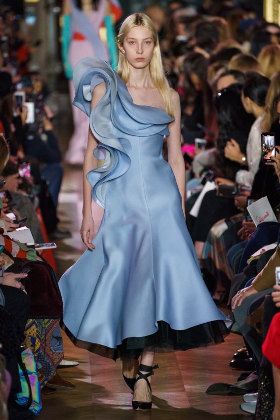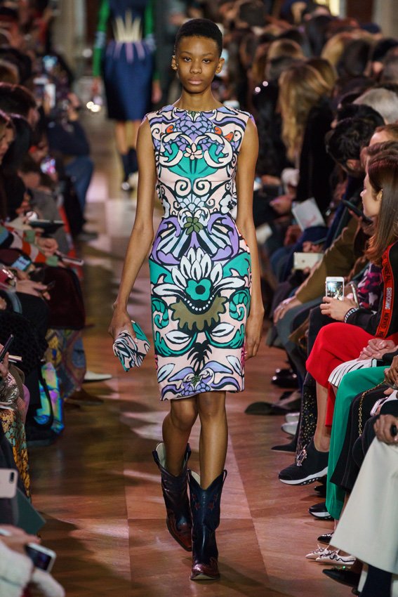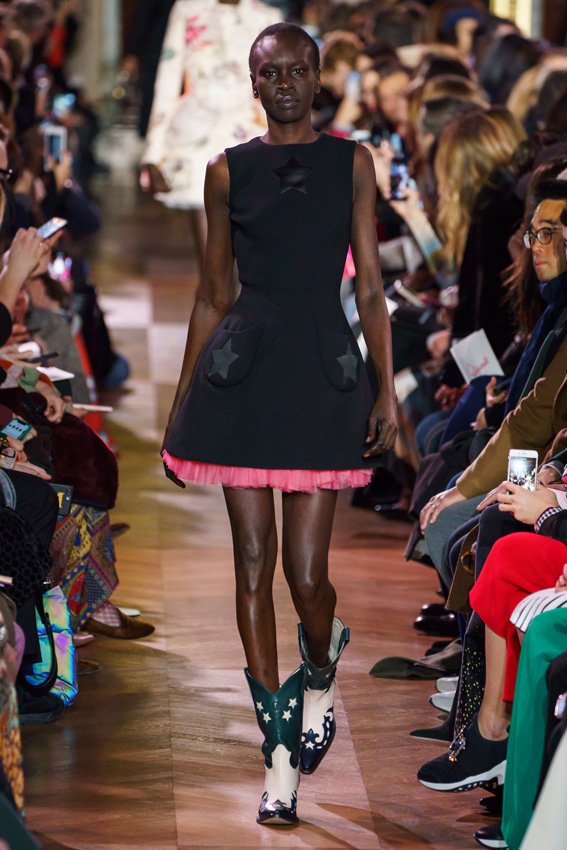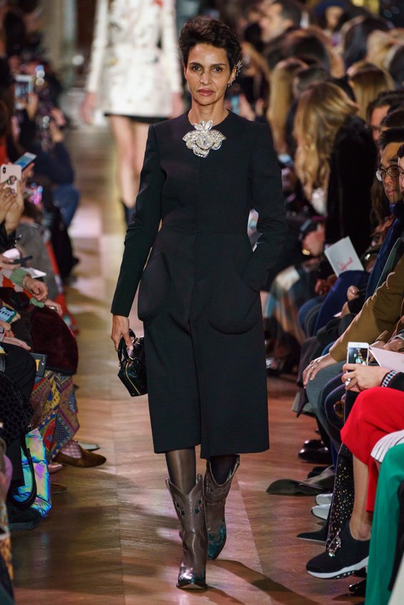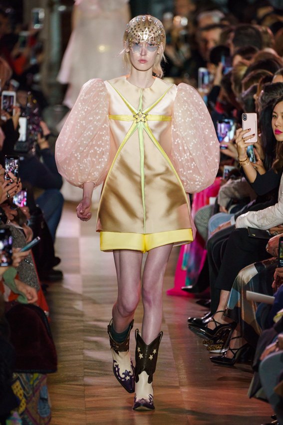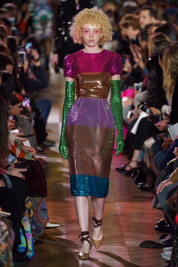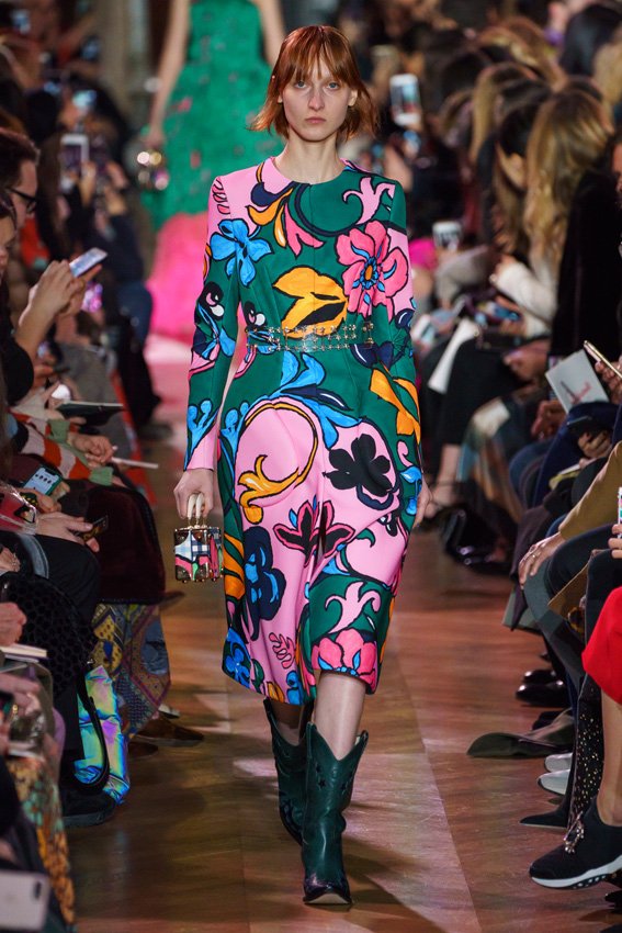 مع مرور العقود، توصّلنا إلى توقّع أمور معيّنة من كلّ علامة من دون استثناء. وبالتّالي، لطالما انتظرنا بفارغ الصّبر وقت يحين اكتشاف تصاميم سكياباريلي المفعمة بالألوان وإطلالاتها المتّسمة بأحجامٍ ضخمة وأقمشتها الفاتنة. وهذا بالتّحديد ما شهدت عليه ساحة الموضة اليوم. فأرسل المدير الإبداعي بيرتران غيون عارضات الأزياء إلى المدرج معتمداتٍ إطلالات تعكس جوهر الدّار إلى أقصى الحدود – من المكياج وتسريحات الشّعر التي تتّسم بالغرابة إلى قطع الملابس السّرياليّة. وكست فساتين الشّيفون المكشكشة عارضات الأزياء بأكثر الطّرق أناقةً، في حين تميّزت الفساتين المفعمة بالألوان والمزيّنة بالرّيش للغاية. وتنمّقت القطع بتفاصيل تجد مصدر وحيها في عالم الورود، وتناثرت صور المشاهير على فساتين السّاتان. وتميّزت جامبسوت منمّقة بالتّراتر من بين كافّة تصاميم المجموعة، باعثةً في هذه الأخيرة روحًا لا مثيل لها من الأسلوب المميّز والثّقة، بينما تألّقت قطع أخرى بعدد الكشاكش المفرط. وأبرزت عارضة الأزياء تايلور هيل مفاتنها بفستان باللّون الزّهري الفاقع تمّ إرفاقه بأحذية رعاة البقر، في حين سارت عارضات أخرى على المدرج ببدلات ساتان مفصّلة تشمل تنانير – تزيّنت جميعها بتفاصيل مستوحاة من الزّهور.