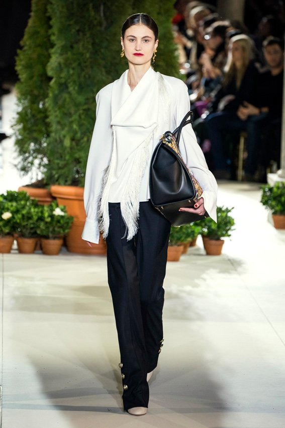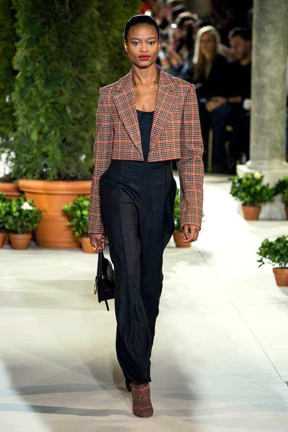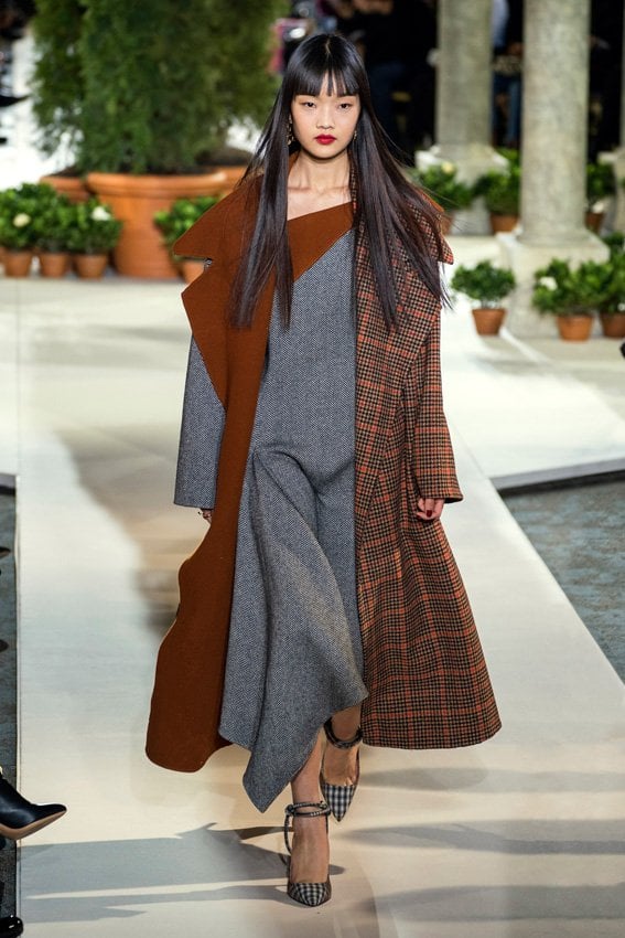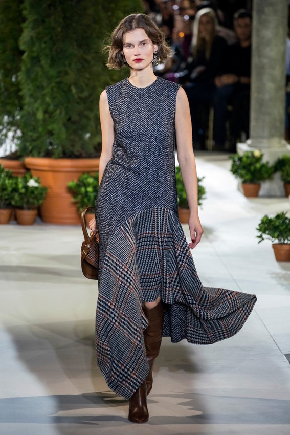 لعلّها الأقمشة الدّافئة التي عانقت بلطف أجسام عارضات الأزياء أو ربّما الألوان الخريفيّة التي تذكّرنا بأوراق الشّجر في فصل الخريف والأمسيات الخريفيّة، مهما كانتْ الأسباب لا شكّ في أنّ الموقع قد جسّد بطريقة مثاليّة الموسم الذي تعكسه المجموعة. فتخيّلي الأناقة التي خطفت أنفاس الحضور والتي تجسّدتْ في الخياطة الرّاقية وطبعة المربّعات ومعاطف الفرو المنمّقة بتفاصيل جميلة. وشهد الحضور أيضاً على فساتين غير متناسقة الأجزاء مزيّنة بطبعة المربّعات ومرفقة بأحذية عالية المستوى واسعة في الجزء العلويّ، فأحدثت تبايناً جميلاً وعرّفتنا إلى مفهوم جديد لرقي المرأة العصريّة. تكوّنتْ المجموعة من فساتين رائعة سلسة الحركة إستولتْ عليها ألوان دافئة، من البرتقاليّ إلى الخردليّ والأسود طبعاً. تنوّعتْ الطّبعات والأقمشة ومن بينها القماش المبطّن الذي تحوّل إلى فستان أميرة غير مردن. أمّا تصميمنا المفضّل، فهو الفستان الأبيض الذي إستولى عليه الرّيش وجاء مرفقاً بحزام أسود سلّط الأنظار على خصر العارضة.