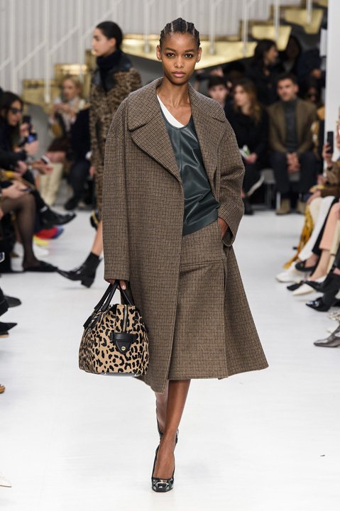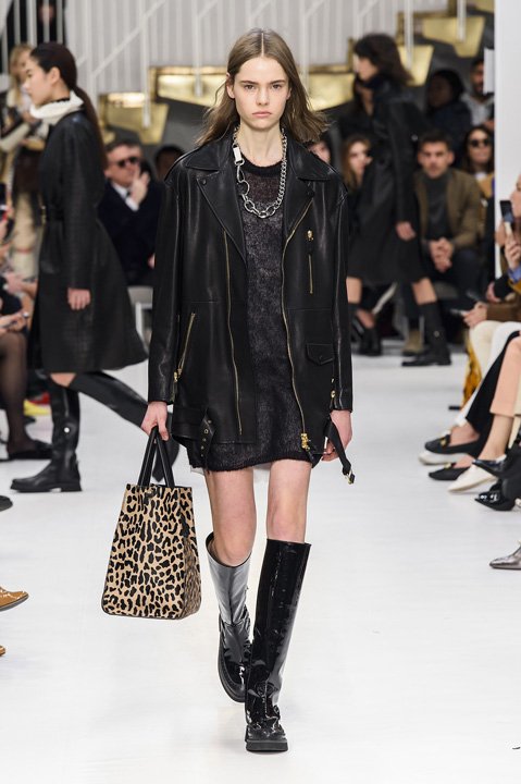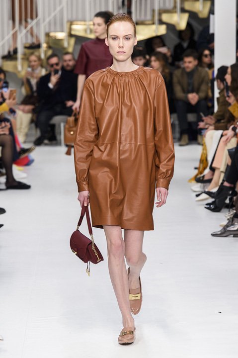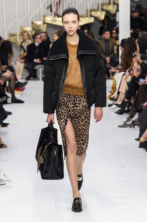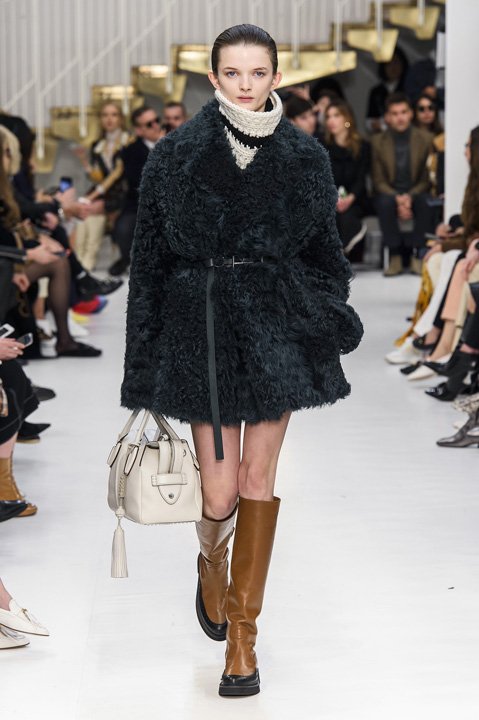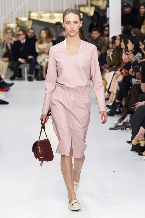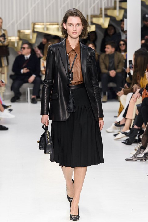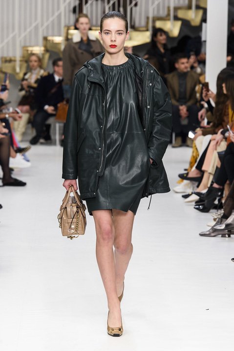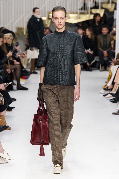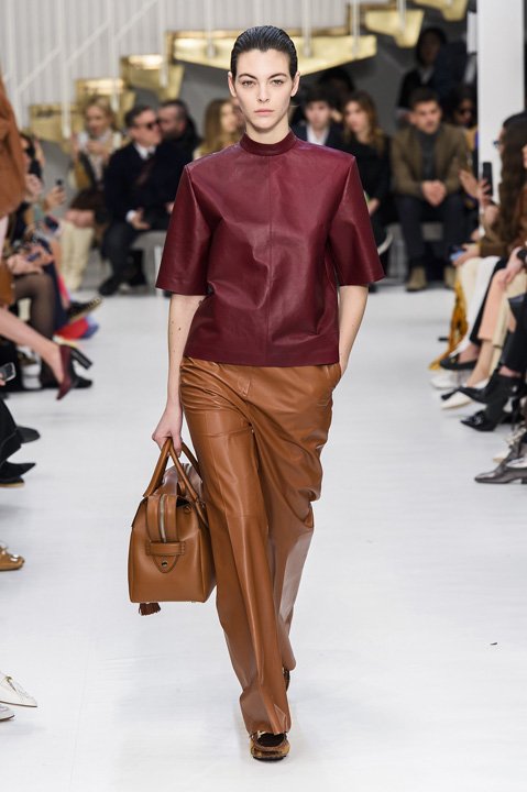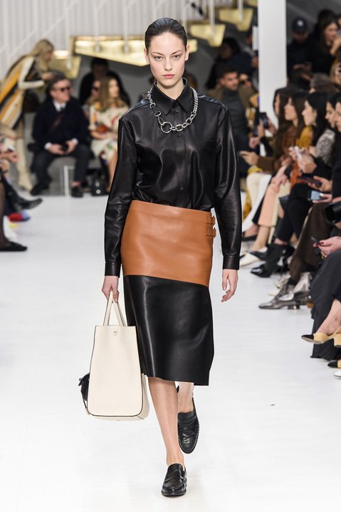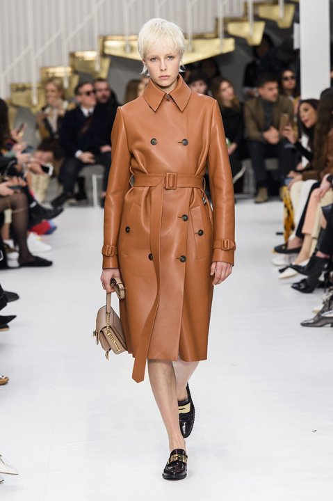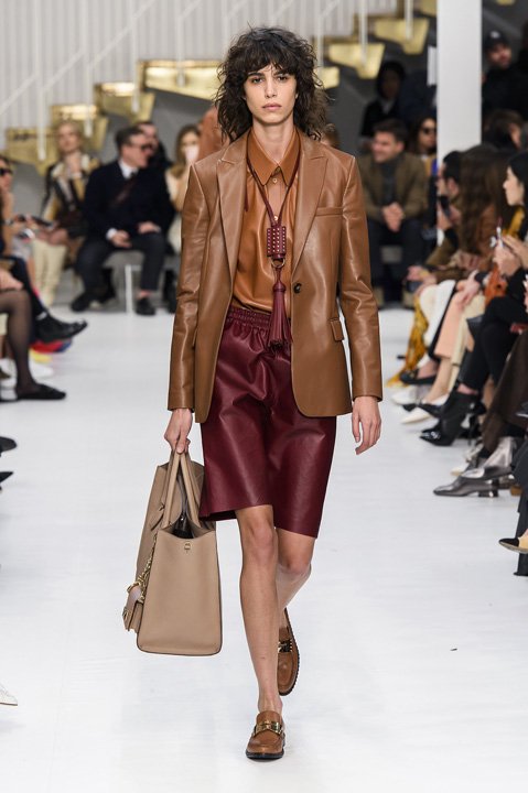 لطالما إشتهرتْ هذه الدّار الإيطاليّة بإتقانها التّعامل الحرفيّ مع كافّة أنواع الجلود وأثبتتْ لنا هذه الأخيرة ذلك مرّة أخرى من خلال هذه المجموعة التي تضمّنتْ إطلالات إستولى الجلد عليها بشكل كامل. وهذا يعني، بلغة تودز طبعاً، عدد كبير من معاطف التّرانش الجلديّة الرّاقية جدّاً وتنانير جلديّة متوسّطة الطّول وبلوزات جلديّة وتصاميم أخرى مصنوعة من هذه المادّة. أرفقتْ الإطلالات كافّة بأحذية جلديّة تخطّتْ مستوى الرّكبة وبعضها إستولتْ عليه طبعة جلد التّمساح أيضاً. وانعكس مزاج المجموعة على التّصاميم الدّاكنة اللّون ثمّ شهد الحضور على ألوان أفتح، فظهر الكاميل أوّلًا لتتبعه ألوان زاهية أخرى.