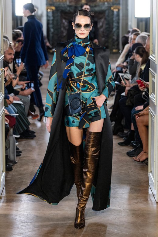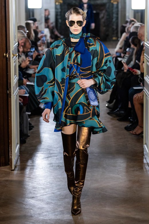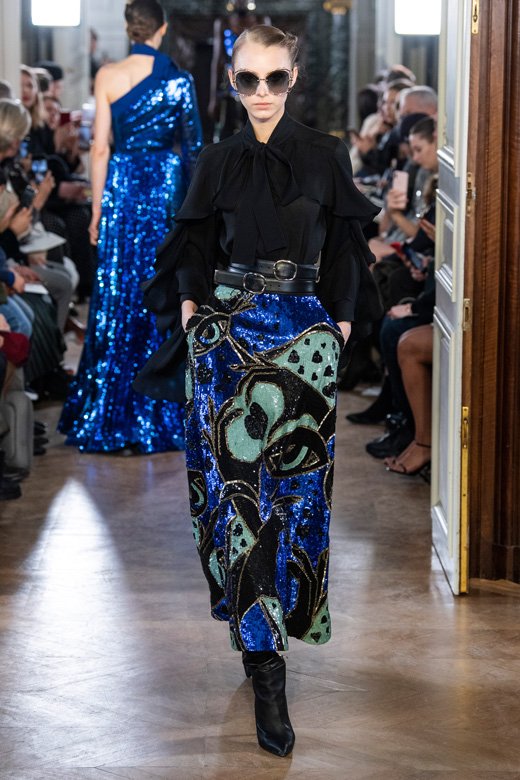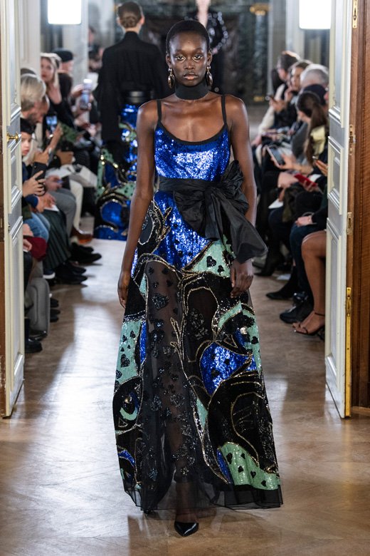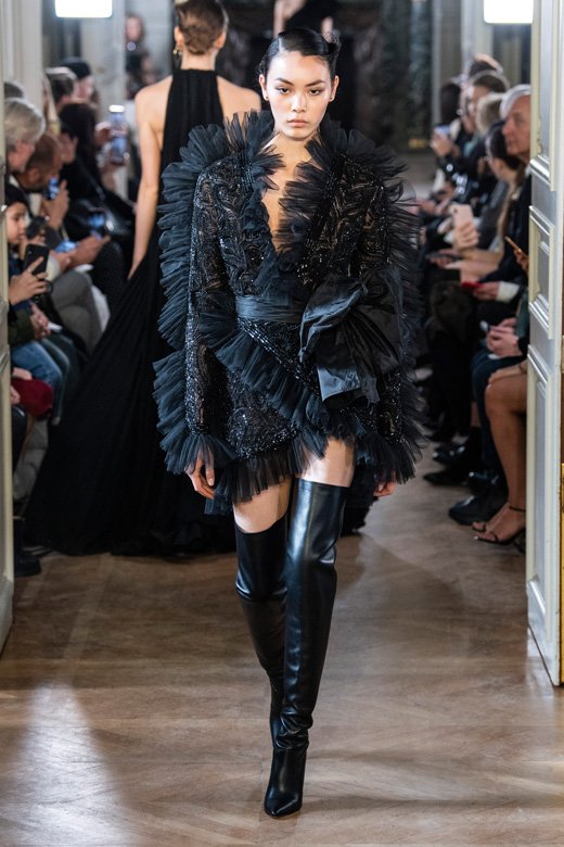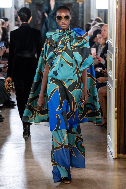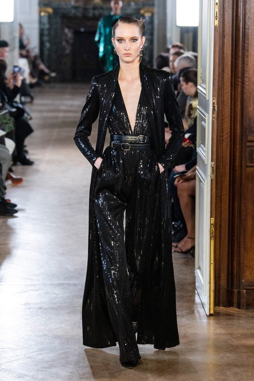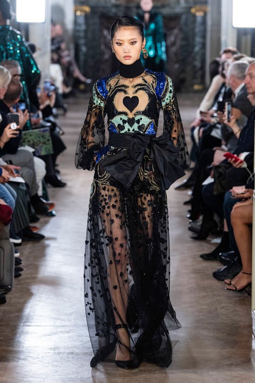 وفي نصف العرض، إستولت الطّبعات الرّاقية على المدرج فزيّنتْ السّترات والمعاطف والفساتين القصيرة. أمّا فساتين السّهرة، فكانت ملفتة جدّاً وغنيّة بالتّفاصيل الجميلة. وإتّسمتْ هذه الأخيرة أيضاً بأحجامها وأبعادها الكبيرة وعُقدها، إلى جانب الأقمشة الإستثنائيّة التي صُنعت منها. وكانت التّراتر عاملاً أساسيّاً أيضاً في المجموعة، إذ طغت على الجامبسوتات والأردية، هذا بالإضافة إلى البدلات الرّسميّة طبعاً. وكانتْ نتيجة مزج المصمّم اللّبنانيّ للأقمشة المختلفة مذهلة حتماً وهذا ما لطالما إشتهر به هذا الأخير.