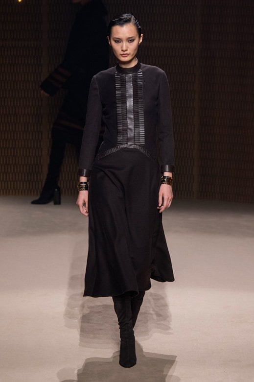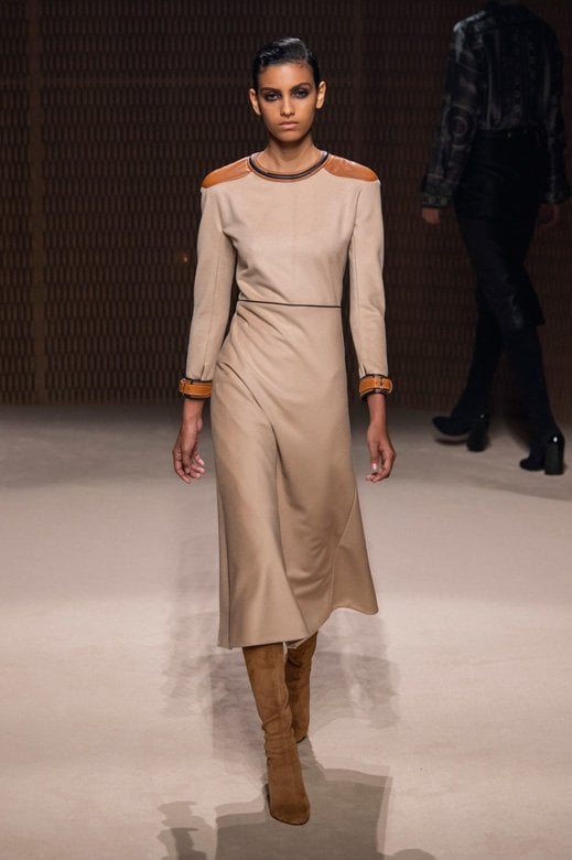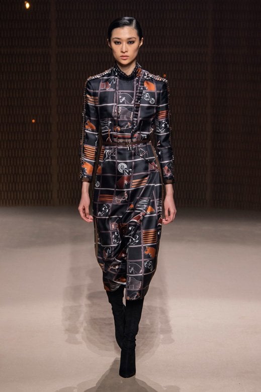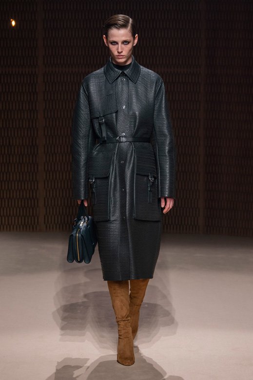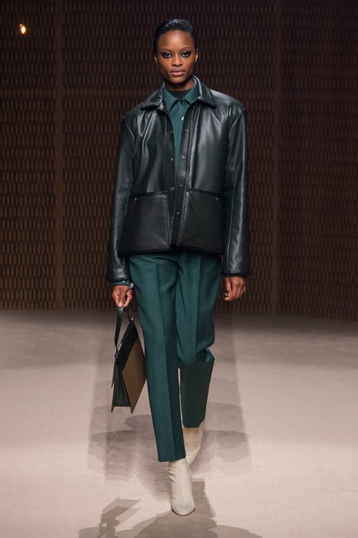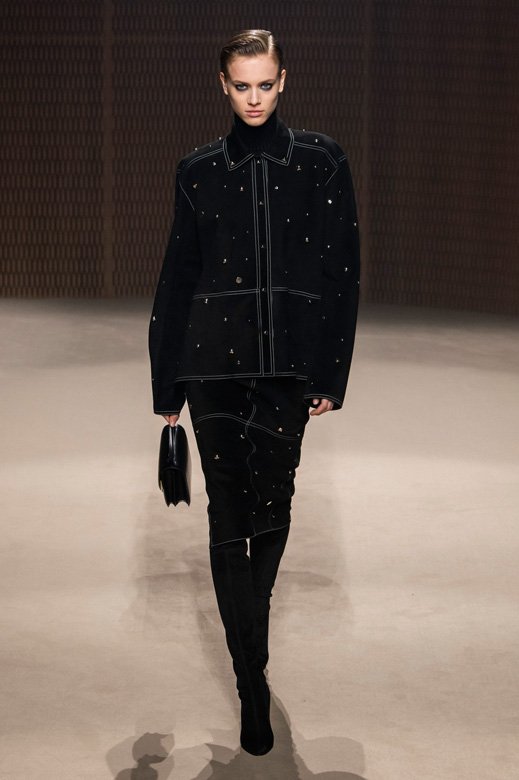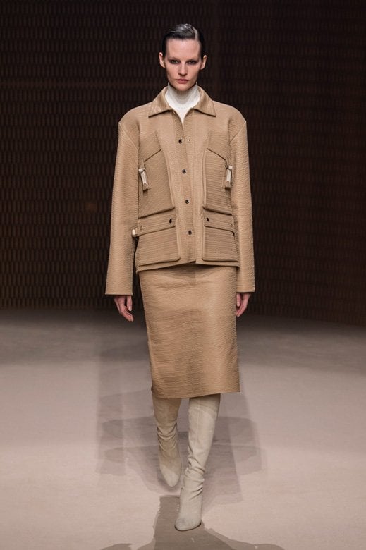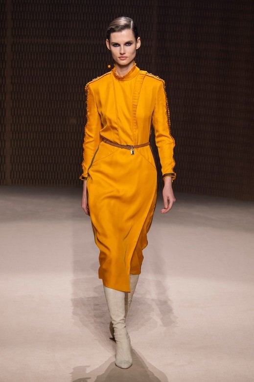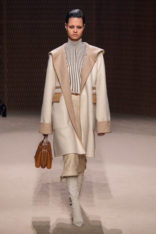 فما الذي يمنع الدّار الفرنسيّة من إدخال كلّ هذه التّفاصيل على مجموعة خريف وشتاء 2019-2020 بطريقة راقية جدّاً؟ أرسلت المصمّمة ناديج فانهي سيبولسكي عارضات أزياء الدّار إلى المدرج معتمدات شورتات قصيرة جدّاً مصنوعة من جلد العجل ومرفقة بطريقة أنيقة بحقائب خصر، إلى جانب معاطف مصنوعة من جلد الظّباء مرفقة بأحذية عالية المستوى. وكان الأسلوب الأنيق طاغياً على التّصاميم الجلديّة كلّها. وفي حين إستولت البدلات الجلديّة السّوداء على المدرج بشكل كامل، تزيّن بعضها باللّون البرتقاليّ الأيقونيّ الذي أحدث تبايناً جميلاً جدّاً مع باقي القطع. وشهد الحضور أيضاً على تشكيلة كبيرة من التّنانير الجلديّة الضّيّقة المتوسّطة الطّول التي أُرفقتْ ببلوزات حريريّة جميلة، في حين تزيّنتْ المعاطف بلمسة من الجلد. وكانت الألوان الكريميّة والبرتقاليّ طاغية على المجموعة، الأمر الذي ذكّرنا بثقافة هرميس...فمن منّا يستطيع مقاومة أناقة تصاميمها البسيطة على أيّ حال؟