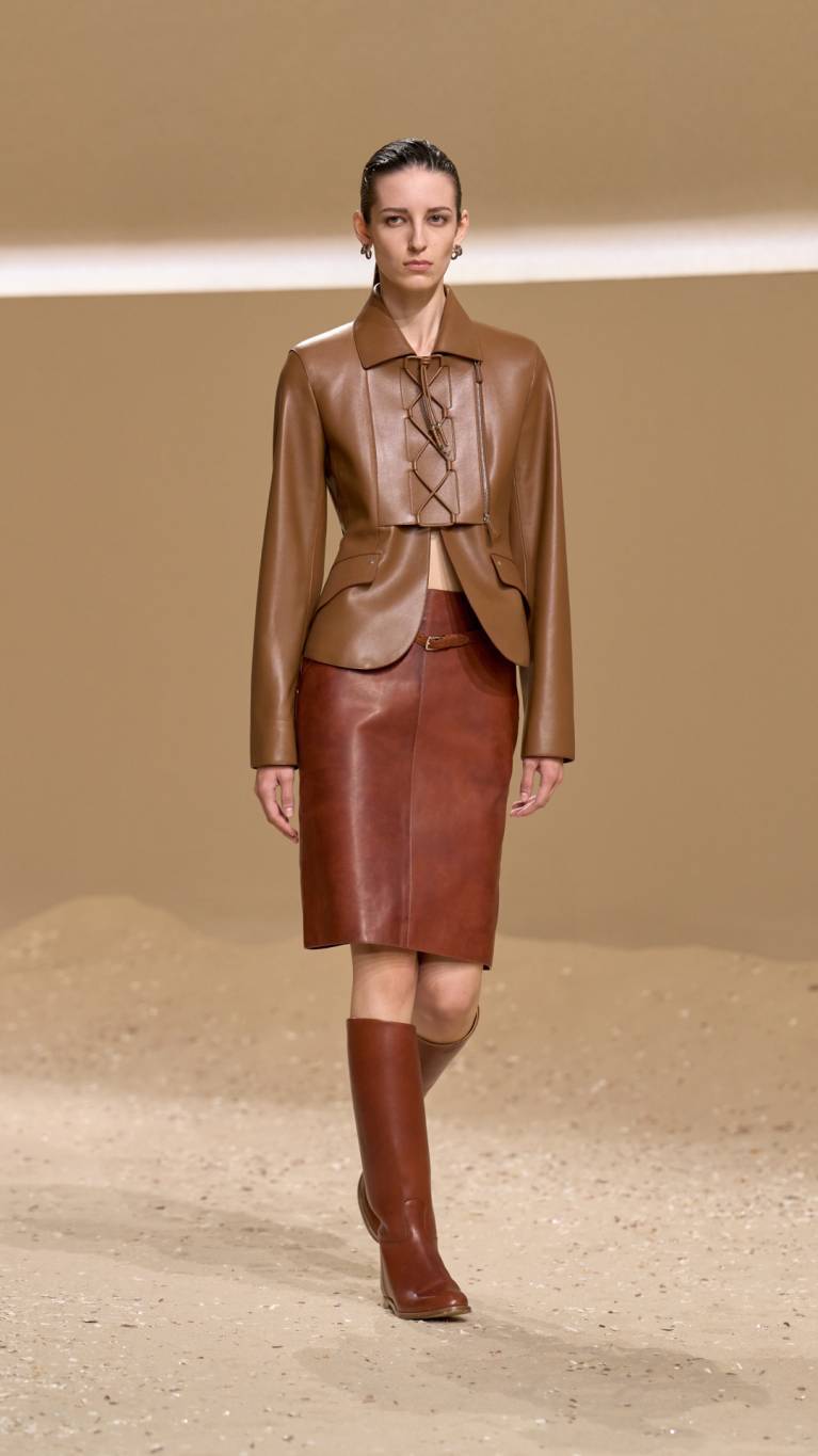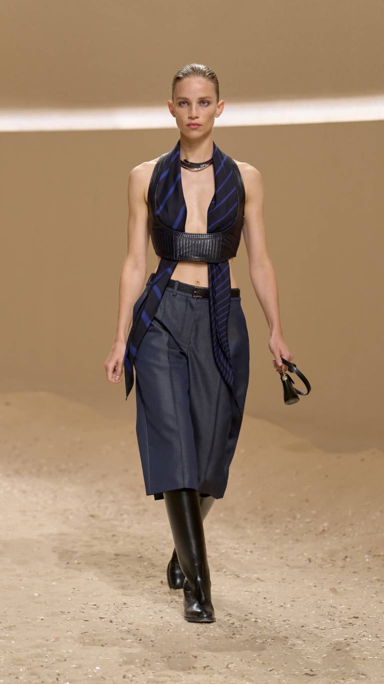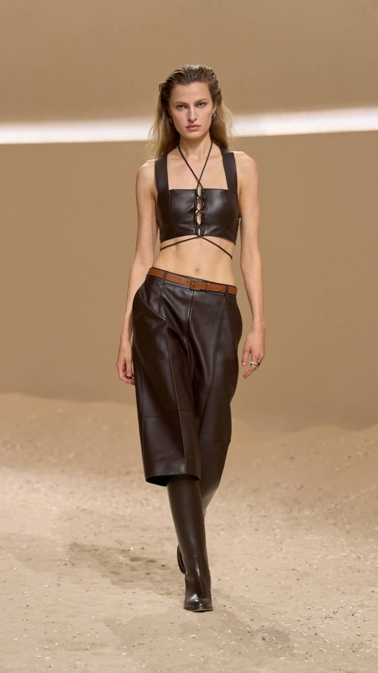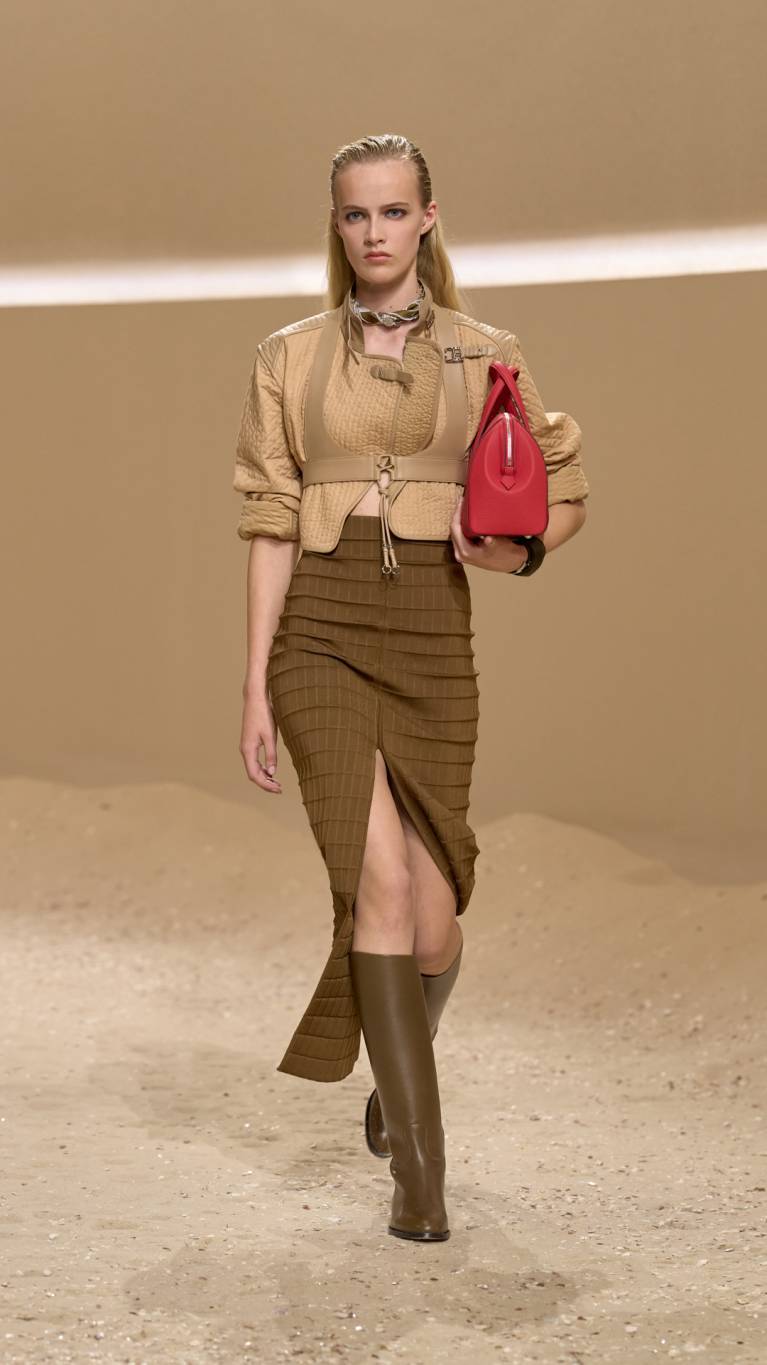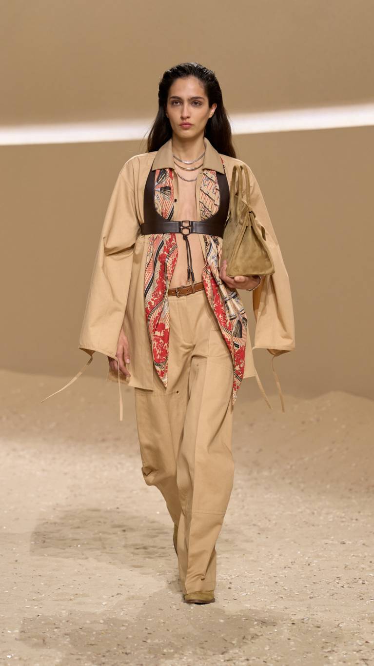 وتؤثّر عناصر تصميم مثل مسند الظهر الخلفيّ المنحني على قطع تتميّز بتفاصيل الجلد المشمّع يدويًا، وخياطة مبطّنة، وإكسسوارات معدنيّة مميّزة. وتعكس السترات الفروسيّة والتنانير غير المتناسقة المبطّنة إحساسًا بالحركة، في حين تعيد المعاطف الخفيفة والمربوطة بأحزمة تشبه اللجام صدى الدقة والتفصيل. وتتدفّق التصاميم مع طبقات متغيّرة: فتتحوّل أوشحة الحرير إلى قمصان أو عقود نحتيّة، وتُرتدى الفساتين المبّطنة المستوحاة من المشدّ فوق شورتات راكبي الدراجة الهوائيّة، وتثبت حمّالات الصدر الأزياء المنسدلة والمزيّنة بنقشات حيويّة. ويبرز الطابع البحريّ في سراويل الدنغري والقطع المحبوكة الشفافة، بينما تضيف طبعة Méditerranée لمسات انسيابيّة تشبه ضربات الفرشاة.