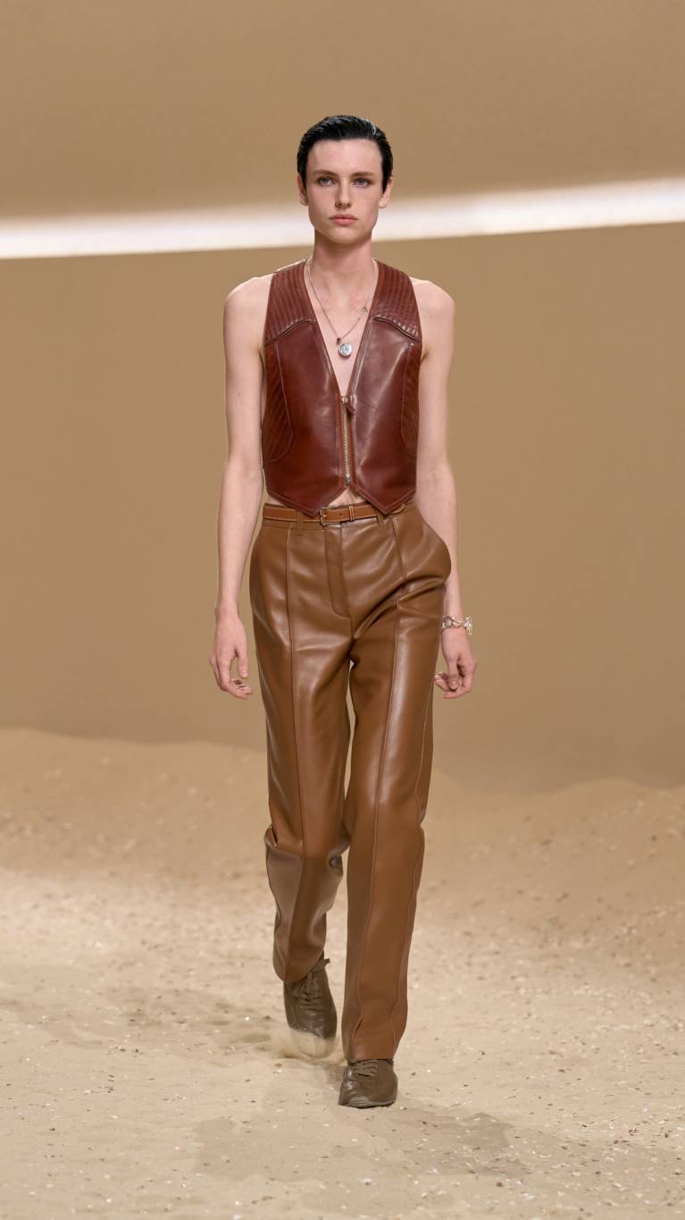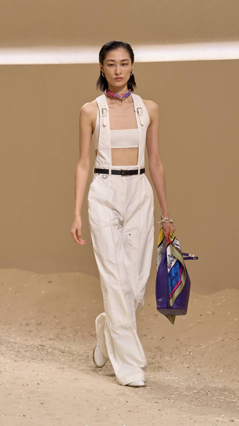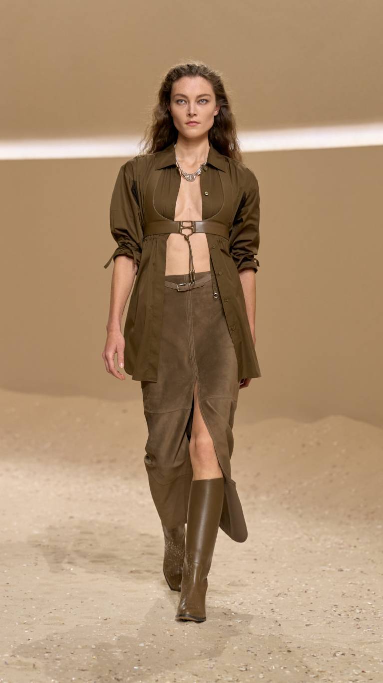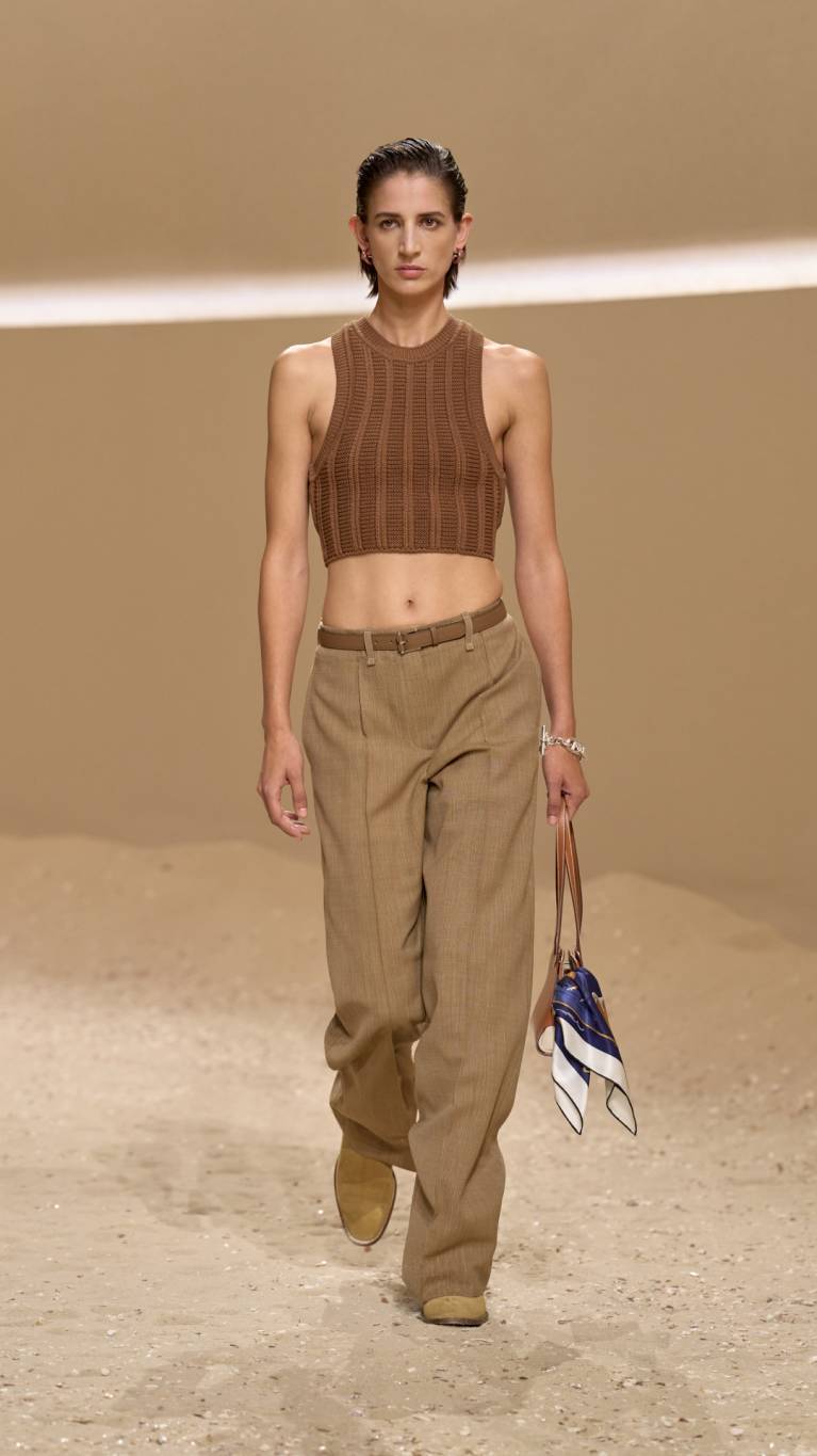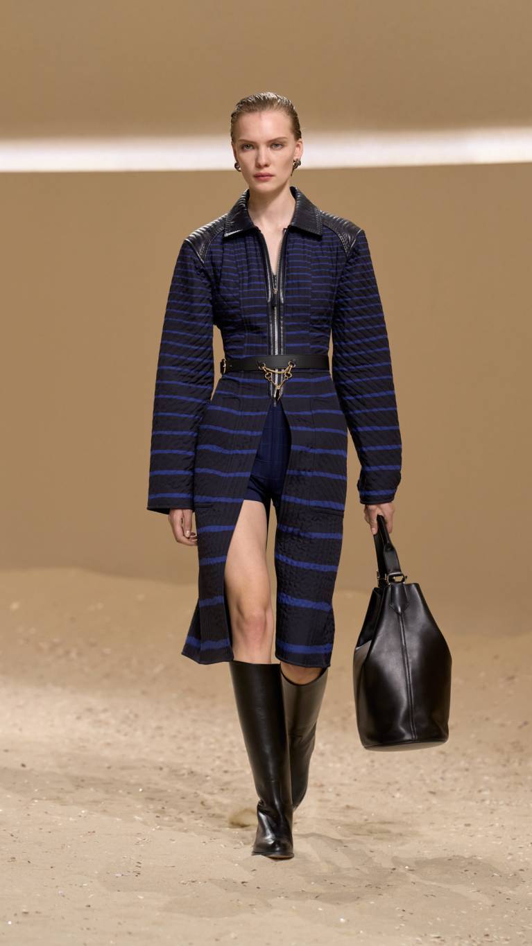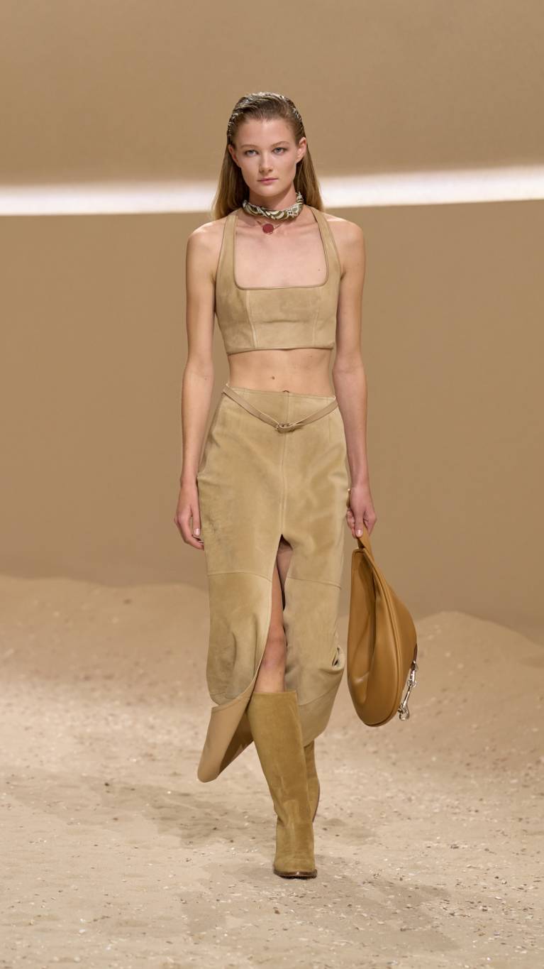 وتؤثّر عناصر تصميم مثل مسند الظهر الخلفيّ المنحني على قطع تتميّز بتفاصيل الجلد المشمّع يدويًا، وخياطة مبطّنة، وإكسسوارات معدنيّة مميّزة. وتعكس السترات الفروسيّة والتنانير غير المتناسقة المبطّنة إحساسًا بالحركة، في حين تعيد المعاطف الخفيفة والمربوطة بأحزمة تشبه اللجام صدى الدقة والتفصيل. وتتدفّق التصاميم مع طبقات متغيّرة: فتتحوّل أوشحة الحرير إلى قمصان أو عقود نحتيّة، وتُرتدى الفساتين المبّطنة المستوحاة من المشدّ فوق شورتات راكبي الدراجة الهوائيّة، وتثبت حمّالات الصدر الأزياء المنسدلة والمزيّنة بنقشات حيويّة. ويبرز الطابع البحريّ في سراويل الدنغري والقطع المحبوكة الشفافة، بينما تضيف طبعة Méditerranée لمسات انسيابيّة تشبه ضربات الفرشاة.