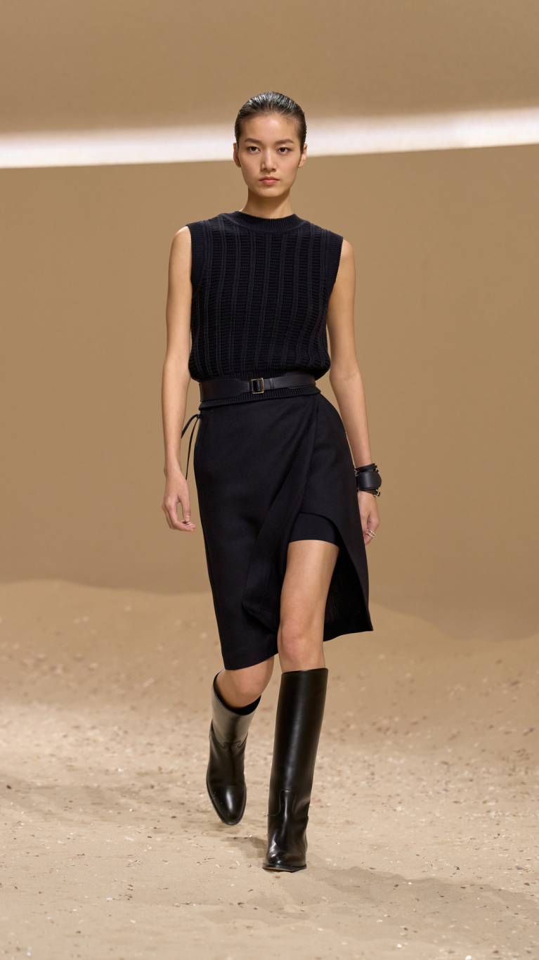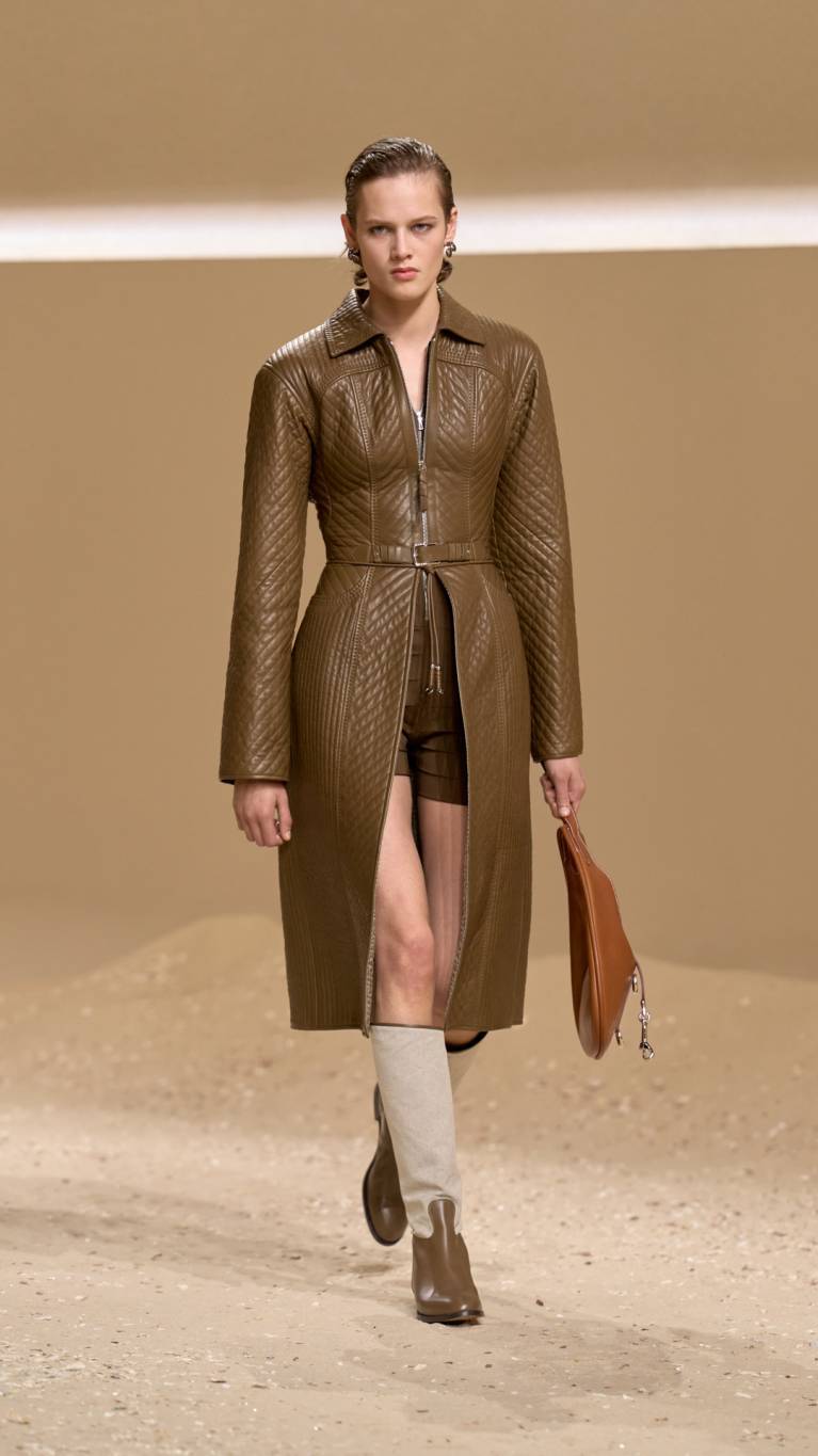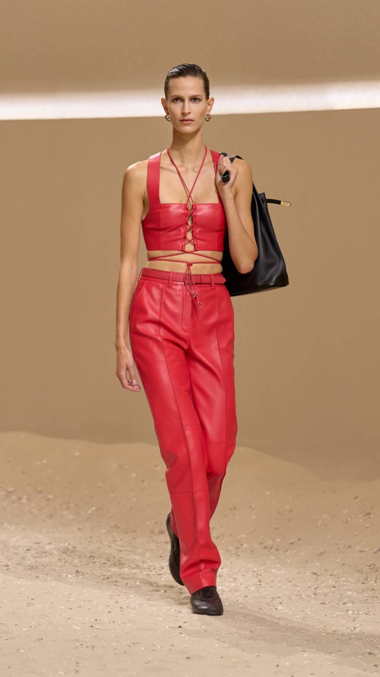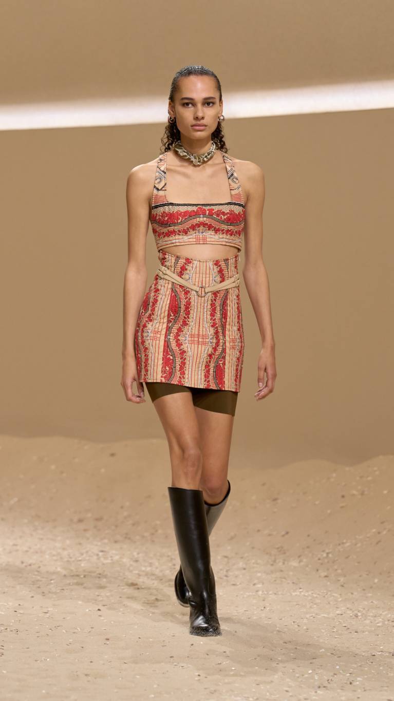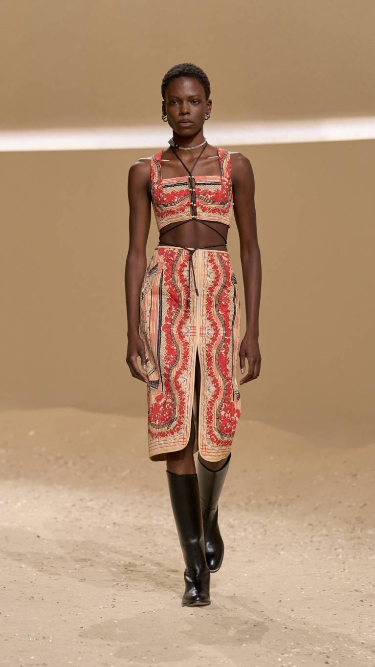 وتؤثّر عناصر تصميم مثل مسند الظهر الخلفيّ المنحني على قطع تتميّز بتفاصيل الجلد المشمّع يدويًا، وخياطة مبطّنة، وإكسسوارات معدنيّة مميّزة. وتعكس السترات الفروسيّة والتنانير غير المتناسقة المبطّنة إحساسًا بالحركة، في حين تعيد المعاطف الخفيفة والمربوطة بأحزمة تشبه اللجام صدى الدقة والتفصيل. وتتدفّق التصاميم مع طبقات متغيّرة: فتتحوّل أوشحة الحرير إلى قمصان أو عقود نحتيّة، وتُرتدى الفساتين المبّطنة المستوحاة من المشدّ فوق شورتات راكبي الدراجة الهوائيّة، وتثبت حمّالات الصدر الأزياء المنسدلة والمزيّنة بنقشات حيويّة. ويبرز الطابع البحريّ في سراويل الدنغري والقطع المحبوكة الشفافة، بينما تضيف طبعة Méditerranée لمسات انسيابيّة تشبه ضربات الفرشاة.