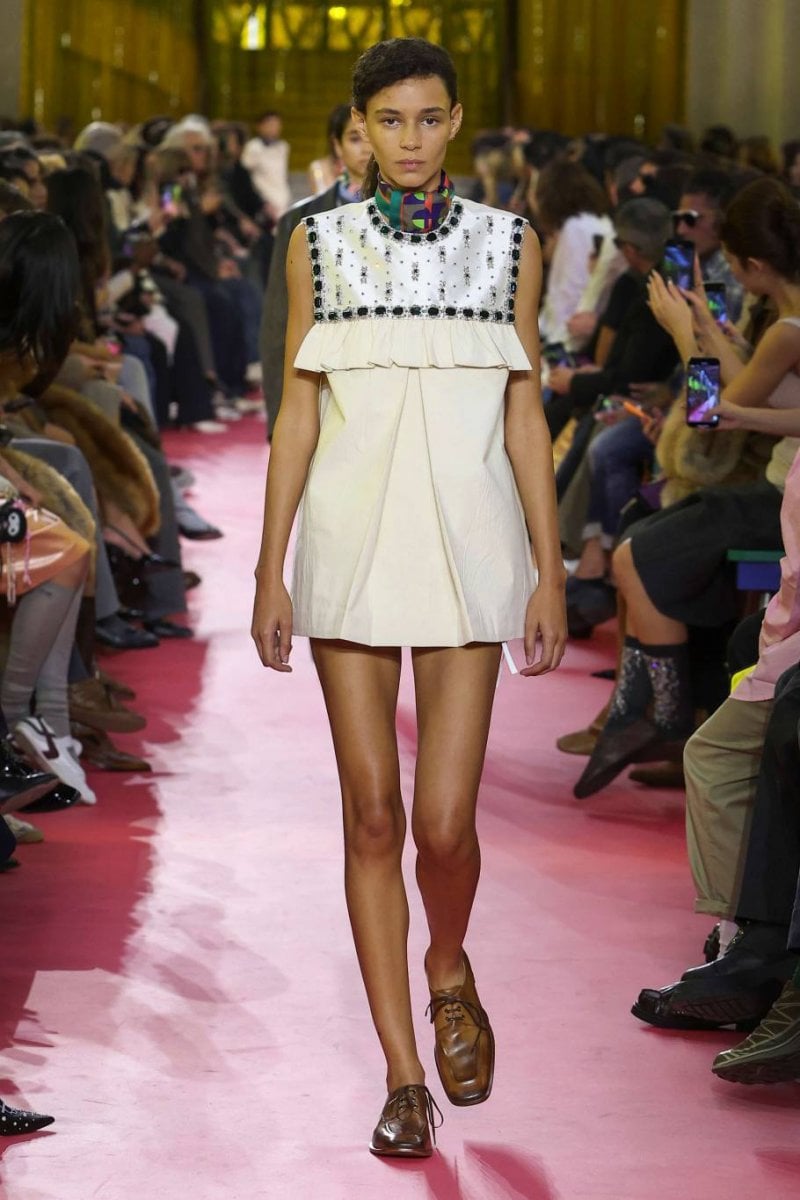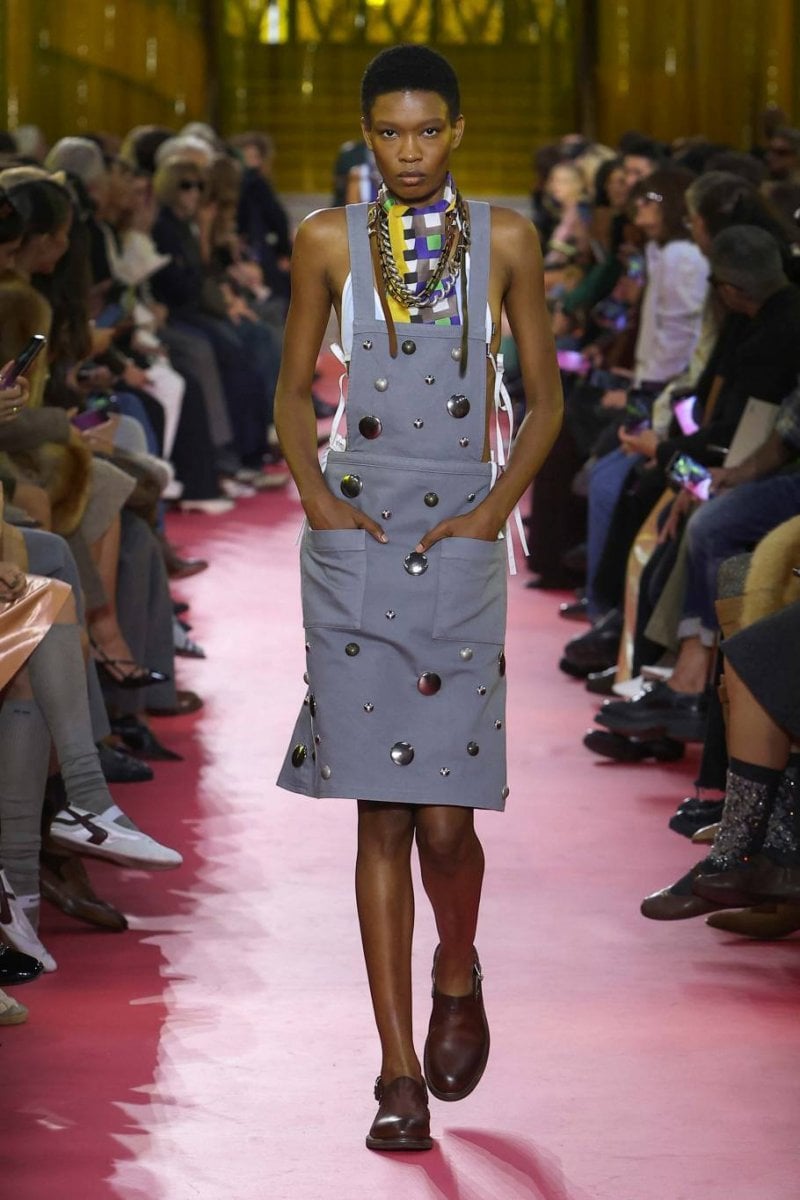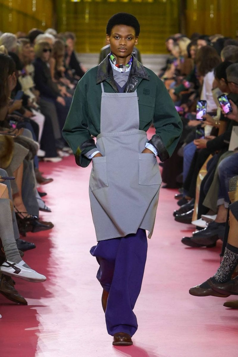 والمريول، باعتباره رمزًا عالميًّا للعمل، لبس حلّة جديدة. عمليّ وزخرفيّ في آنٍ واحد، يتنقّل عبر السياقات بين المنزليّ والسريريّ والصناعيّ، ممثّلًا القوّة والرعاية معًا. وبدلًا من الزهور أو الخطوط، تزيّنت معظم المراويل والفساتين بنقوش دائريّة صغيرة منحت المجموعة طابعًا غير مسبوق. وبدورها، أضافت المواد المستخدمة، مثل قماش الحفر الصناعيّ والجلد وبوبلين القطن وحرير الكلوكيه والدانتيل والقماش الخام المطرّز، إلى المجموعة أصالة ملموسة. أمّا الإكسسوارات المصنوعة من الجلد المتين فأضافت جانبًا عمليًّا وجمالًا صناعيًّا، في حين أضافت الكشاكش لمسة ناعمة ومتمرّدة.