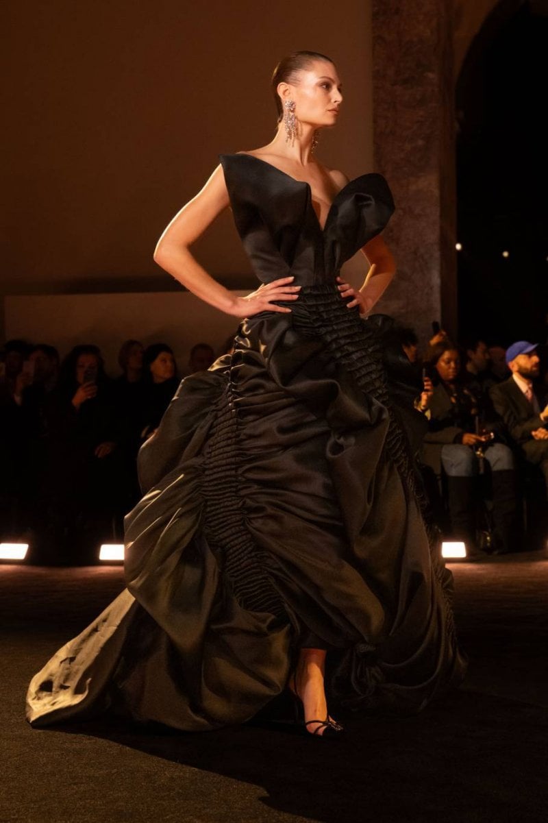 أما الحِرَفية فمذهلة بكل ما للكلمة من معنى: دانتيل مقصوص يدويًا ومشكَّل بنقوش بارزة، تول نيون يتوهّج تحت تطريزات دقيقة، وريش يخدع البصر ويلمع بالكريستال. تبدو كل إطلالة نابضة بالحياة، مشحونة بالحركة والألوان المستوحاة من طيور الجنّة.