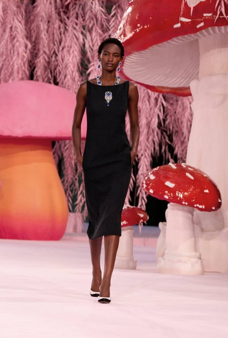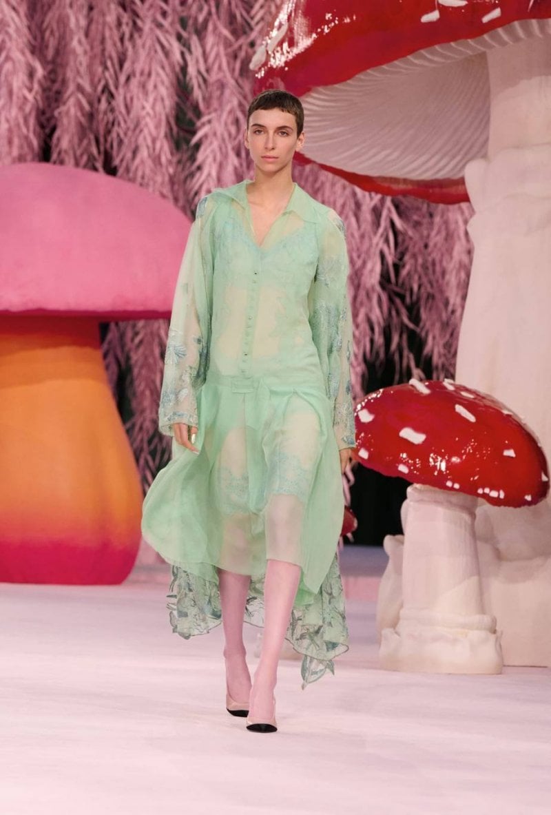 ومع استمرار العرض، شهدنا تحوّلًا رمزيًّا. فتتحوّل النساء إلى طيور: من إطلالات سوداء كلون الغراب إلى ريش ملوّن بغنى مستوحى من الحمام وطير مالك الحزين وطير الطنّان والكوكاتو، حيث يُلمَّح إلى الريش أكثر ممّا يُستخدم فعليًّا. وتجتمع الطيور بين فِطرٍ شاهق في غابة صفصاف مسحورة، ثمّ تختفي في النهاية. للحظة قصيرة، تتوقّف أجواء الهوت كوتور، ثمّ تحلّق بعيدًا. باختصار، حين تختار شانيل CHANEL موضوعًا ما، فإنّ كلّ تفصيل يعبّر عنه بأكثر الطرق سحرًا، ليظلّ إبداع الدار راسخًا في قلوبنا كما تصاميمها.