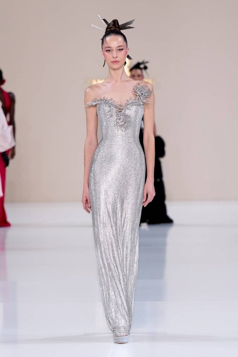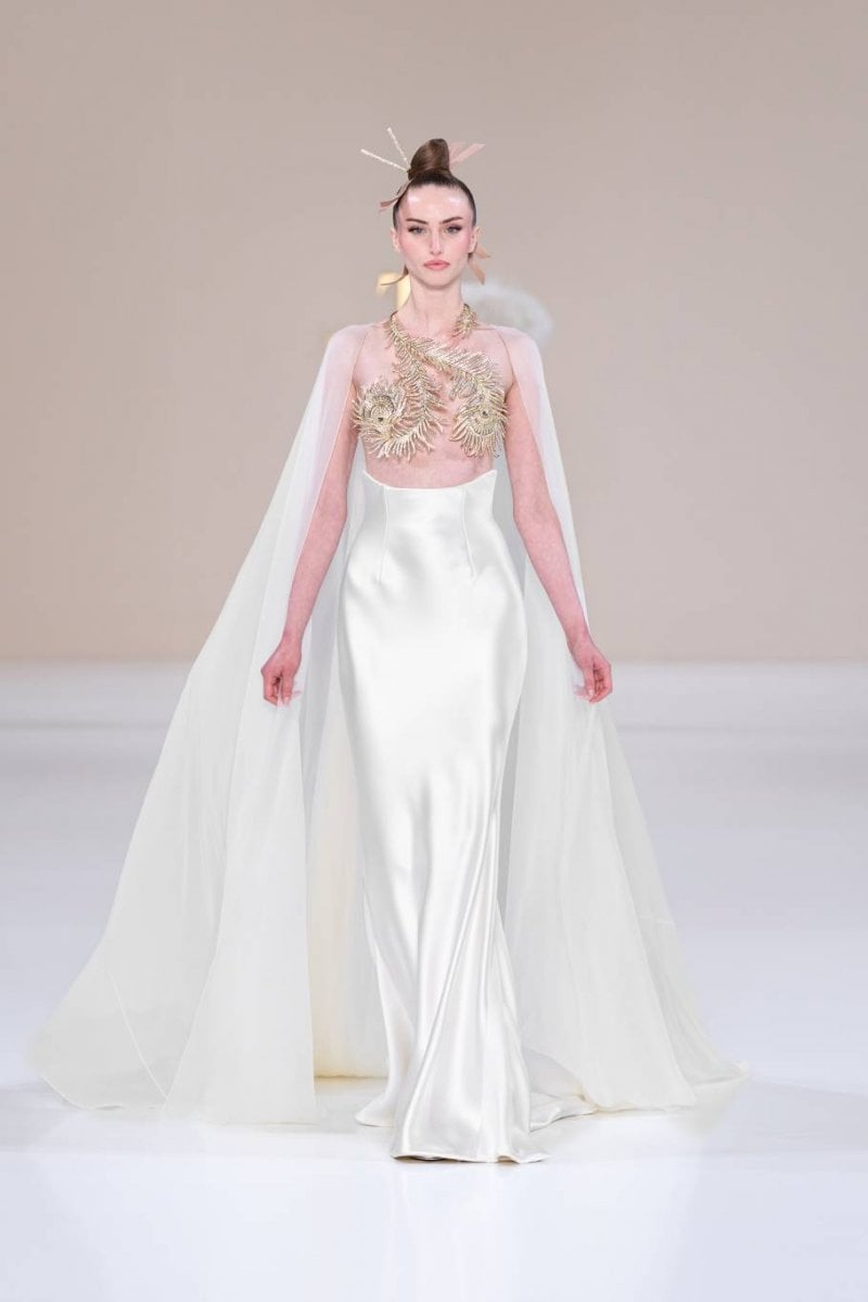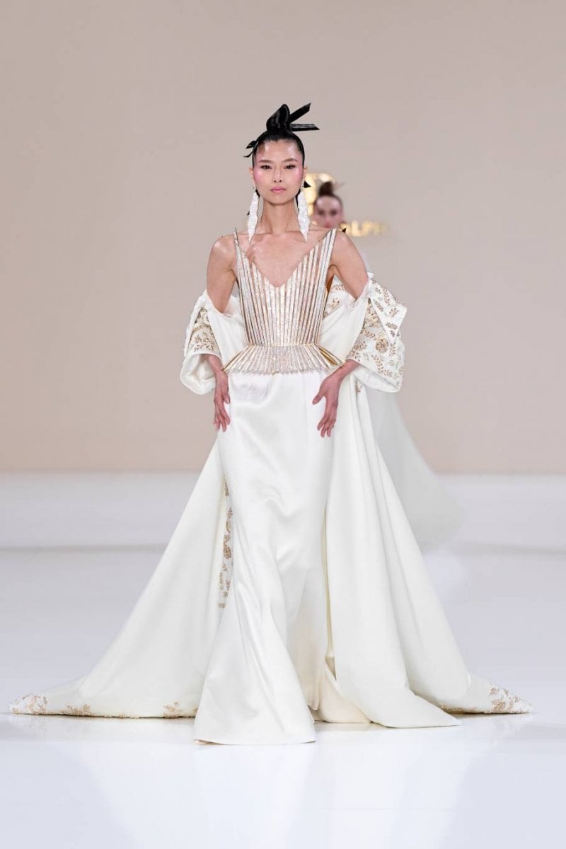 فتنطلق مجموعة الكوتور La Lumière Dorée لتقدّم تحيّة للأناقة العصريّة المشبّعة بتأثيرات آسيويّة رقيقة وحرفيّة كوتور متقنة. وتستلهم القصّات هندسة الأوريغامي المنضبطة، حيث تبتكر الطيّات المنحوتة والبنى الانسيابيّة حركة ذات دقّة شعريّة. ويلعب الضوء دورًا محوريًّا، من خلال انعكاسه في أجزاء لؤلؤيّة وأشعة مشرقة وأعمال معدنيّة دقيقة مستوحاة من ريش الطاووس، رمزًا للجمال والحماية والتجدّد. وتُرسّخ الخامات قوّة السرد وسحره، من جلد التمساح الأبيض النقيّ إلى الساتان الأخضر النعناعيّ الفاتح، إلى جانب لمسات من عرق اللؤلؤ والتطريز المعدنيّ والتفاصيل المذهّبة، في تعبير واضح عن التفاني في التقاليد والحرفيّة.