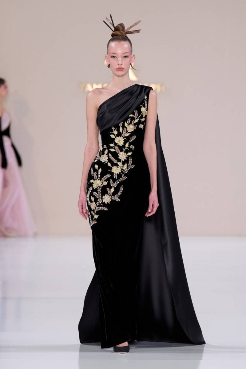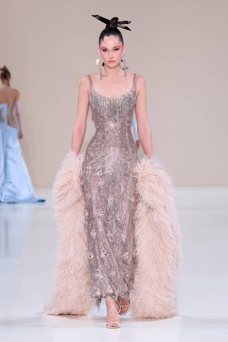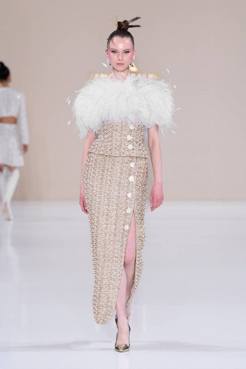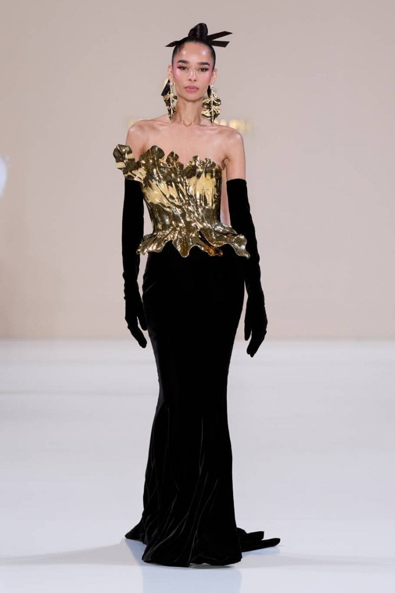 فتنطلق مجموعة الكوتور La Lumière Dorée لتقدّم تحيّة للأناقة العصريّة المشبّعة بتأثيرات آسيويّة رقيقة وحرفيّة كوتور متقنة. وتستلهم القصّات هندسة الأوريغامي المنضبطة، حيث تبتكر الطيّات المنحوتة والبنى الانسيابيّة حركة ذات دقّة شعريّة. ويلعب الضوء دورًا محوريًّا، من خلال انعكاسه في أجزاء لؤلؤيّة وأشعة مشرقة وأعمال معدنيّة دقيقة مستوحاة من ريش الطاووس، رمزًا للجمال والحماية والتجدّد. وتُرسّخ الخامات قوّة السرد وسحره، من جلد التمساح الأبيض النقيّ إلى الساتان الأخضر النعناعيّ الفاتح، إلى جانب لمسات من عرق اللؤلؤ والتطريز المعدنيّ والتفاصيل المذهّبة، في تعبير واضح عن التفاني في التقاليد والحرفيّة.