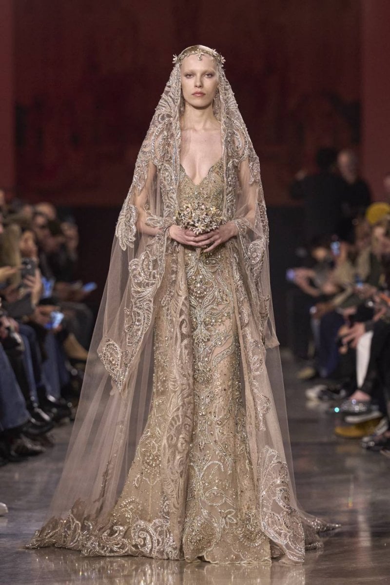 وتحدّد الحرفيّة الاستثنائيّة ملامح كلّ تصميم، مع شيفون متدرّج الألوان يتبّدل مع الحركة، وشبك معدنيّ يعكس بريق النجوم، وأزياء مسائيّة متعدّدة الطبقات تُنسّق مع سترات غير مزوّدة بأكمام أو معاطف مزيّنة بالريش. وتختتم الحكاية بعروس ساحرة بفستان بلون البيج الورديّ، منسوج بالدانتيل ومرصّع بالأحجار مع طرحة خيالية: حالمة، وسهلة الأناقة، ولا تُنسى.
