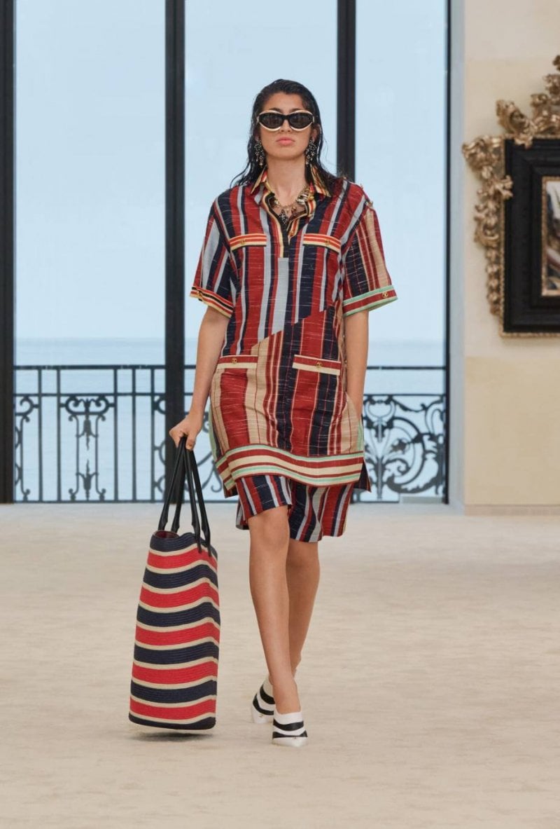 وتُكمل الإكسسوارات هذه الرؤية وترتقي بالإطلالات، حيث تعكس فكرة السفر والتنوّع من خلال حقائب صغيرة وتصاميم مقاومة للماء وسلال شاطئيّة كبيرة مخطّطة. وتتراوح الأحذية بين تلك ذات الكعوب بأسلوب آرت ديكو وتصاميم مستوحاة من المشي حافية القدمين، فيما تعكس المجوهرات عمارة بياريتز وعالمها البحريّ، مع أقراط على شكل أصداف ولآلئ.