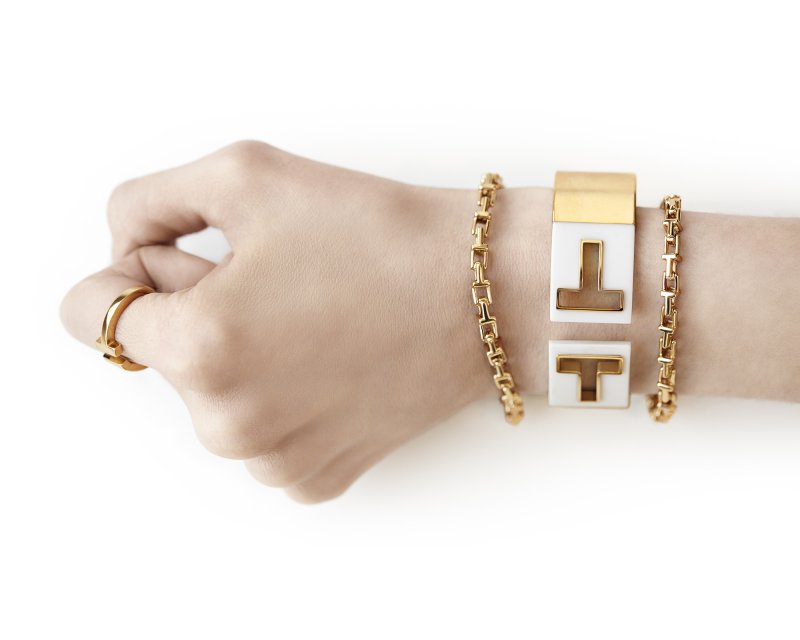 Made of 18-carat pink, yellow or white gold, Tiffany T jewelry pieces take the shape of a beautiful, simply curved T letter. The collection features fine bracelets, bangles, ascending chains, pendants, rings and earrings that carry a fine poetic touch. While the pieces are also available in pure silver, Amfitheatrof included warm white and striking black colored porcelain in some designs.
