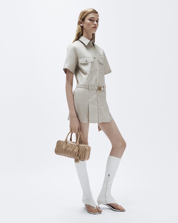 Inspired by the charm of underwear worn as outerwear, the precision of men’s tailoring, and the ease of sportswear, all stripped revealing the essence only, Miu Miu released a new collection. The Miu Miu L’Été collection has that contemporary flair where masculine and feminine traces contrast on different marvels, creating a functional fashionable wardrobe not to be missed. From loose sky-blue and khaki cotton shirts to micro-shorts, safari dresses, jackets, and slashed skirts, we witnessed a play with proportions like no other.