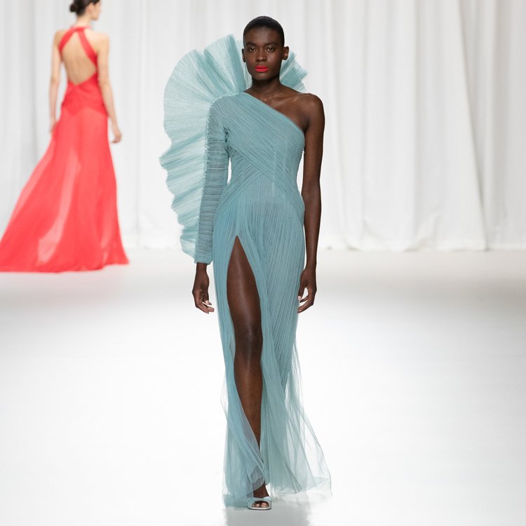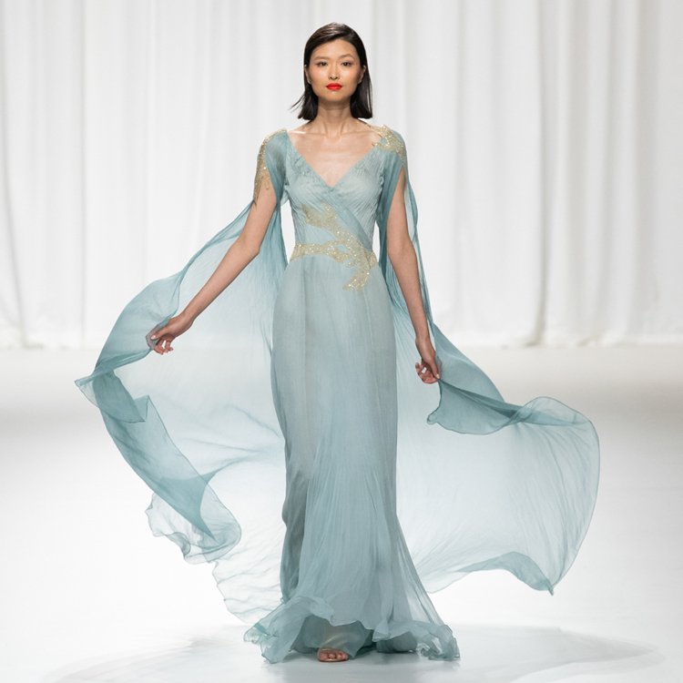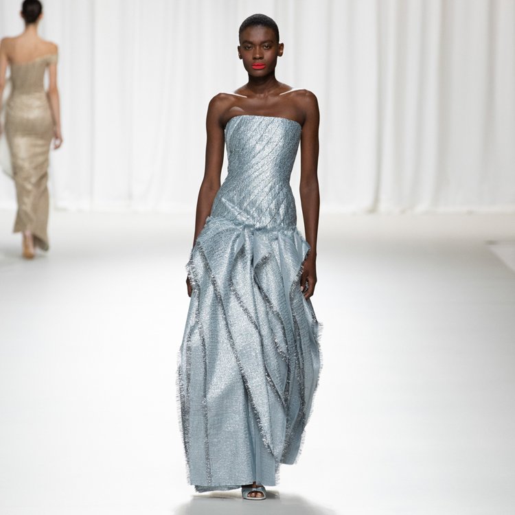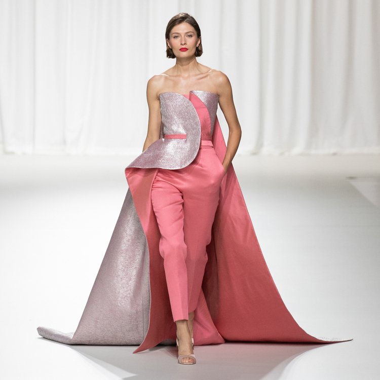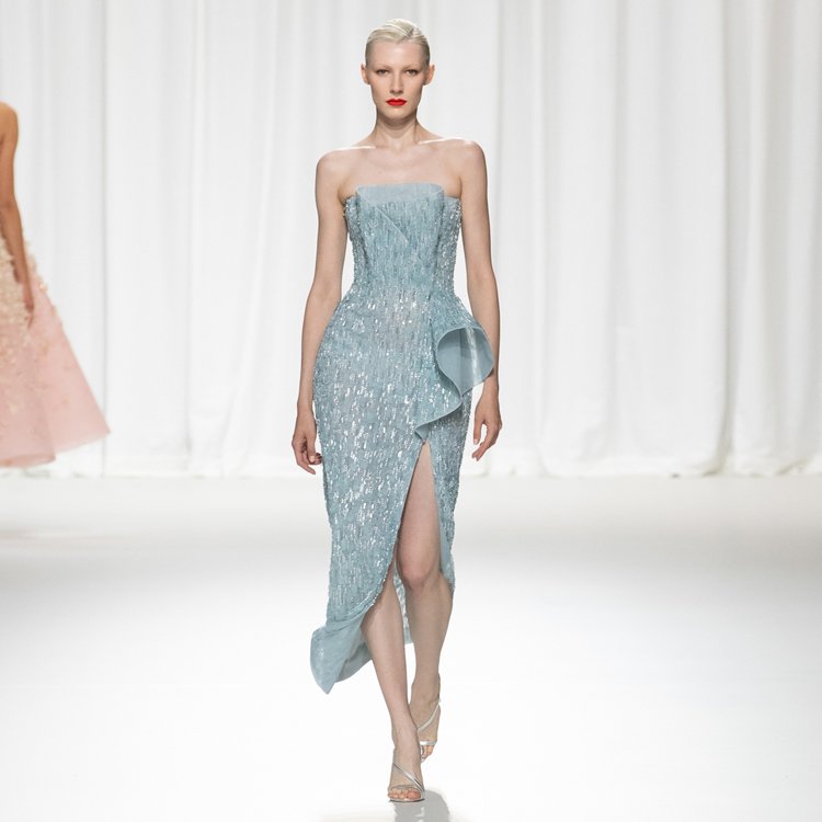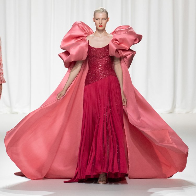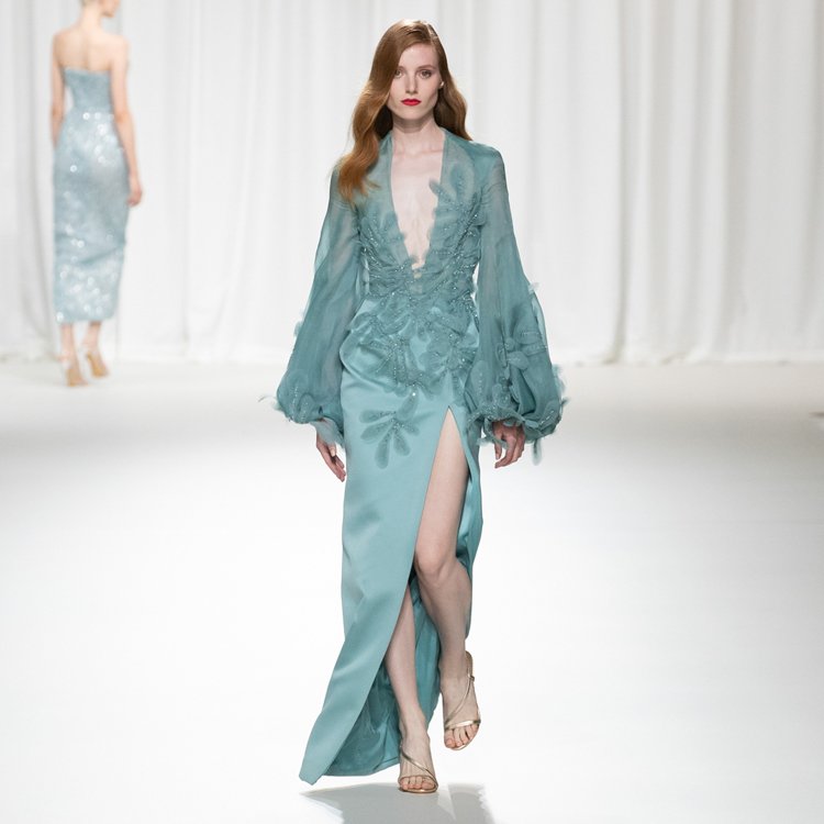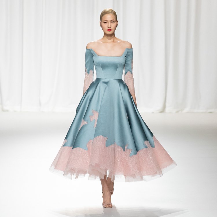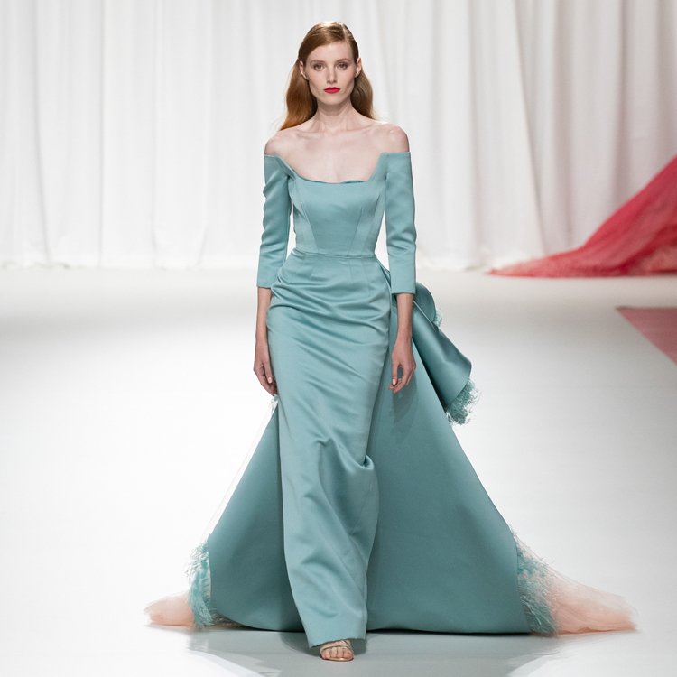 The exquisite collection revolved around striking sculptural shapes, dynamic layering, flowing lines and impeccable workmanship in a style that is faithful to the fashion house’s design codes. With this in mind, the runway witnessed voluminous multi-layered skirts, tea-length mini-dresses and sharply tailored jumpsuits that redefine contemporary femininity. Delicate fabrics such as taffeta, satin and double-faced silks mingled with soft silk muslin, tulles and tweed to create the perfect balance, while a wonderful color palette of teal, sky blue and raspberry hues was effortlessly complemented with blush pink, ivory and champagne beige to evoke a sophisticated sensibility and depth.