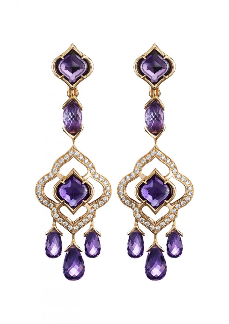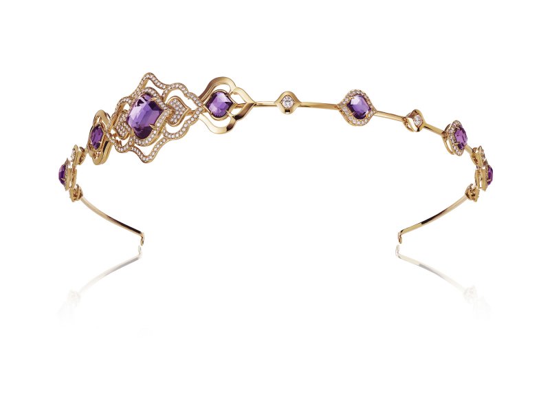 The new capsule collection gives wearers the opportunity to variously interpret the jewelry pieces through their imagination. Honoring the baroque spirit of the line, this collection includes five exceptional pieces – a 7-carat diamond-set watch, amethyst-beaded earrings, a 6-carat amethyst-set ring, a 6.7-carat amethyst-set necklace and tiara – to be worn alone or together.