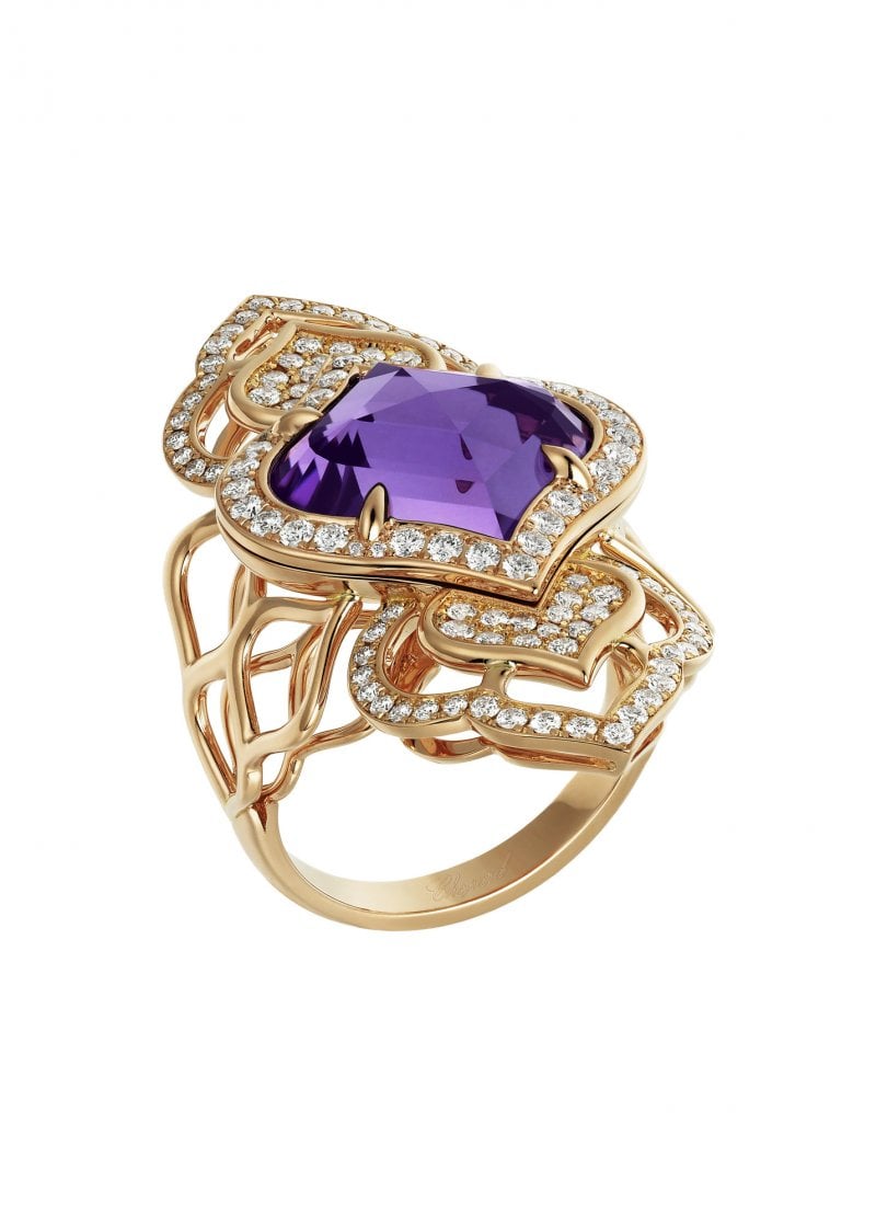 Echoing the power of the Roman Empire, the contemporary pieces reflect a sense of sophistication through the rich, delicate detailing. The interwoven three-dimensional rose or white-gold lacework adorned with amethysts – the emperors’ favourite color in the Byzantine era – outlining a decorative design is reminiscent of embroidery work found on the hangings and cushions on which emperors placed their insignia. Taking part of every piece of the collection, the Imperiale motif gives the line a powerful and royal feel fit for a modern empress.