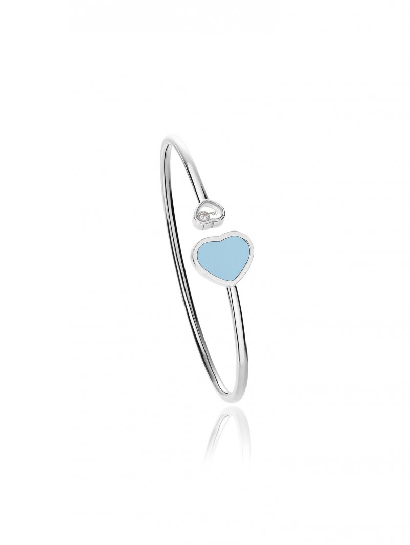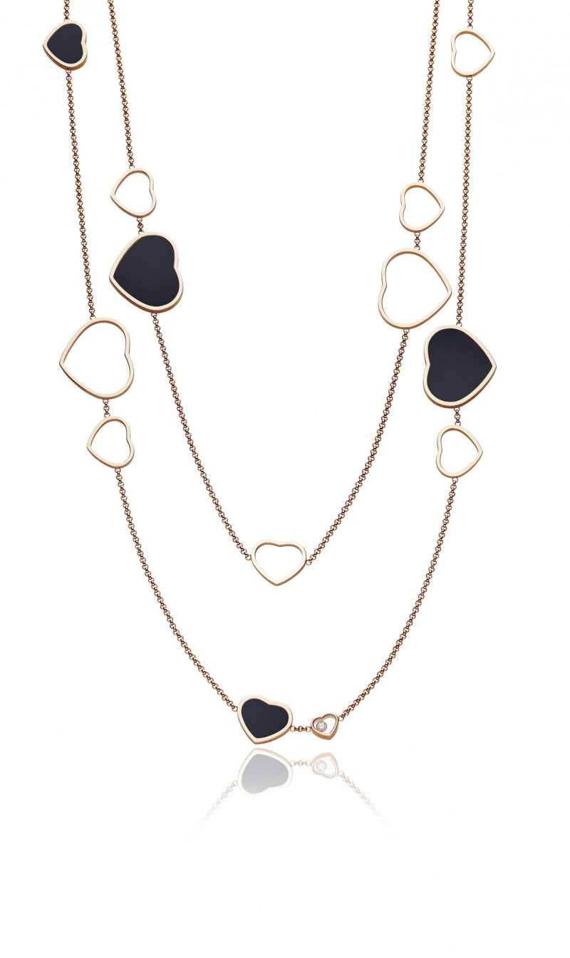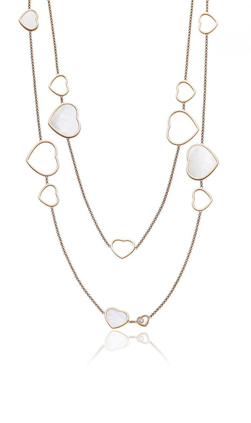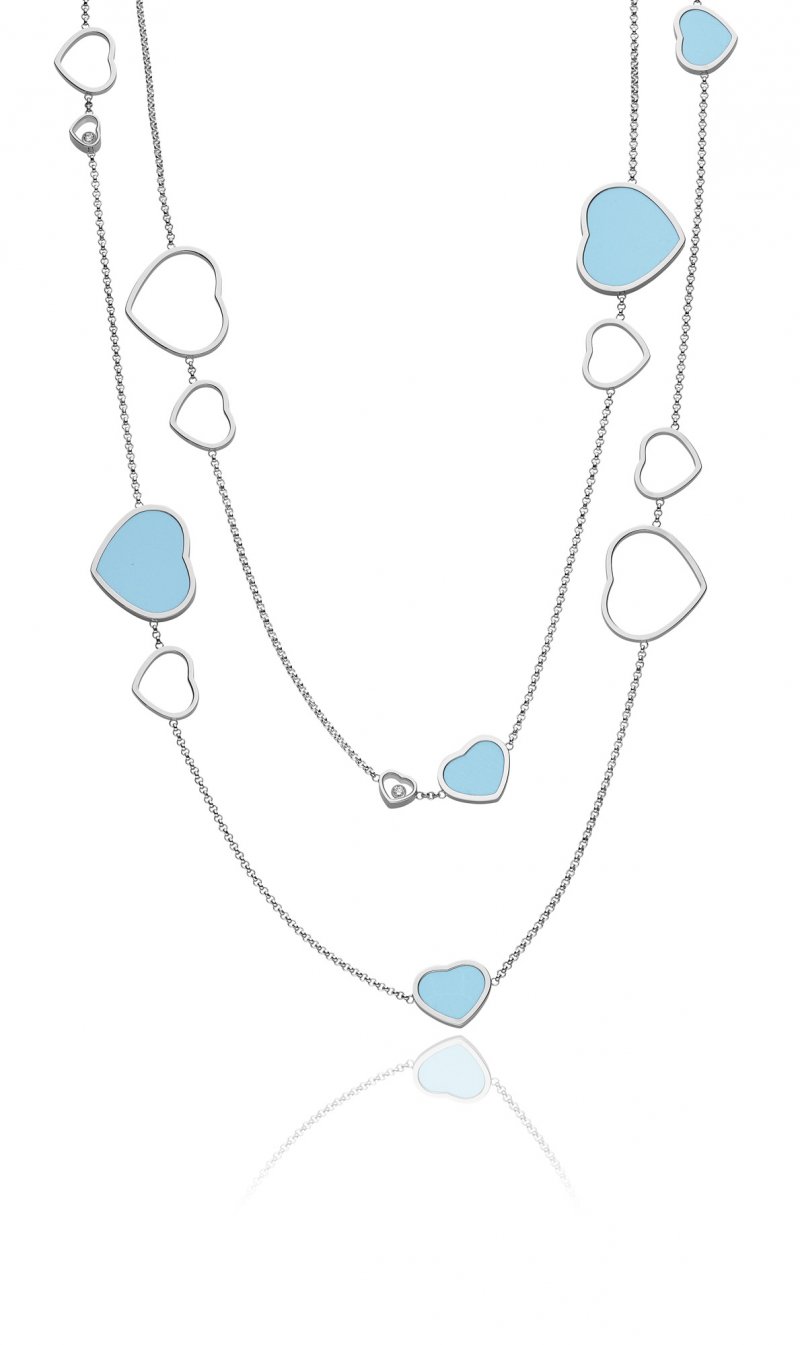 Inspired by nature, the new floral “Happy Diamonds” jewelry pieces reinterpret pop-art flowers with a modern flair and include a pendant, a ring and a pair of earrings available in 18-carat white or rose gold. Celebrating its passion for hearts, Chopard revisited the cherished motif and created a new look for it in the “Happy Hearts” collection. Considered a lucky charm, the heart was combined with precious colors. Therefore, the traditional openwork of the heart morphed into turquoise, onyx or mother-of-pearl featured in a thin white or rose-gold chain.