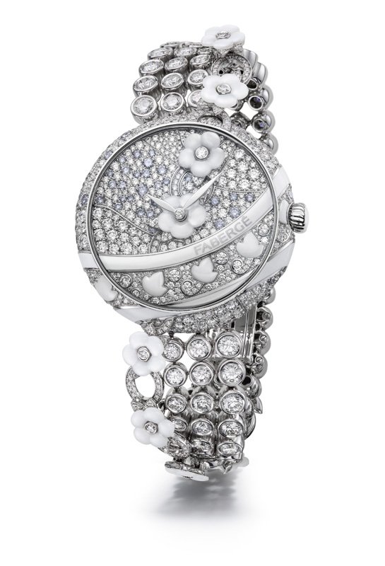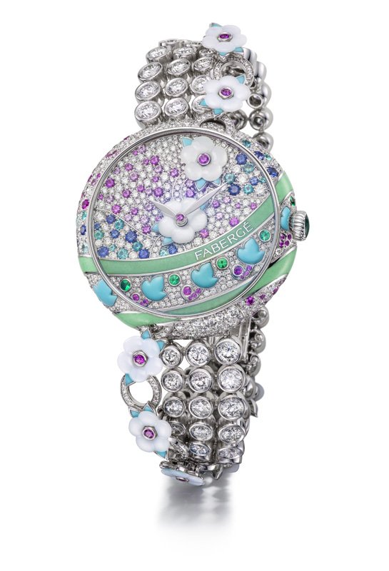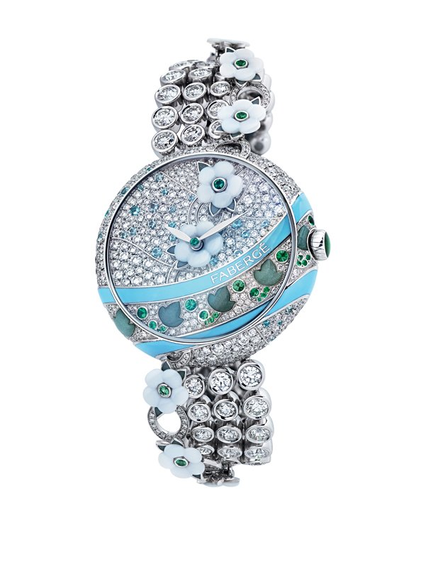 Earlier this summer, Fabergé launched a cheerfully breezy collection of high-jewellery and bejewelled timepieces entitled ‘Summer in Provence’. The white gold jewellery watches adorned with diamonds, multi-coloured sapphires and turquoise resemble a garland of flowers woven with lovely little flowers on a breezy summer afternoon in Provence. Tiny mother-of-pearl flowers meander amidst a sprinkling of leaves and along a rounded pebble-like dial, which features monochrome ribbons in Grand Feu enamel. Emblazoned with the brand’s name, the dial is embellished with snow-set coloured gemstones and hard-stone micro-sculptures. Round white diamonds shimmer on the bracelet strap playing with light, while the transparent case back of the countered watch reveals the interiors of its calibre to showcase the artistry of watchmaking.