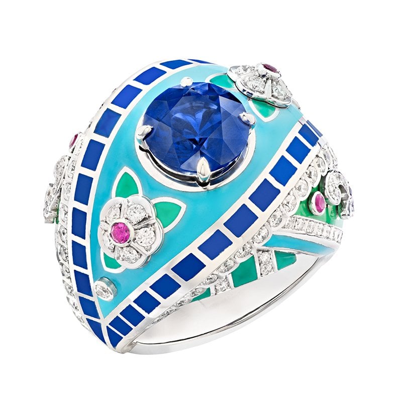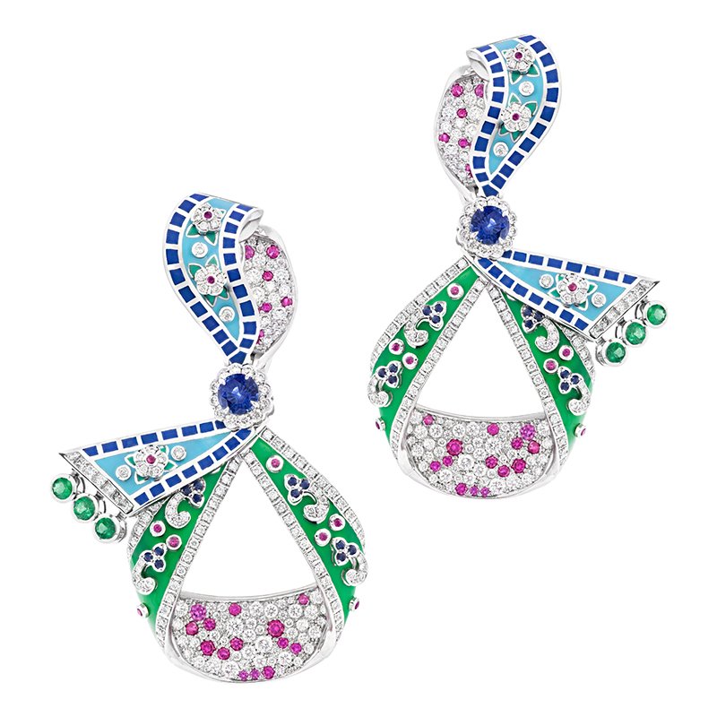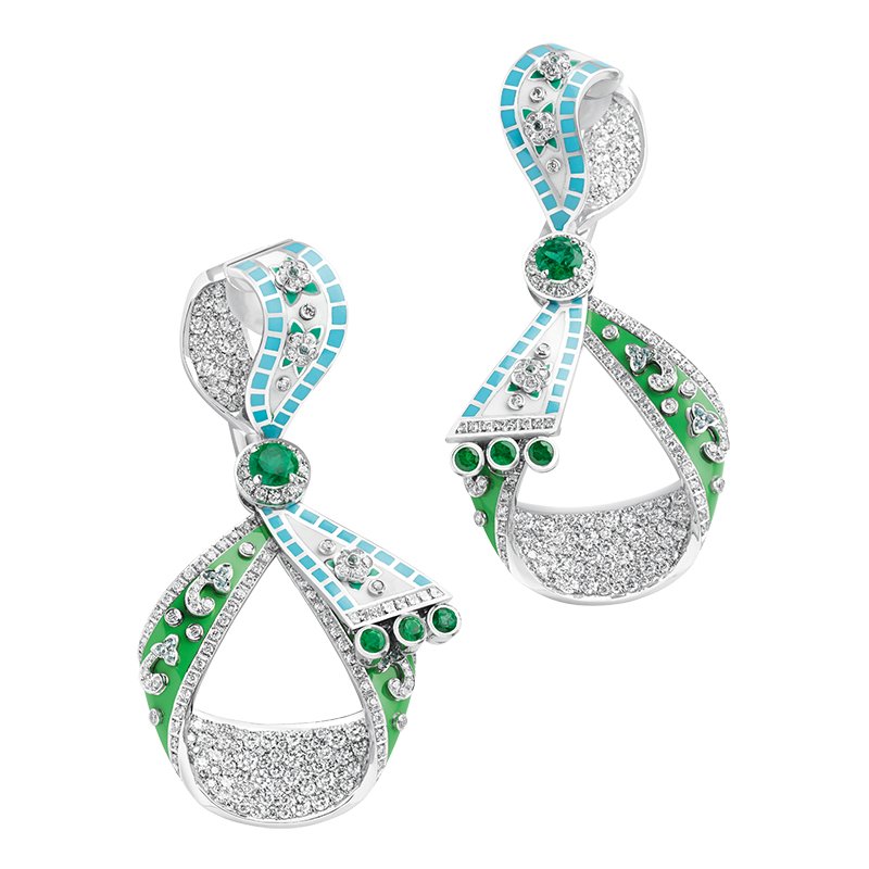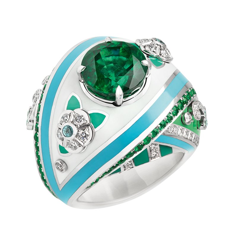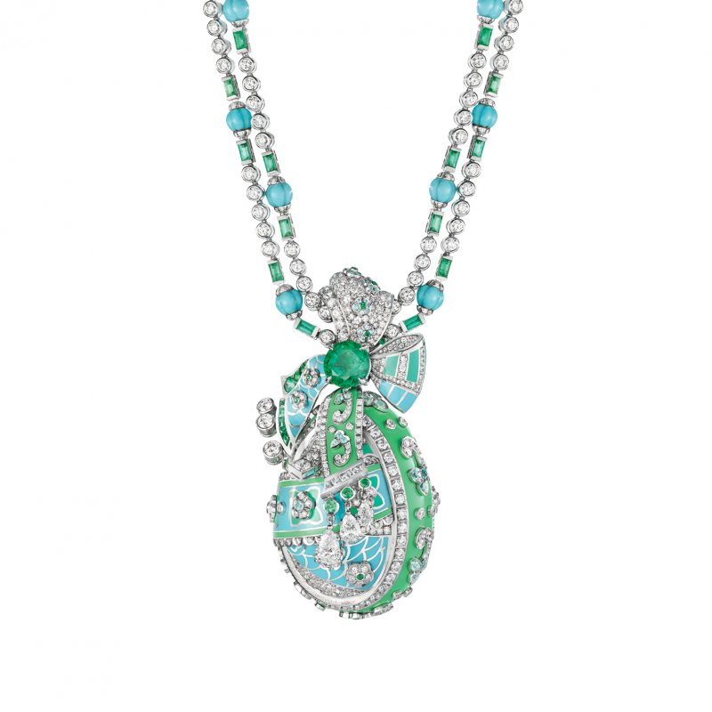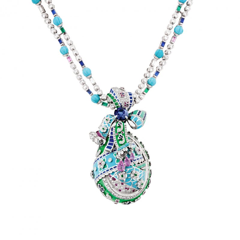When you have watches so pretty, you’d want jewels to match. Which is why the Maison brought out a matching suite of jewels composed of a necklace, earrings and rings. The necklace features floral motifs adorning a detachable Fabergé egg that dangles on a bow that ties up a long chain made of emeralds, turquoise beads and diamonds. The textured creations also have a pretty ribbon that mirror the contrasting bright colours woven fabric of summer dresses.