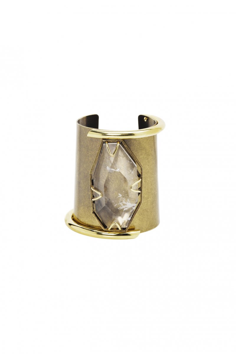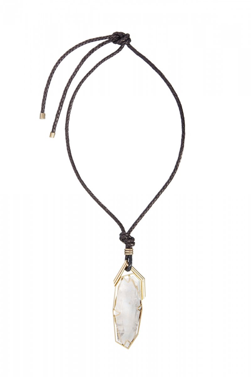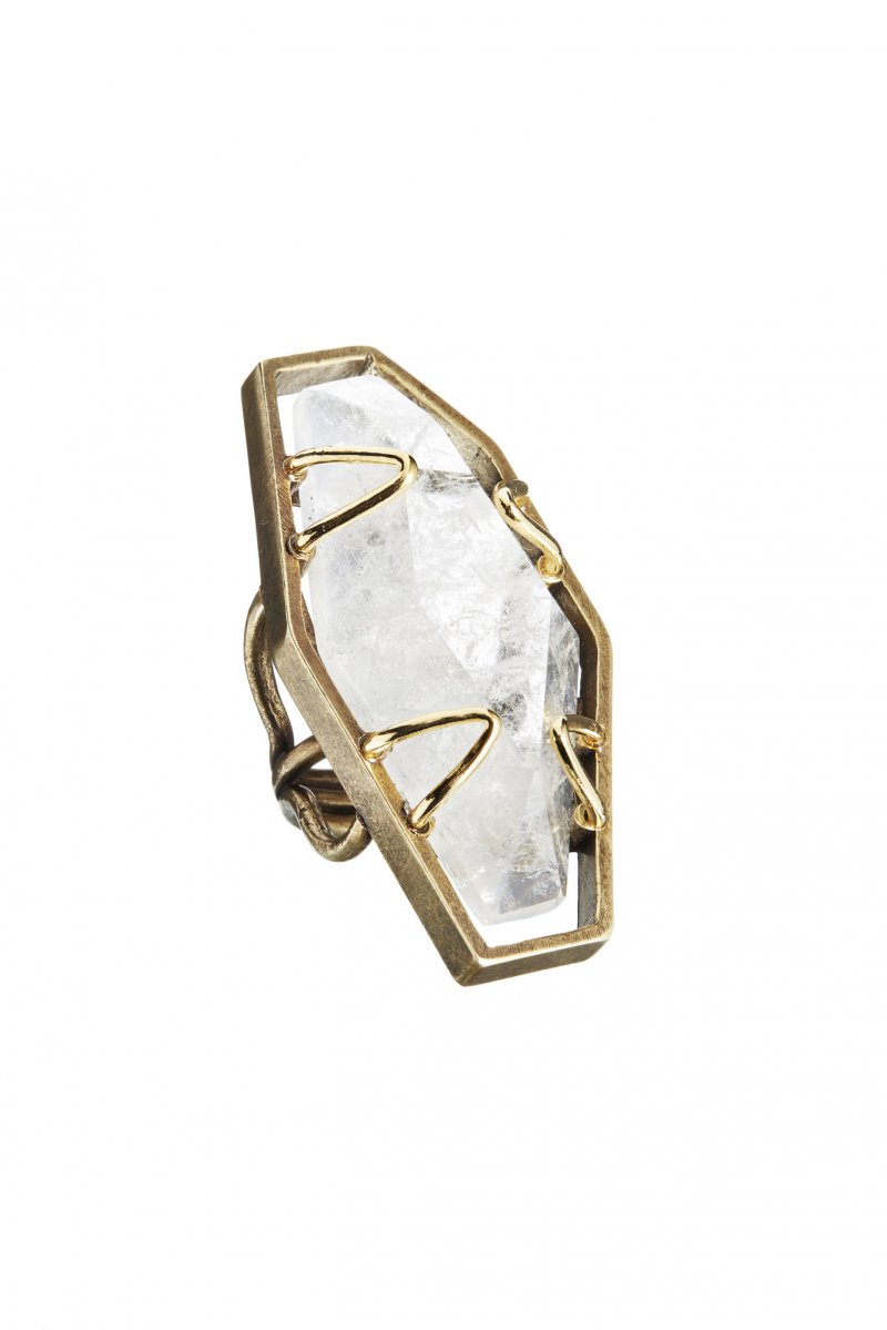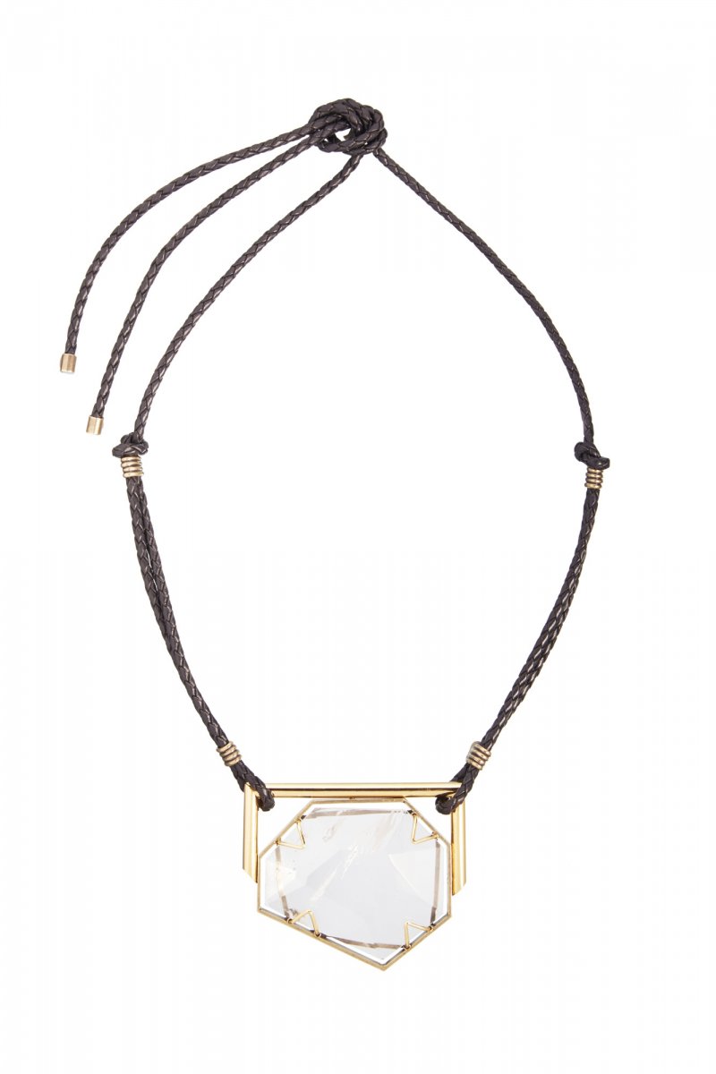 Made of semi-precious stones, rock crystals or smoked quartz are set in metal cages with a graphic and industrial feel reflected through the sharp edges of the piece. Coming in the form of a pendant or a choker attached by cords, this new line also features bold rings.