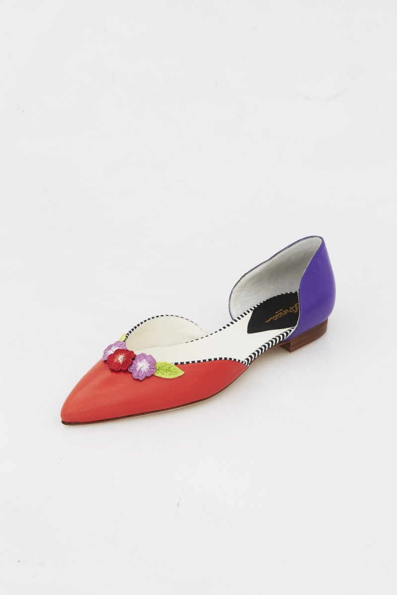 Carlotta ballerina and Fioli Mary Jane showcase a cherry blossom pattern on aqua blue or lime green nappa, while shedding the light on an extremely sophisticated embroidery.