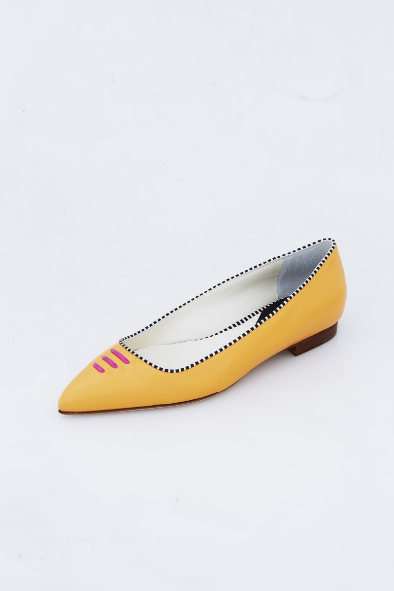 However, what would a shoe collection be without classic and chic ballerinas? Arnaa presents Wei in red and purple with flower embroideries and Yeomiji in black or orange version with leather lace. All of which showcase a black and white piping profile as distinctive detail.