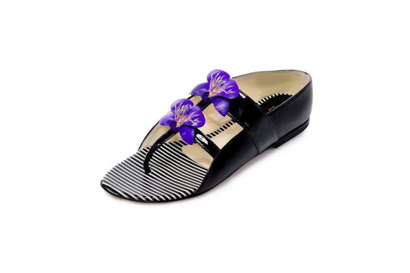 The diversified collection puts into sight the Jaya and Taranto black shiny nappa sandals garnished with pink and blue embroidered leather orchids.