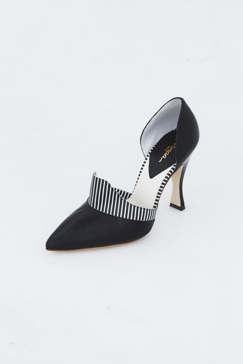 An ode to the 50’s is clearly portrayed in some of the designs, combined with a palette of contemporary colors: Suva, a fuchsia pump with a striped tongue and glossy black heels, Malacca, a black d’Orsay pump in nappa with black and white details. On the other hand, Kirsten introduces a colorful mix of orange and pink, while the Lotus mule presents a mix of purple and lime green.