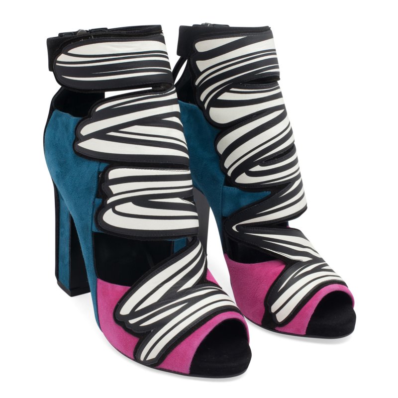 The collection features couture bows on sneakers and “brush strokes” prints on classic sandals. If we were to compare his work to a place, it would be an eclectic art lounge. Pierre Hardy uses the element of surprise to create a wave of double-edged graphic effects, contrasting motifs and innovative constructions.