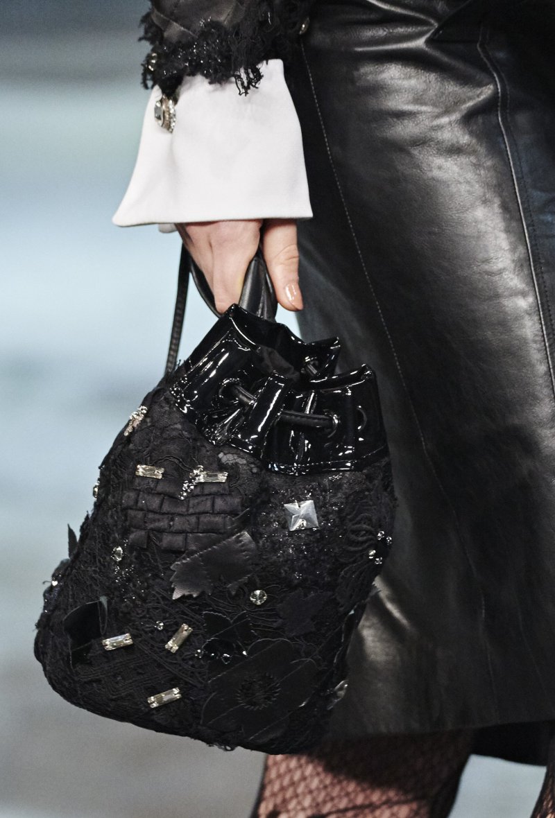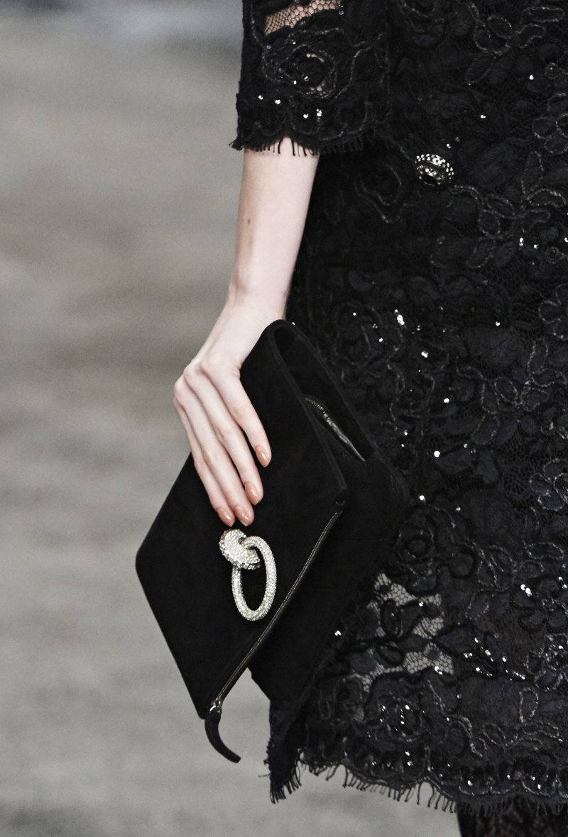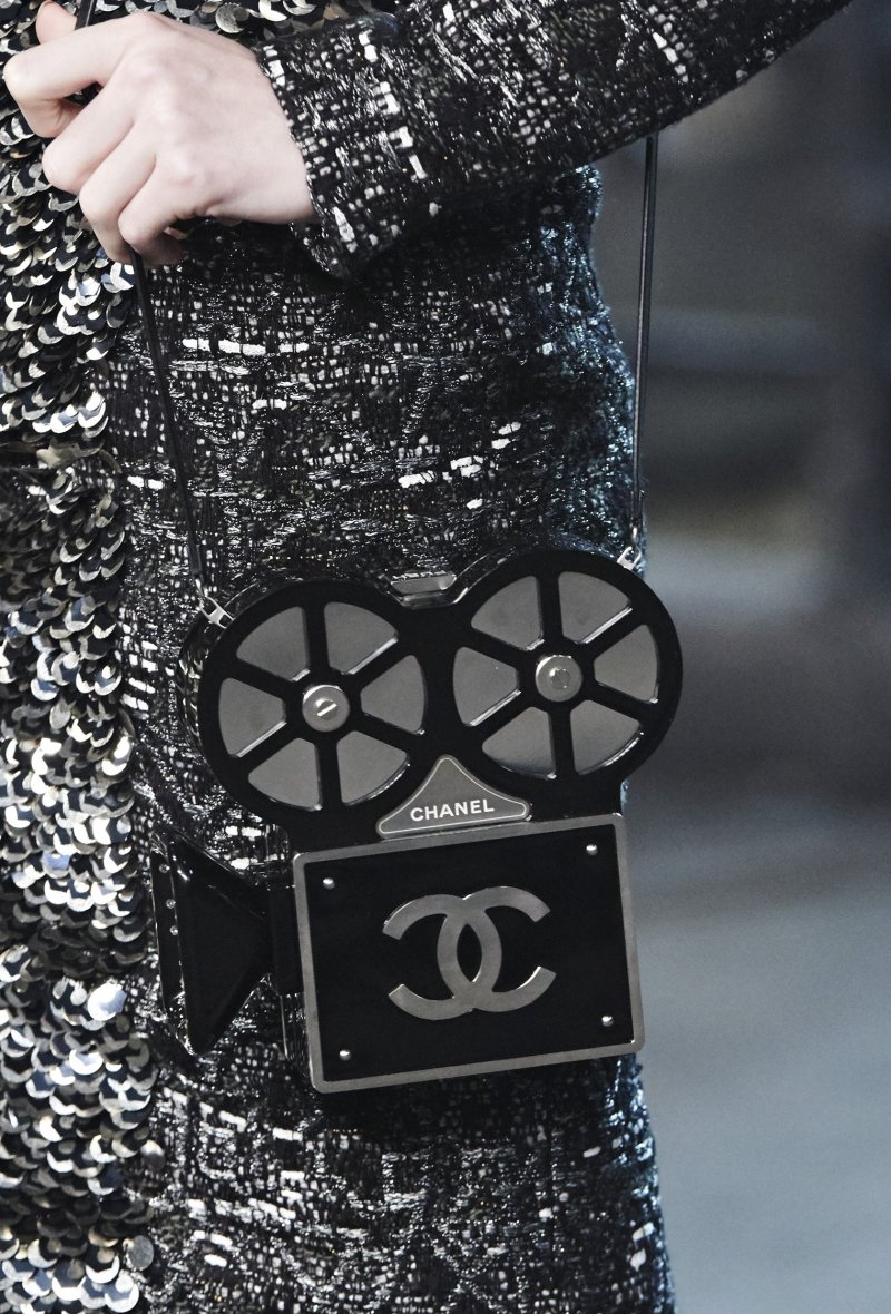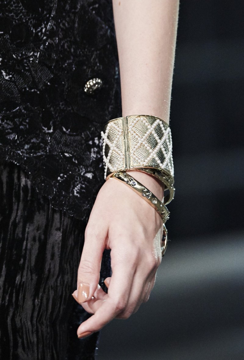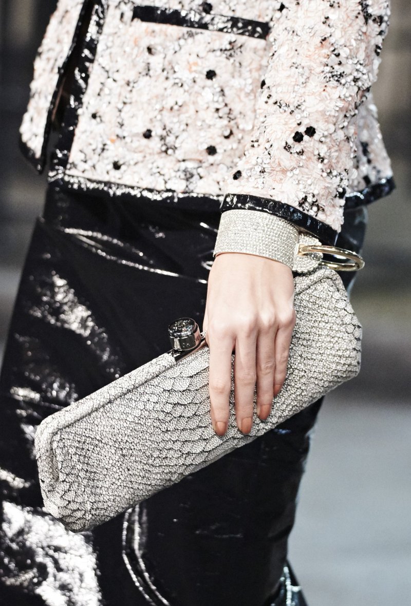 Sticking to the iconic Chanel baseline, Lagerfeld sprinkled a dash of Italian glamour to the designs and of course the accessories. One couldn’t help but notice the prominence of the accessories used in the show, adding the finishing touch to every outfit displayed. But what struck us the most was their unique aura. You could actually spot their originality from miles away, starting with the quilted or pearled metal cuffs, moving on to the large hoop earrings, the multi row grey pearl long necklaces underlined with a satin bow, and ending with the ever so eclectic camera bag, and the pearl embroidered shoes.