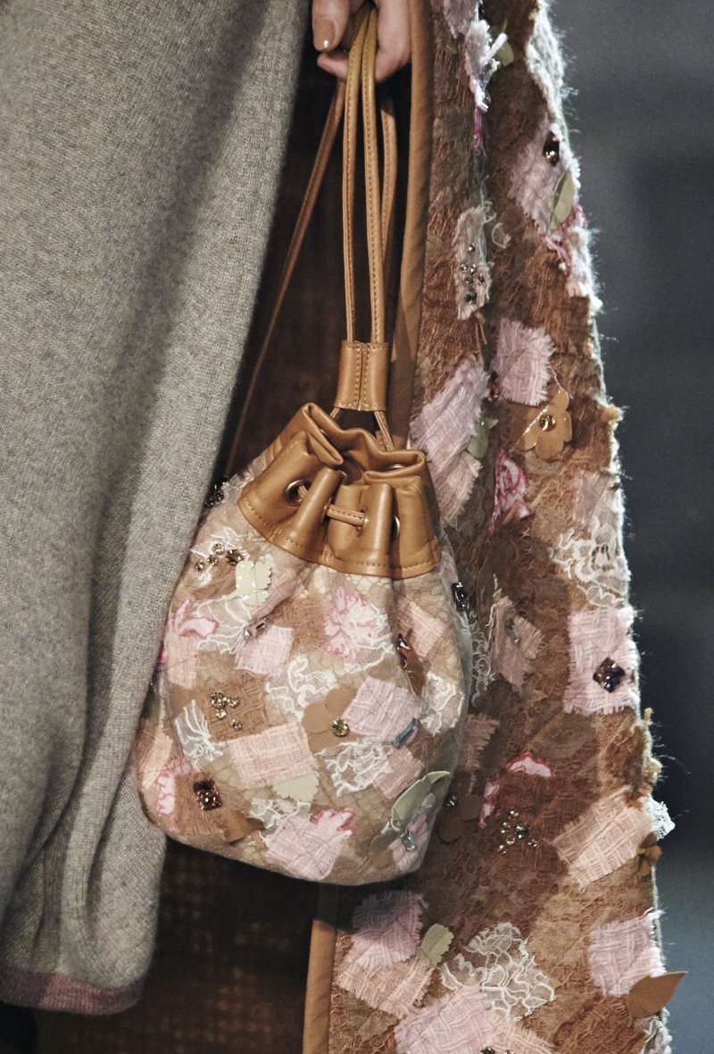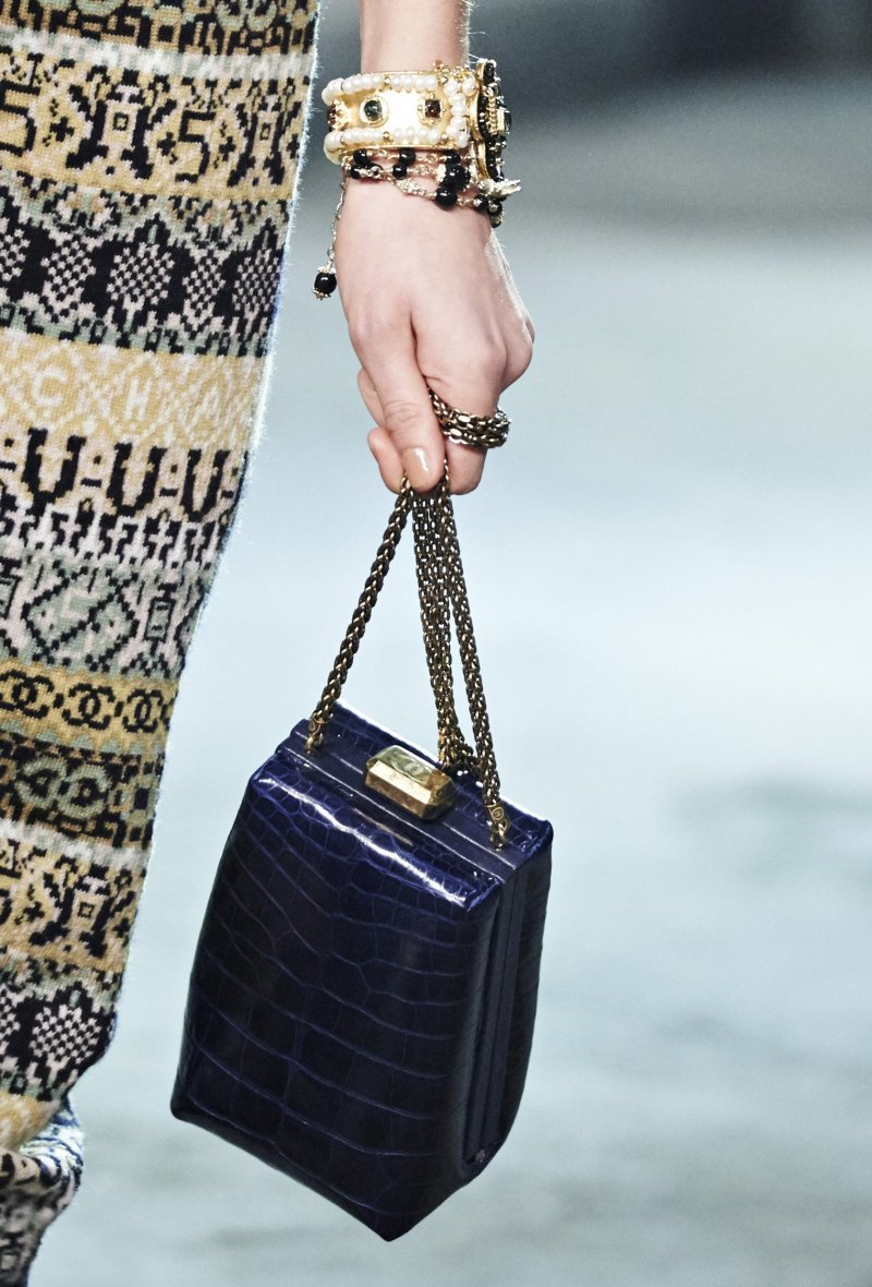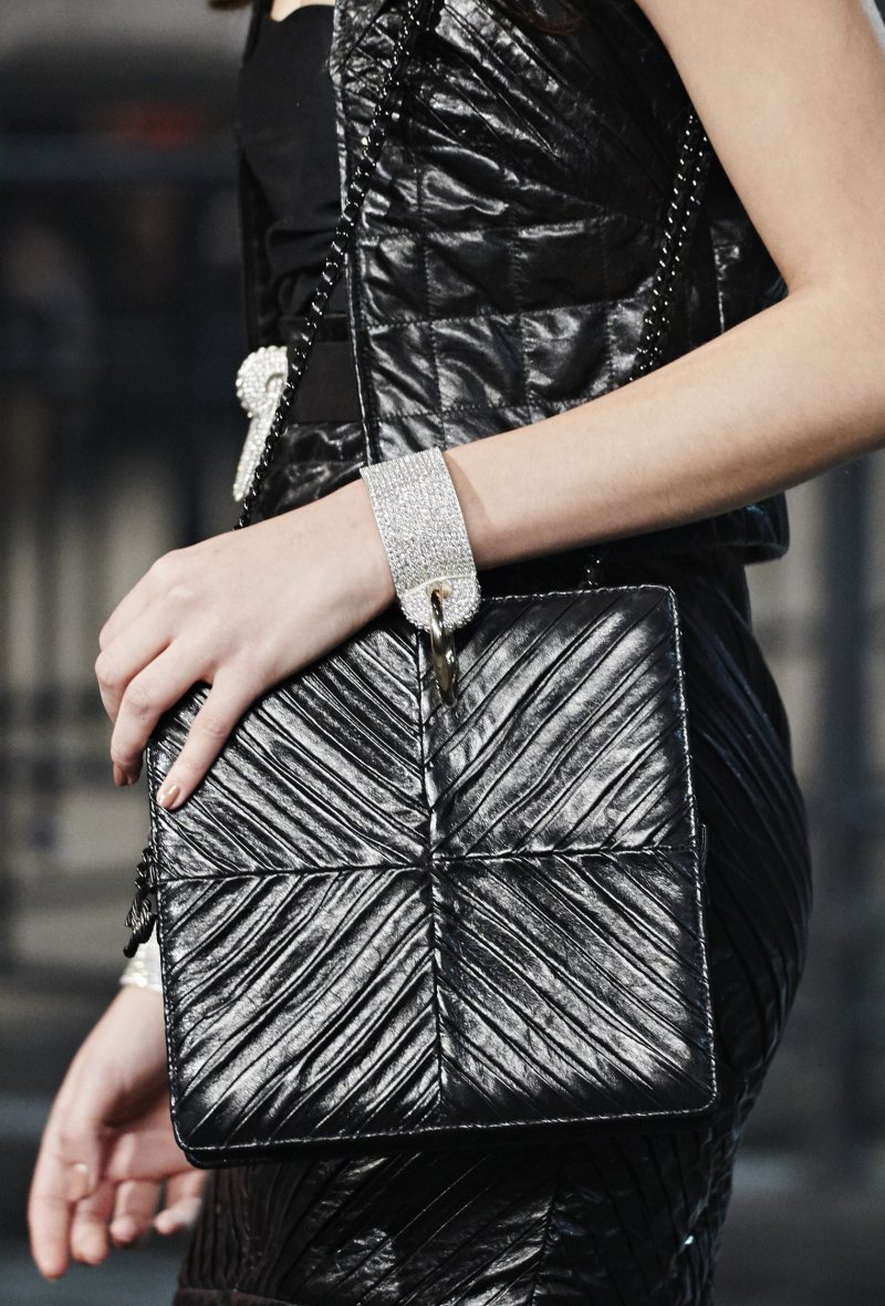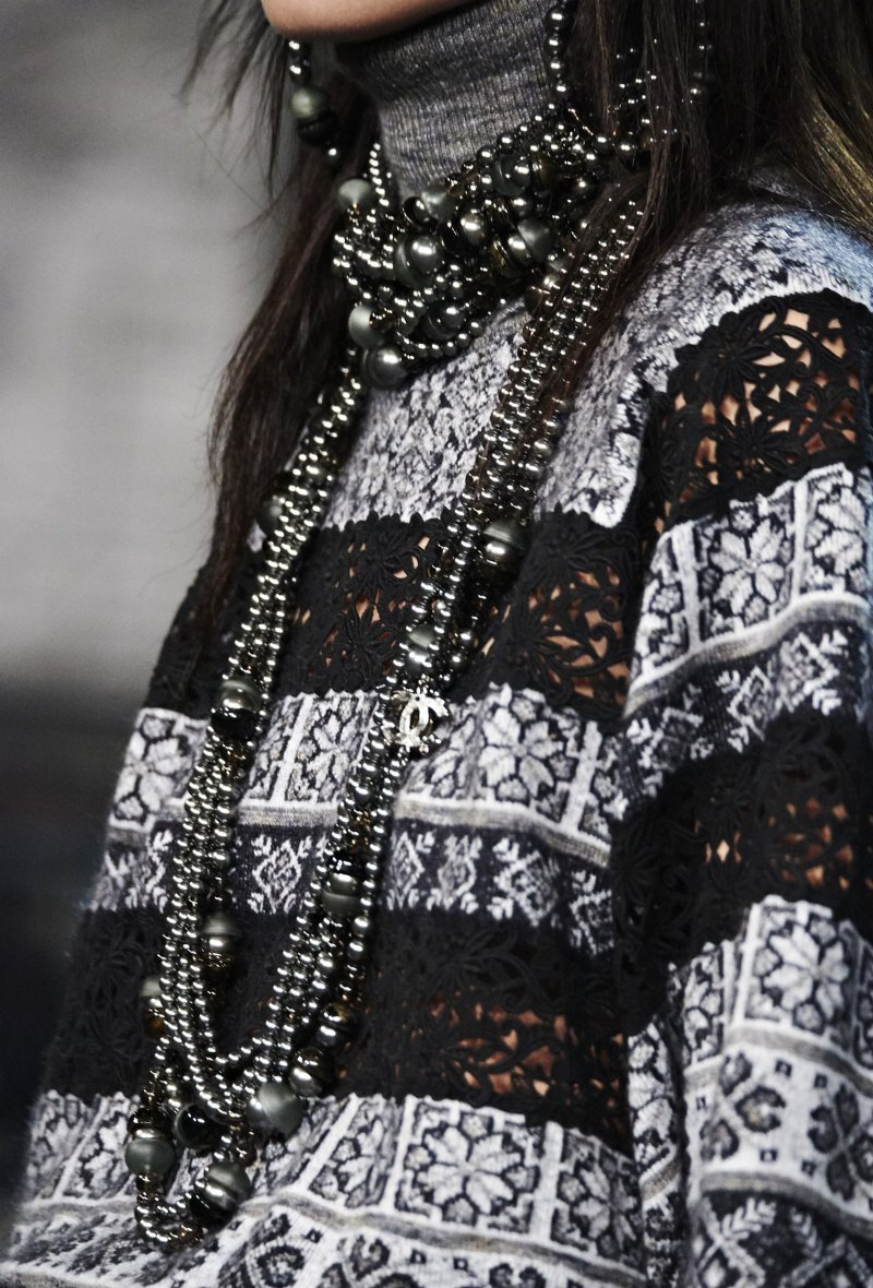 Sticking to the iconic Chanel baseline, Lagerfeld sprinkled a dash of Italian glamour to the designs and of course the accessories. One couldn’t help but notice the prominence of the accessories used in the show, adding the finishing touch to every outfit displayed. But what struck us the most was their unique aura. You could actually spot their originality from miles away, starting with the quilted or pearled metal cuffs, moving on to the large hoop earrings, the multi row grey pearl long necklaces underlined with a satin bow, and ending with the ever so eclectic camera bag, and the pearl embroidered shoes.