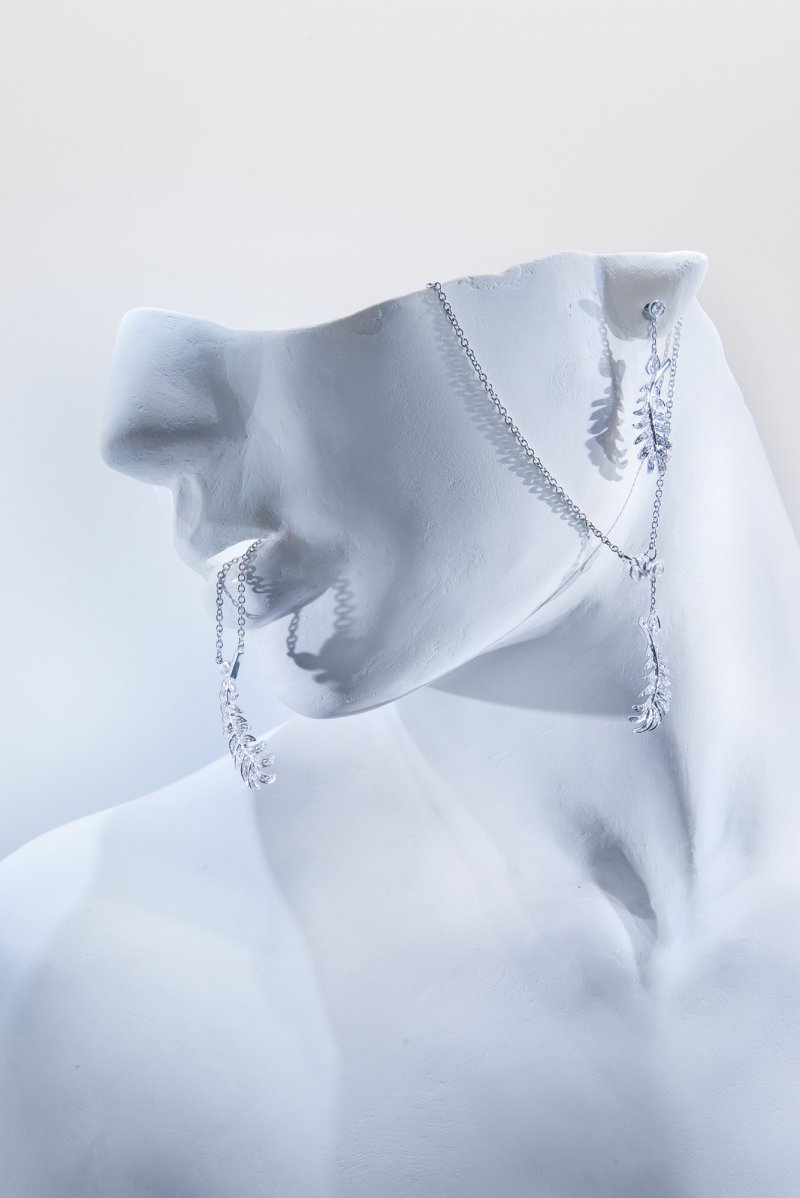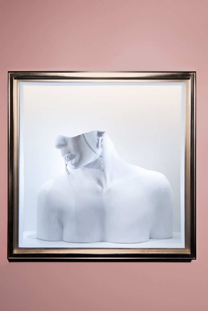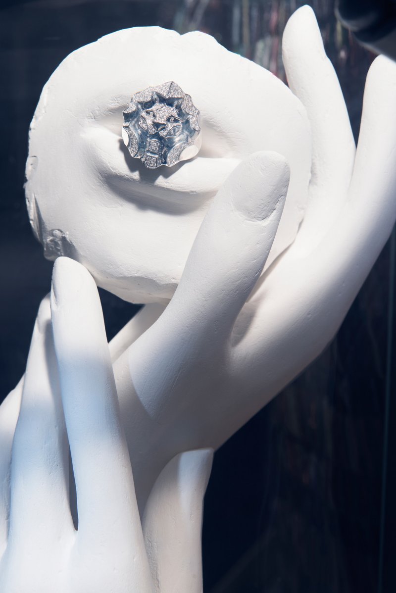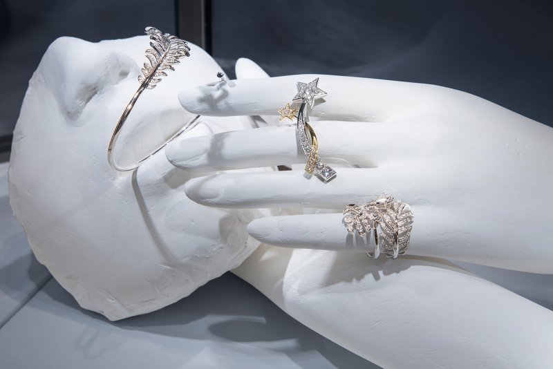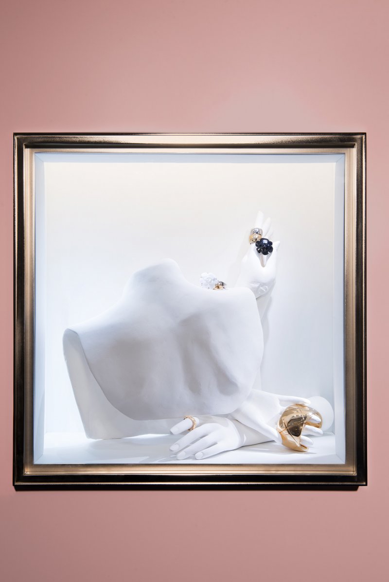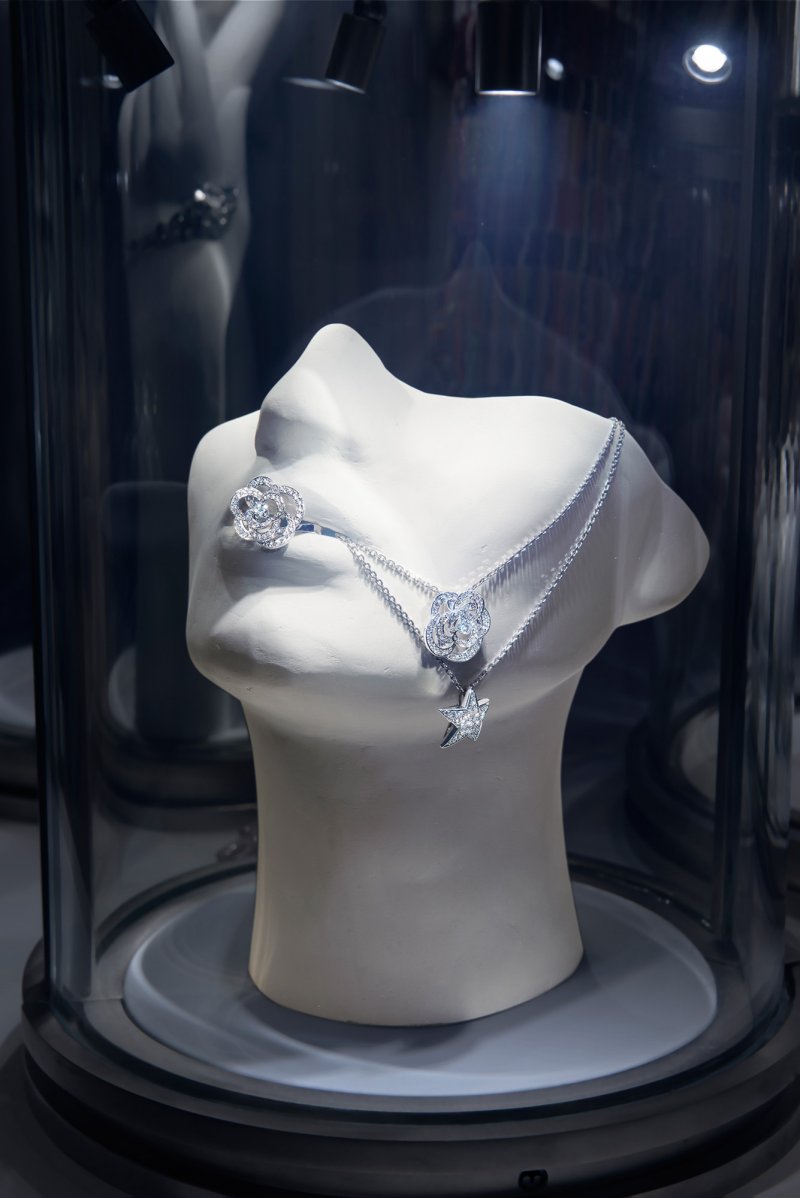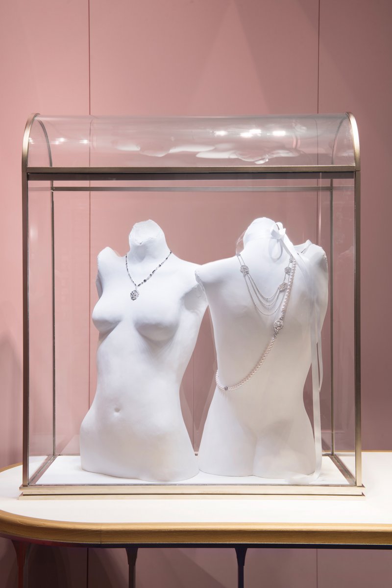 In order to bring back Gabrielle Chanel’s innovative jewelry concepts to life, parts of the female body have been sculptured into feminine gestures and attitudes: a nude back is adorned with a long necklace and a brooch is bitten by a mouth. The pieces on display are inspired by themes that have always been cherished by the house, such as the feather, the quilting, the lion, the camellia and the comet.