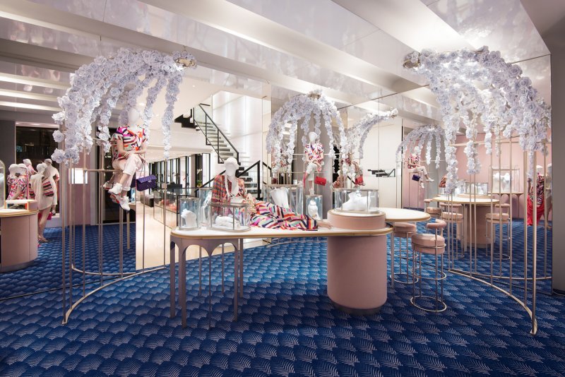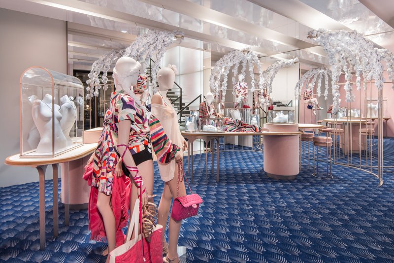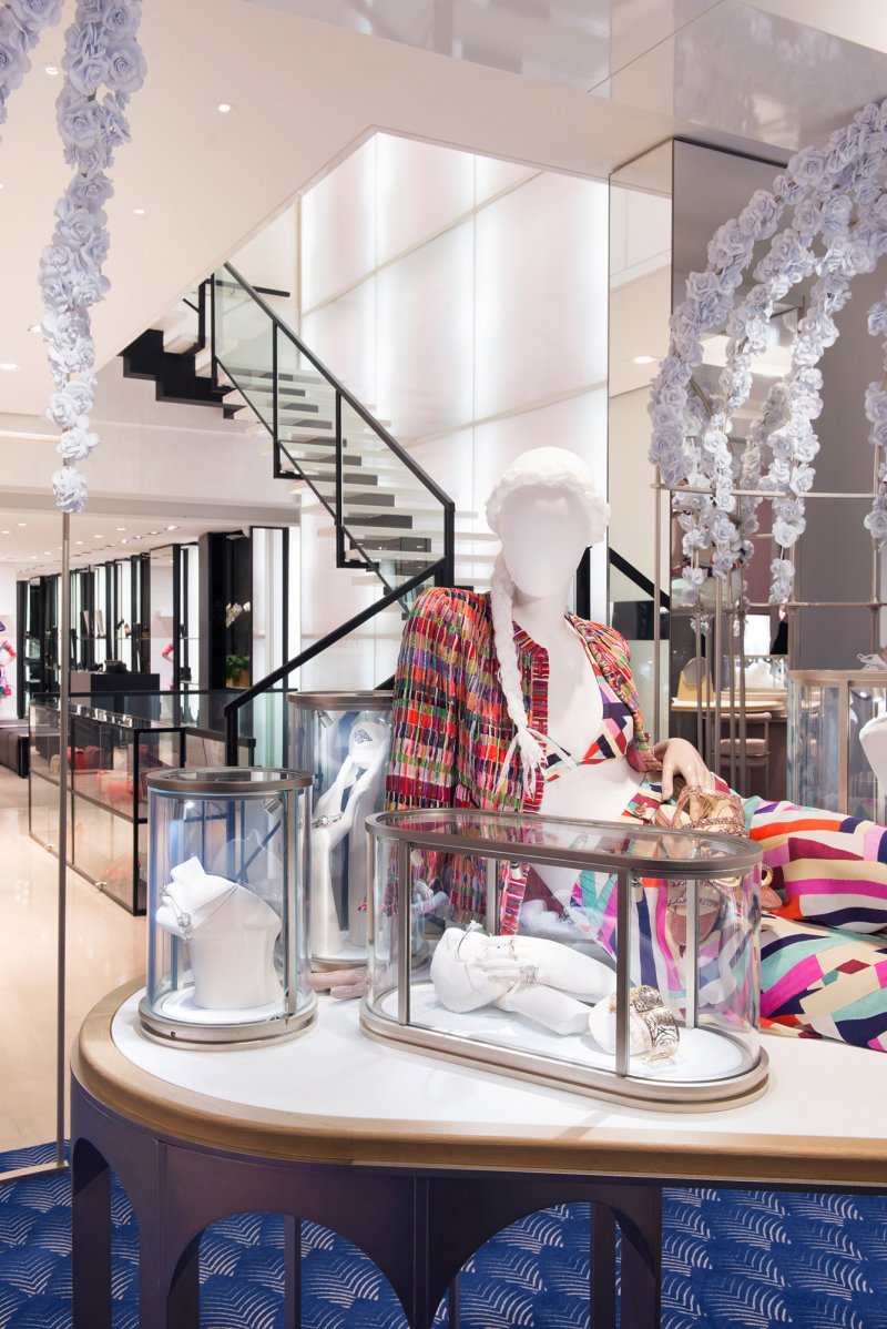 The ground floor morphed into a real jewelry box with satiny pink-painted walls and a floor covered with feather designs, representing a deconstructed bird cage. The visitors enter a world of infinite femininity. White leather camellias, floating mannequins and champagne-hued wood furniture embrace the installation.