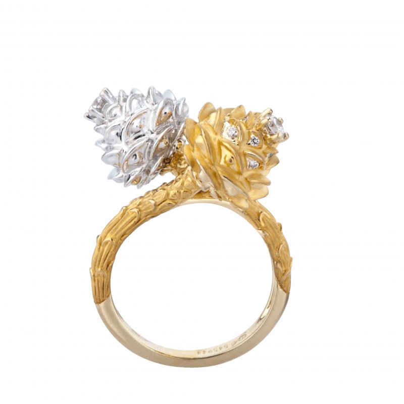 Another ring worth a look is the Moi & Toi [You and Me], crafted in yellow and white gold with its shank evoking the fine details of a branch. Bearing two pineapples as the key motif, the ring pitches the white gold against the yellow to show contrast.