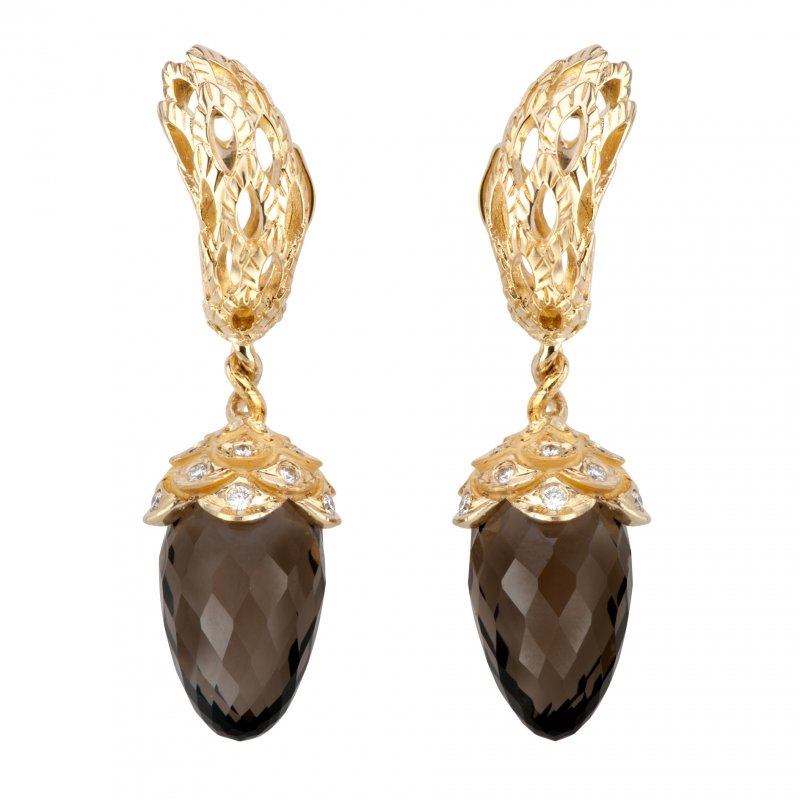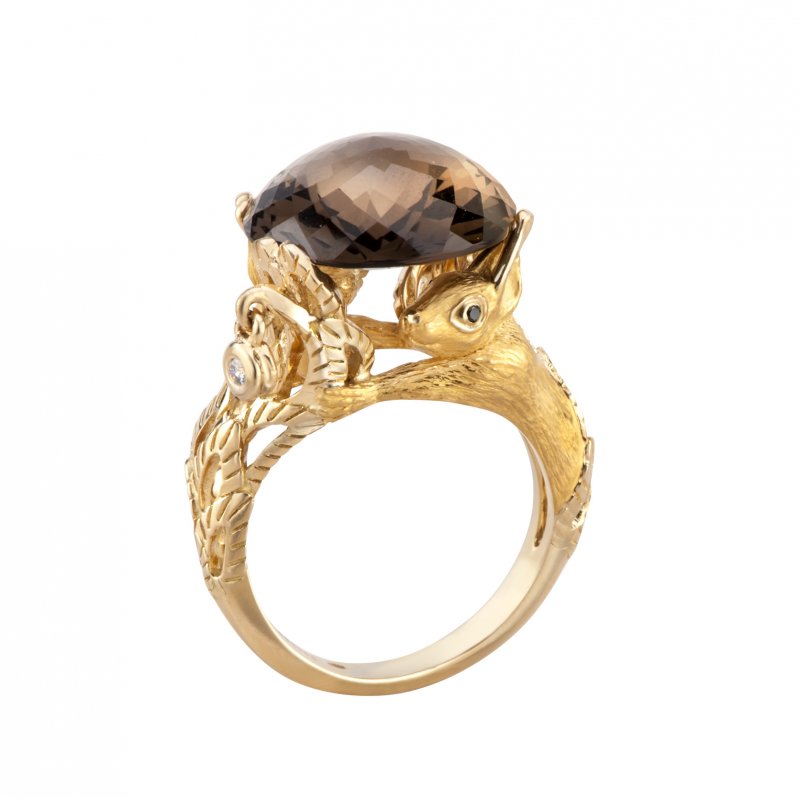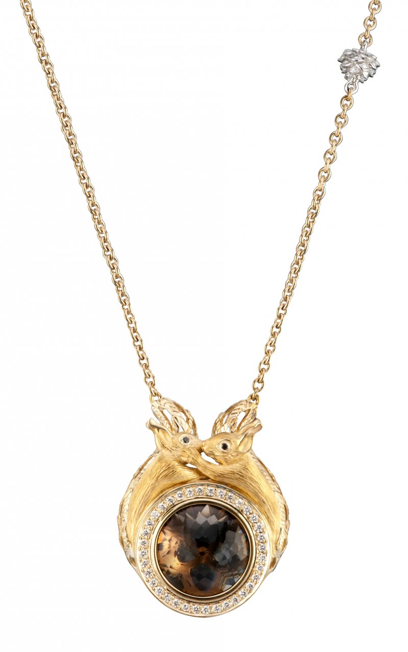 The necklace has two tiny, symmetrical squirrels caressing each other in a warm embrace. The emotion evokes everlasting love, while the ring featuring a squirrel grabbing the tip of the tail is a nod to infinity. Black diamonds set to form the eyes of the squirrel seem to bring it alive, and on its tail and ears is a smoky quartz balanced well. Meticulously carved sculptural details turn these pieces into a work of art.