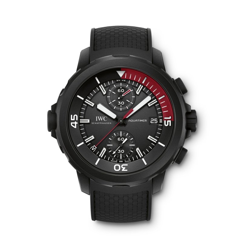 The Aquatimer Chronograph Edition “La Cumbre Volcano” will be produced in a limited edition of 500 pieces. Featuring the 89365-calibre movement manufactured by IWC, this timepiece is water-resistant to 30 bars and its chronograph is supplied with a flyback function, automatic winding and power reserve of 68 hours. The wearer has the ability to set his dive time using the mechanical rotating bezel, while the luminescent-coated hands and numerals guarantee the ultimate legibility underwater. This watch is dedicated to La Cumbre volcano on the island of Fernandina, as the case back shows the volcano erupting. Coated in matte black rubber, the stainless-steel case gives this watch a unique feel.
