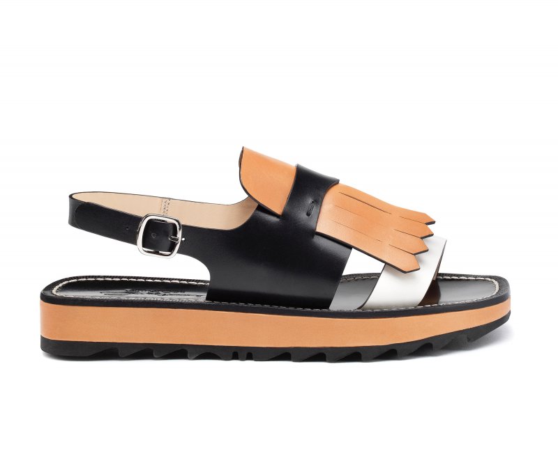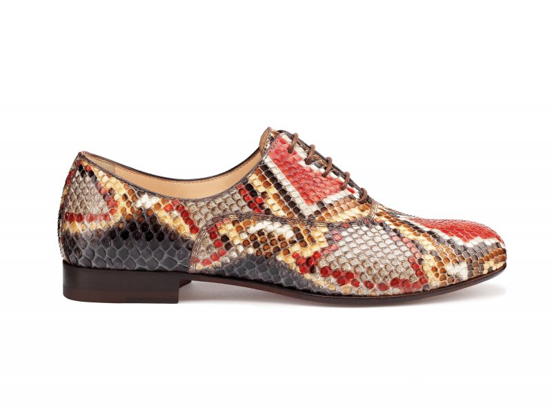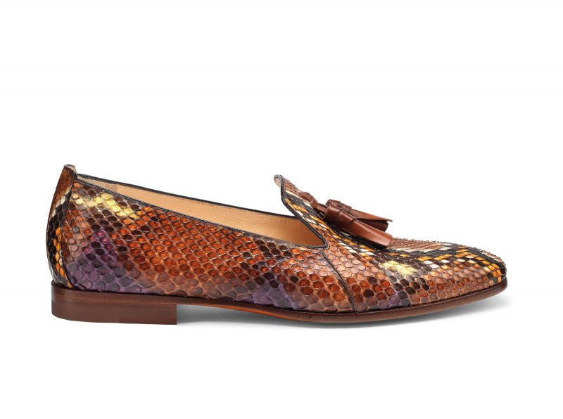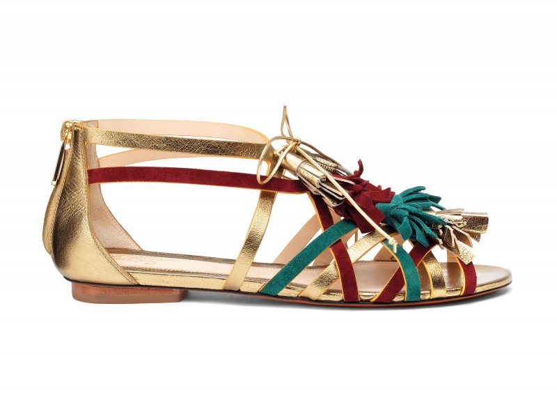 The collection is primarily inspired from a 1970’s trance, bringing together the bohemian side and the uptown elegance. The uniqueness of this collection lies in the exclusive craftsmanship, handmade pride and use of exceptional materials. The result? Timelessly chic shoes playfully hopping from masculine to feminine. The shoes revel in an eccentric aura depicted through block heel sandals, bold platforms elongating the silhouette and double buckles in slippers and flat sandals. Metallic flashes in flat lace-ups from here and weavings, fringes and nappa leathers from there; it’s all an eclectic melting pot of moods. While miniature threading cover the embroidered heels, colorful pythons balance out the masculine flat shoes and precious crystal appliqués on luxurious satin create a sophisticated movement. A rich palette ranging from tones of brown and green to cream and pastel is combined to a set of intensely refined materials such as calfskin, crocodile, python and satin.