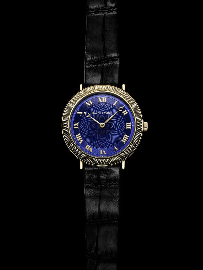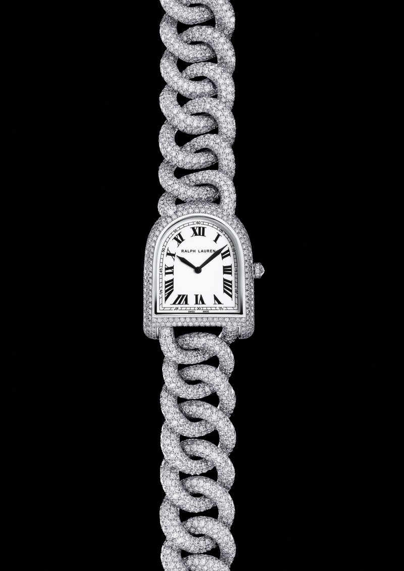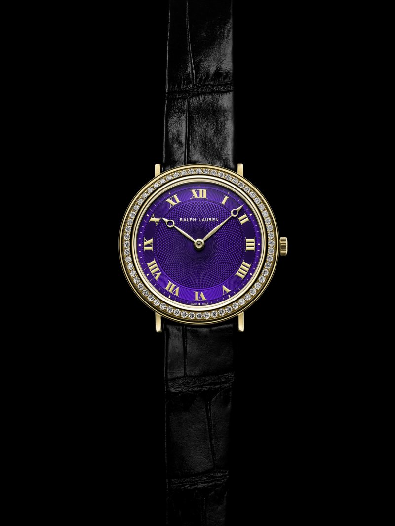 Inspired by the riding stirrup, the Stirrup Petite-Link watch comes in simple stainless steel version or entirely set with diamonds like a sugar-coated piece. Ralph Lauren’s timepieces also include a long-time classic, the Slim Classique, which comes with a rose-gold bezel available with or without diamond-setting. This season, the watch is also made available in versions featuring a blue or purple dial.