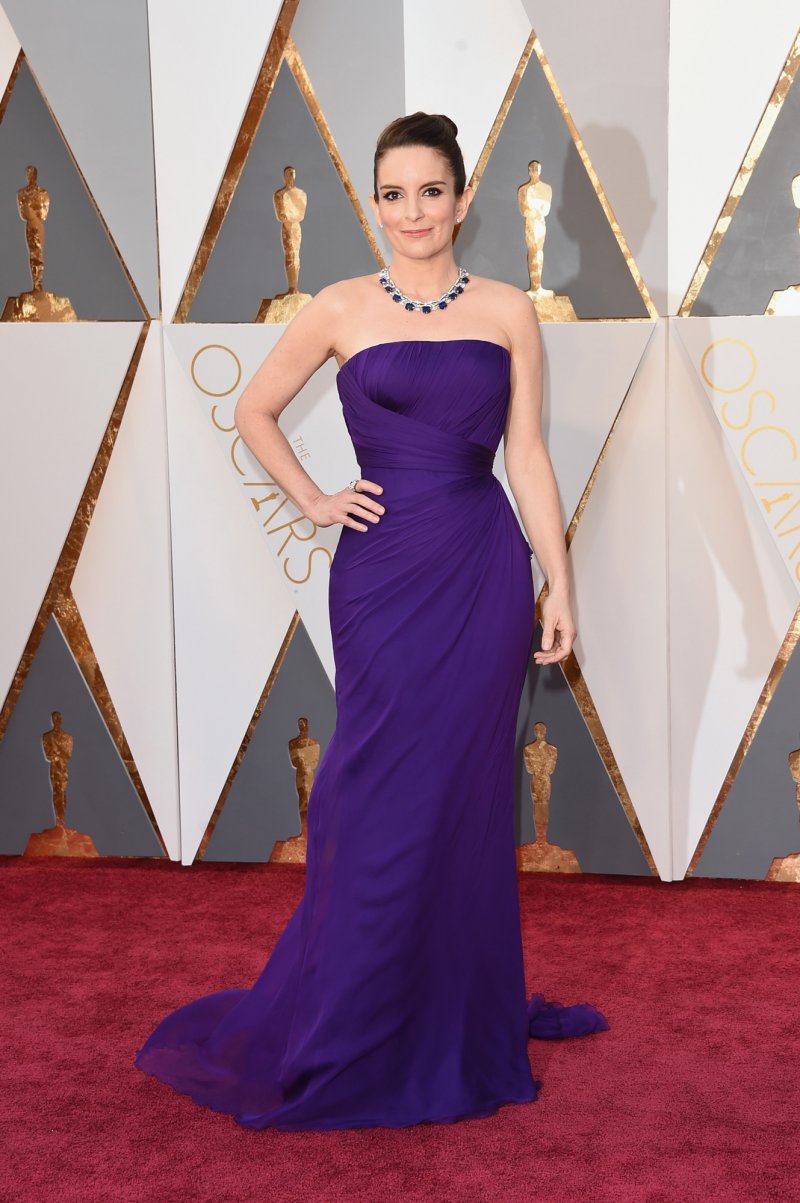 Tina Fey dazzled in a deep purple custom-made silk chiffon Atelier Versace gown