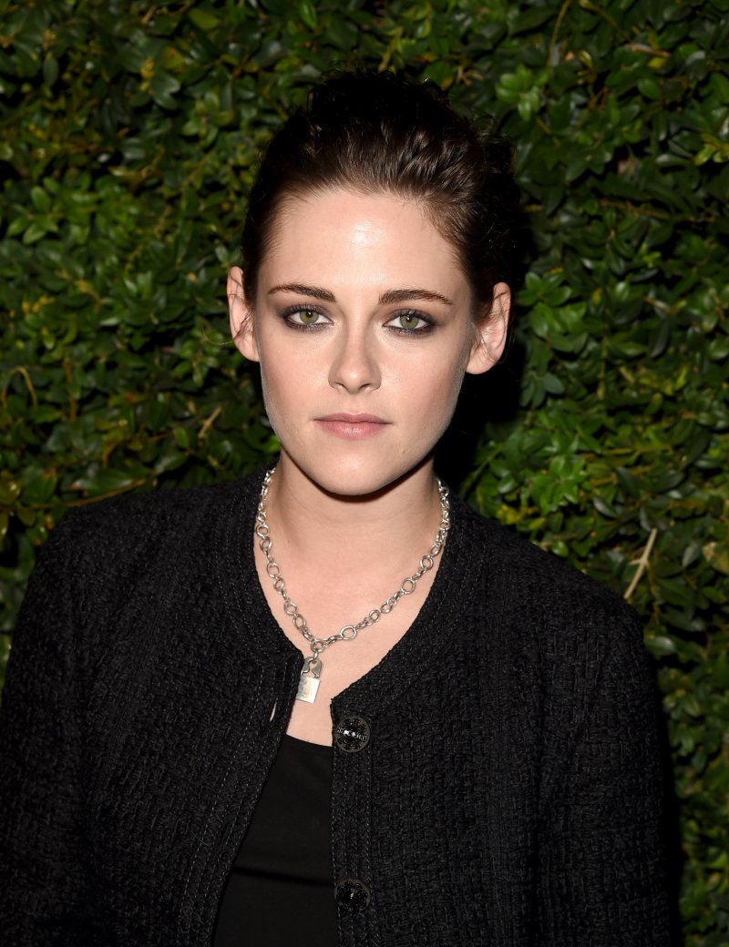 Kristen Stewart, Chanel’s Ambassador, wore white and grey lace pants from the Chanel Paris-Rome collection to the Pre-Oscars Dinner