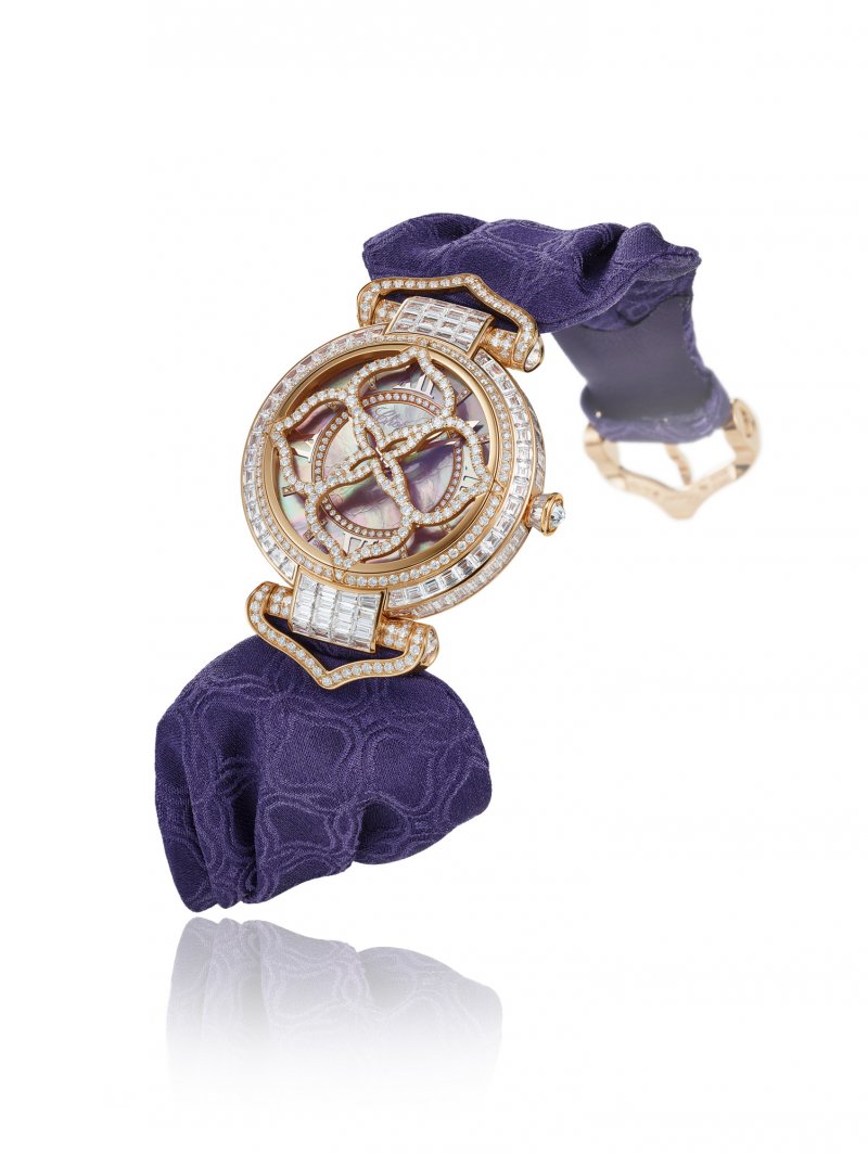 The iconic “Imperial” motif underwent a makeover to satisfy her contemporary needs. On the watch, the pattern is paired with diamonds that find their place on the watch crystal as if they were embracing the grained mother-of-pearl dial, while baguette diamonds adorn the case. Pleated purple damask fabric embroidered with this emblematic motif forms the timepiece’s strap, making it more unique than ever.