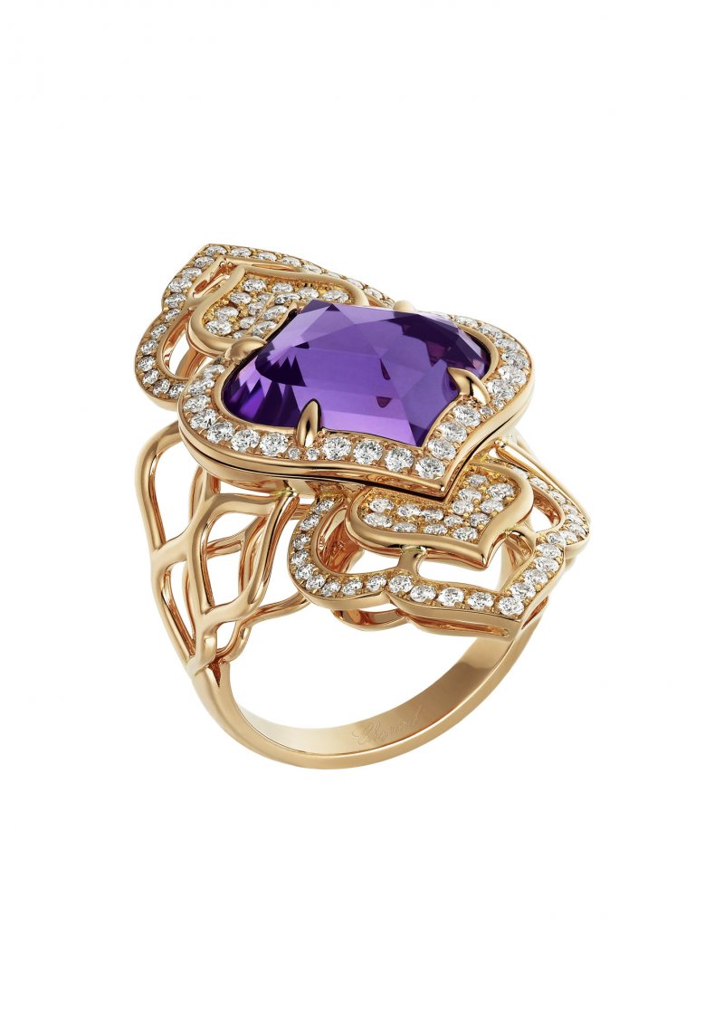 Majestic and contemporary, this jewelry line also features a pair of earrings, a ring, a necklace and a tiara to complete the ideal look of an empress. Made of rose gold, these pieces are also adorned with diamonds and amethysts.